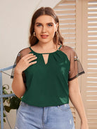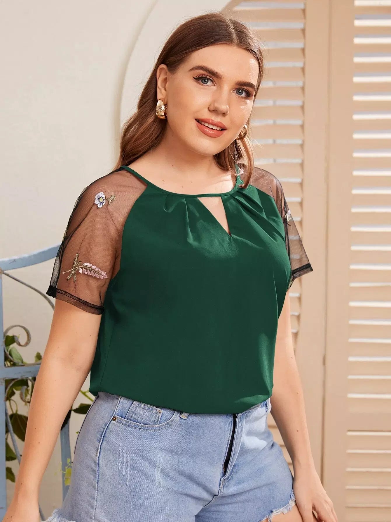 بلوزة برقبة بفتحة عنق زائد وتطريز شبكي بفتحة عنق زائد