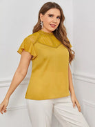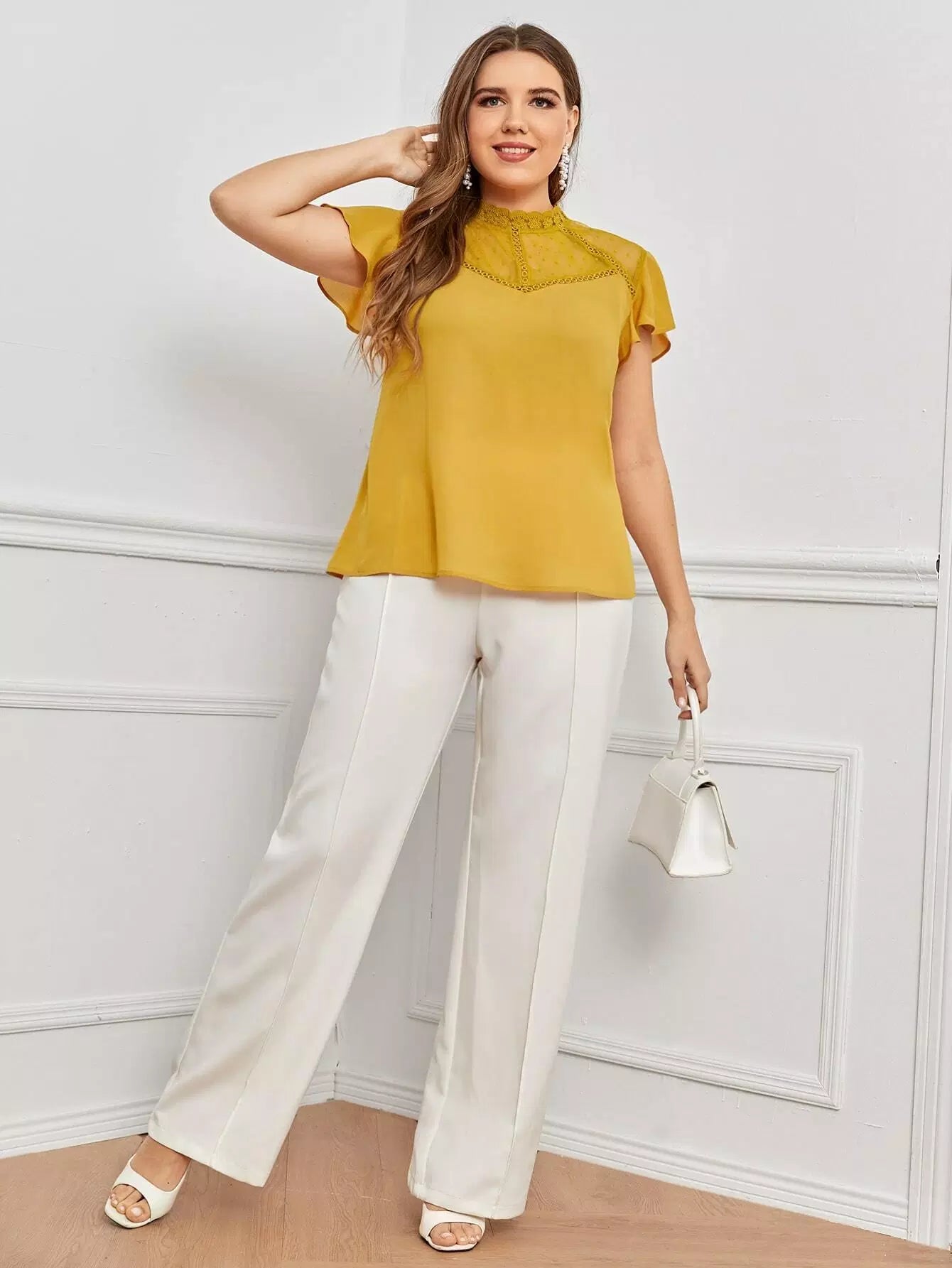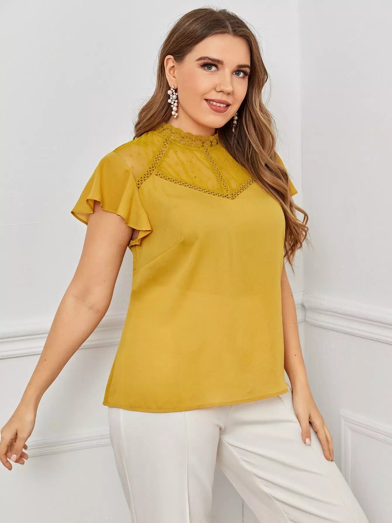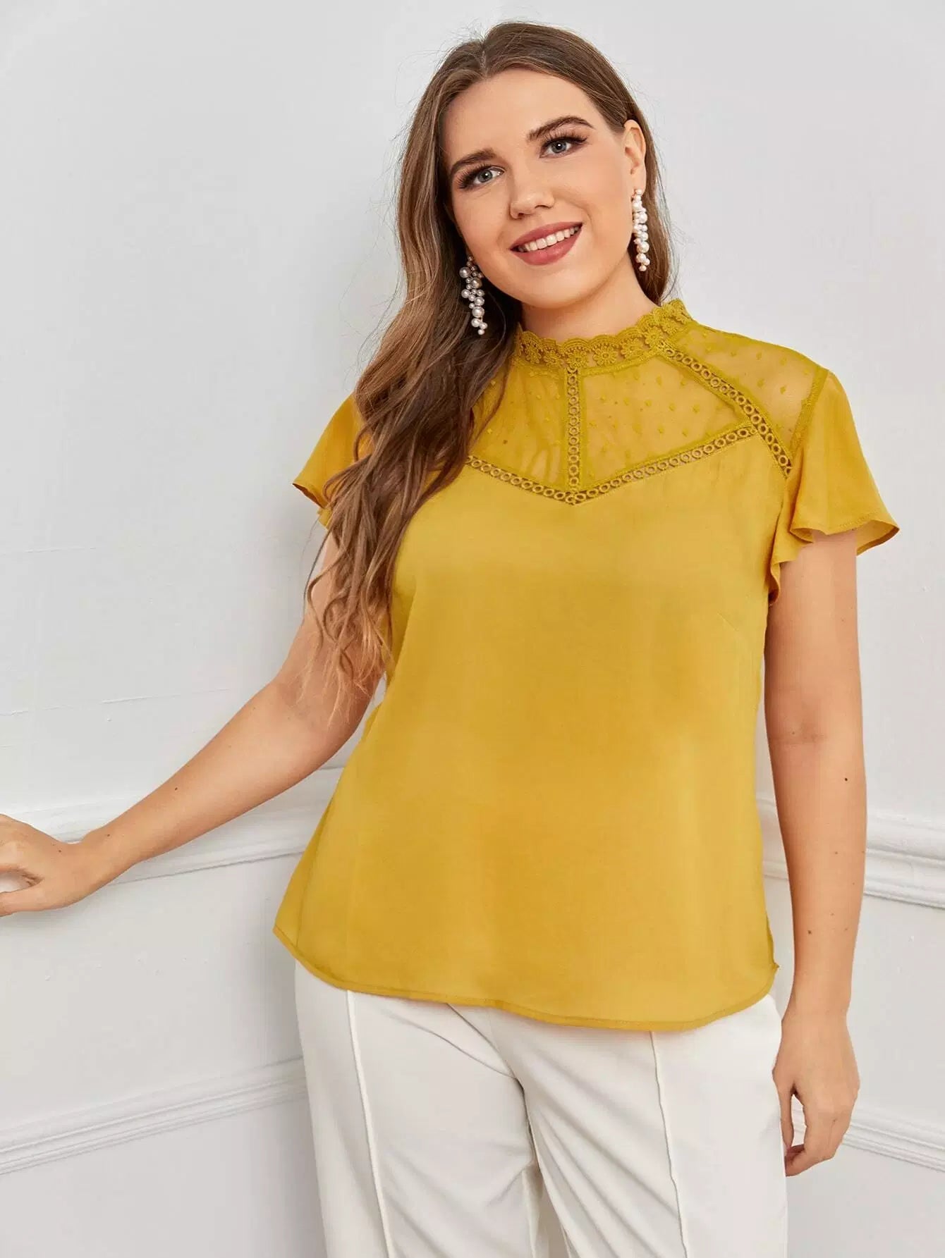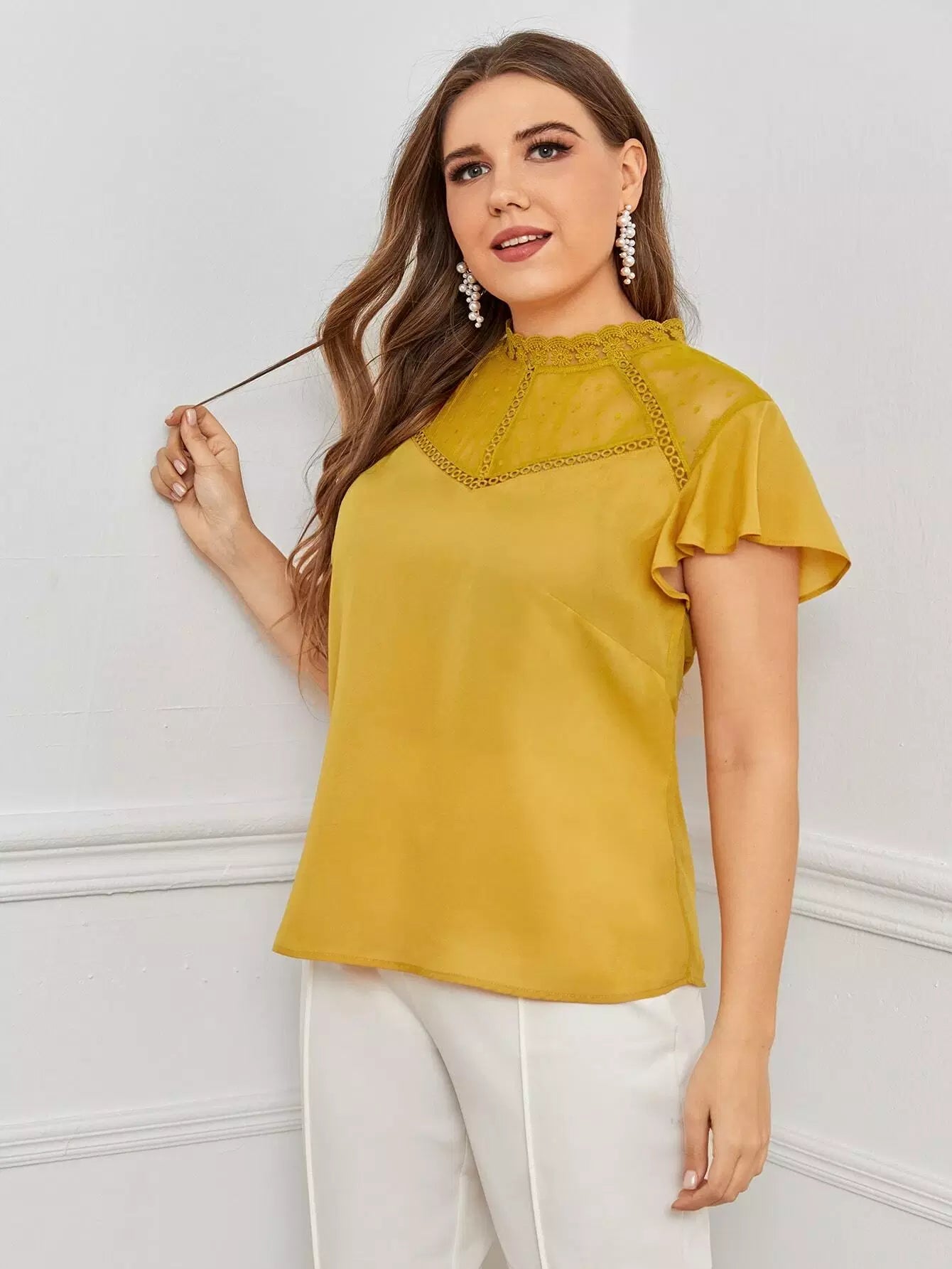 بلوزة دانتيل برقبة من الدانتيل بلوزة شبكية دوبيه بلون مغاير