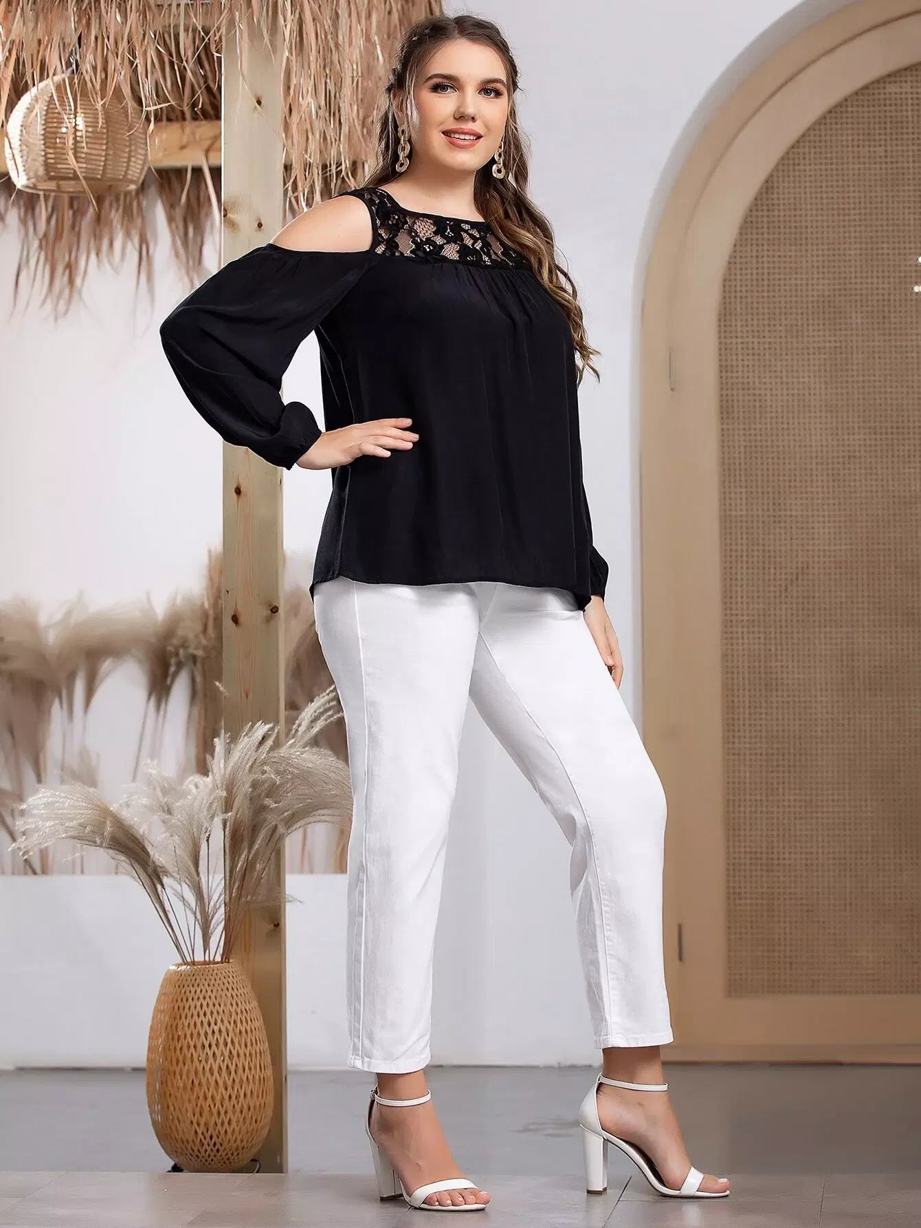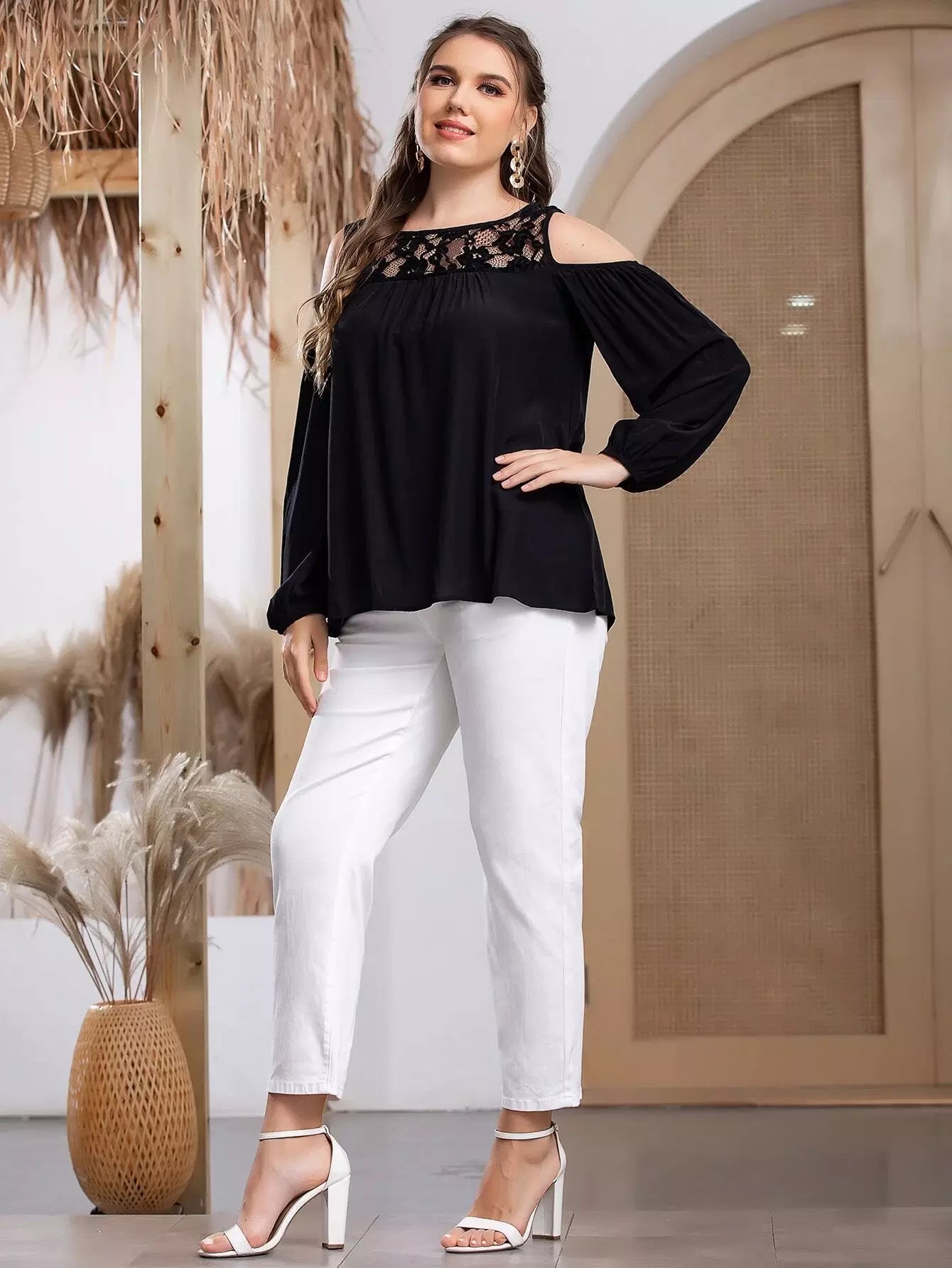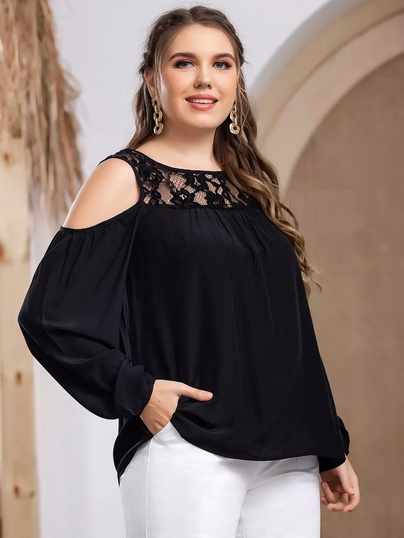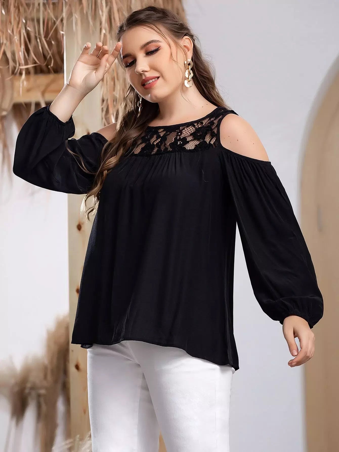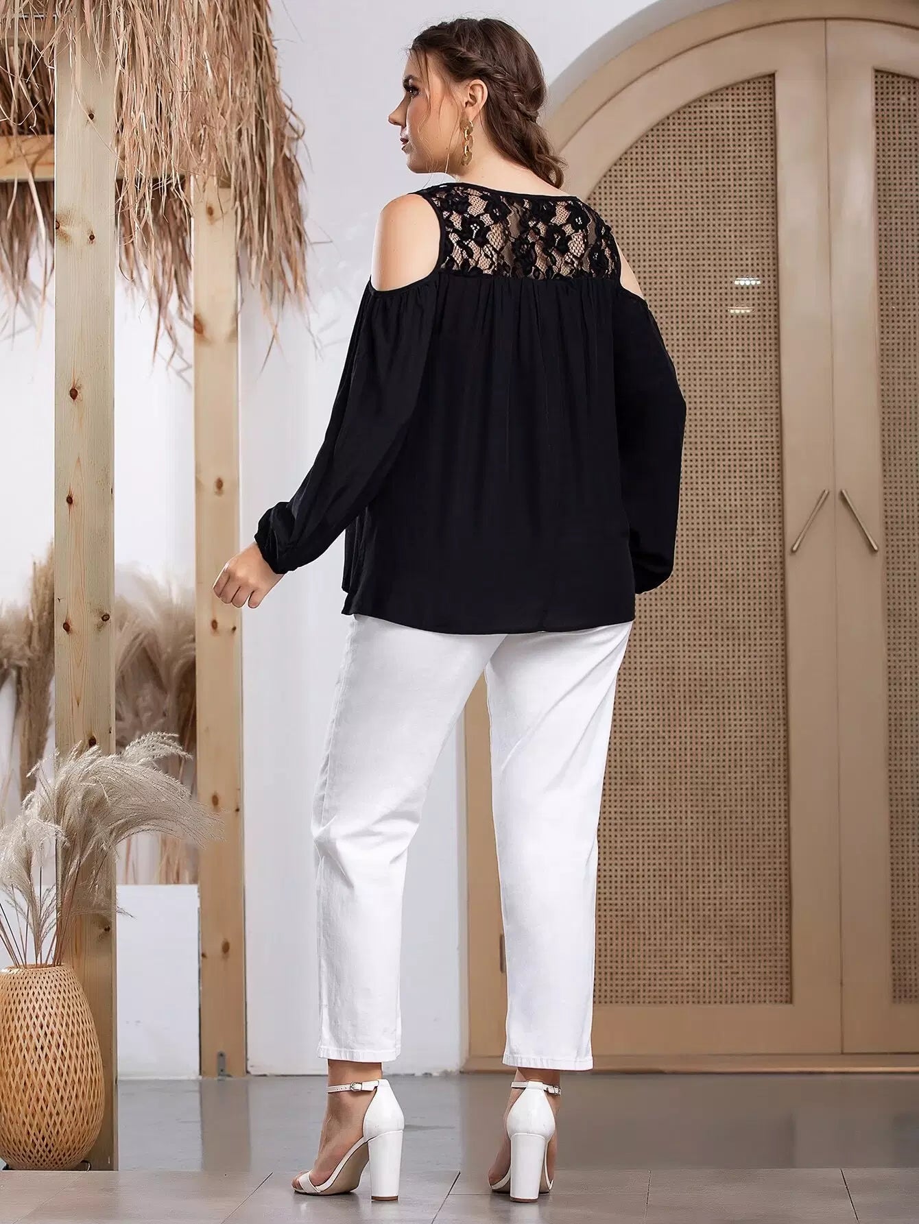 بلوزة بأكتاف باردة من الدانتيل بنقوش على الأكتاف باردة