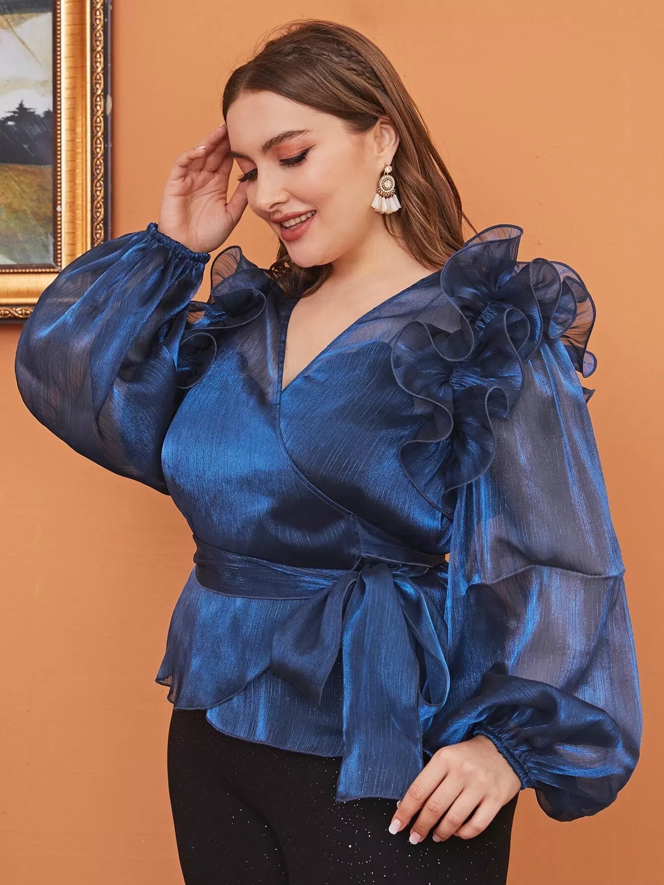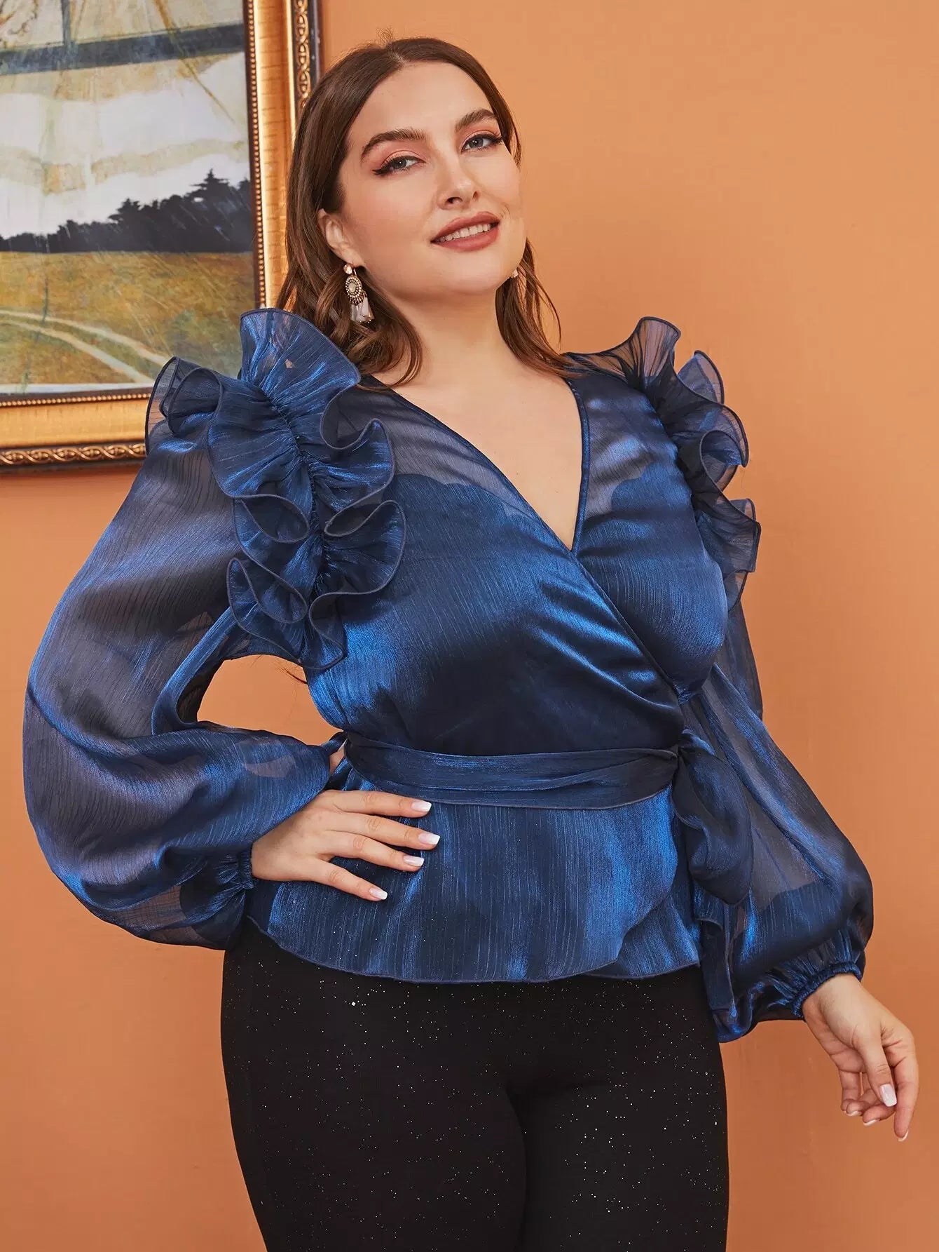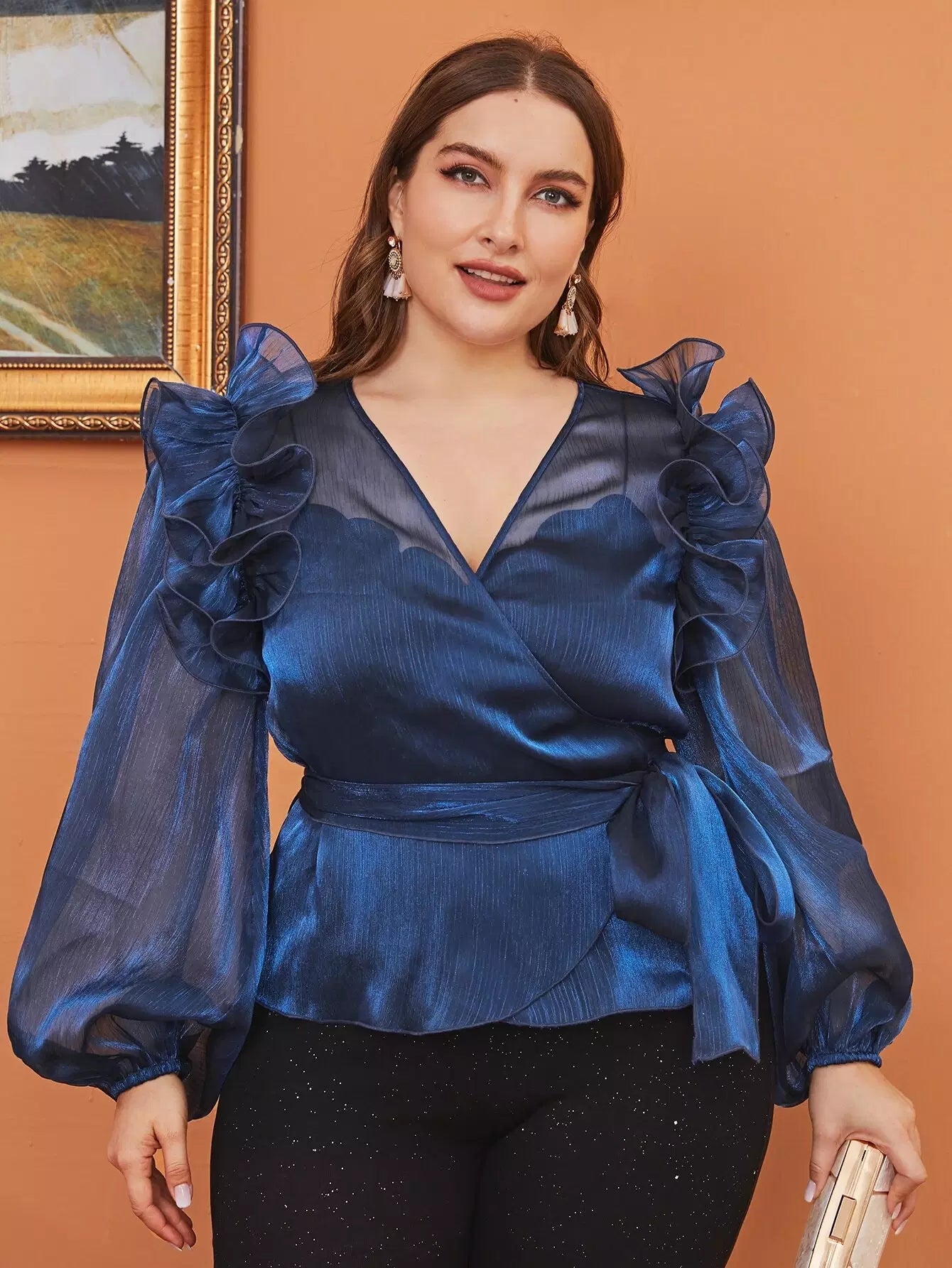 بالإضافة إلى بلوزة شفافة بأكمام واسعة وتفاصيل كشكش بدون حزام