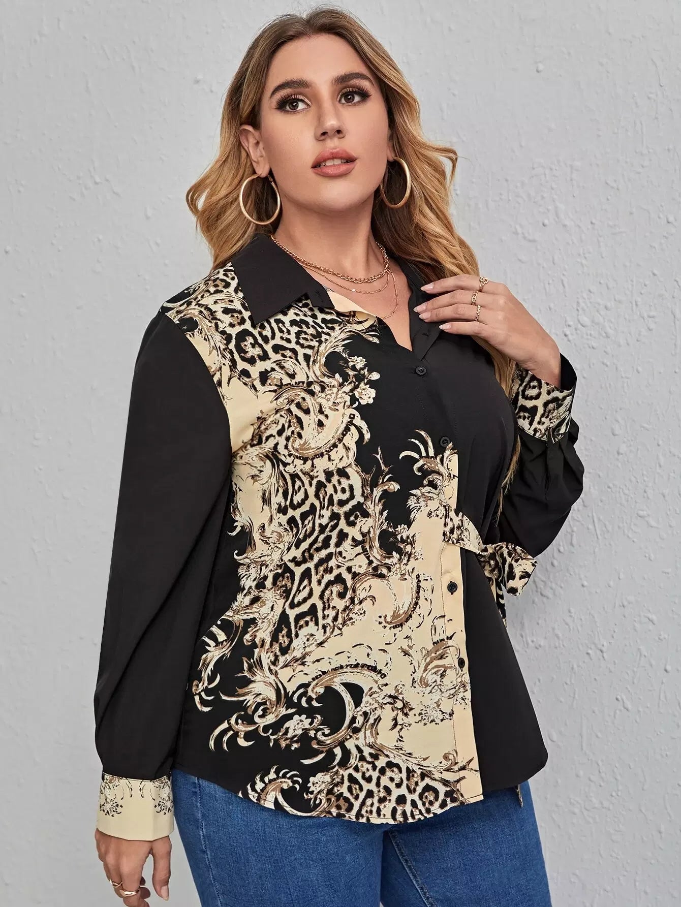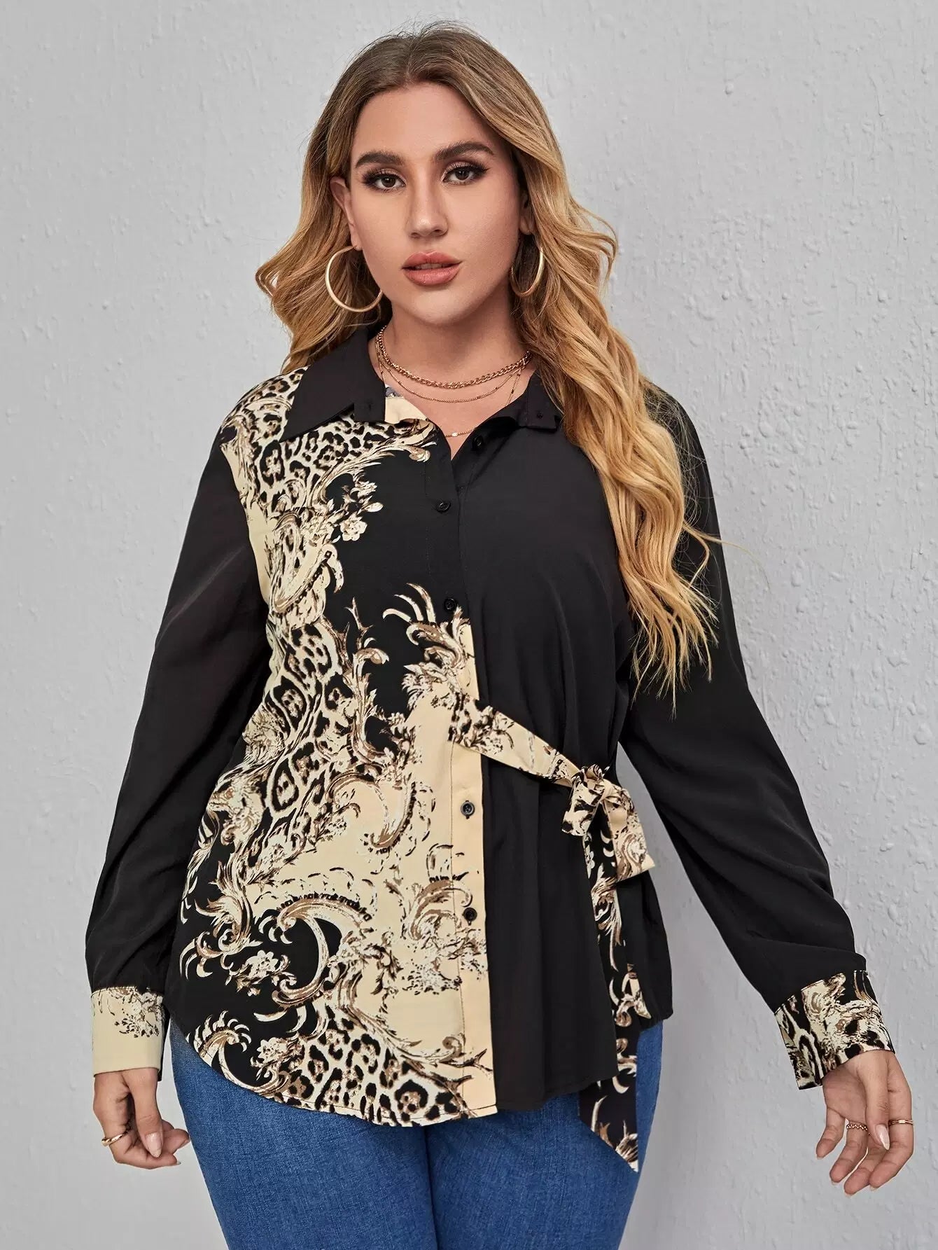 قميص بنقشة جلد الفهد مطبوع عليه ربطة عنق جانبية