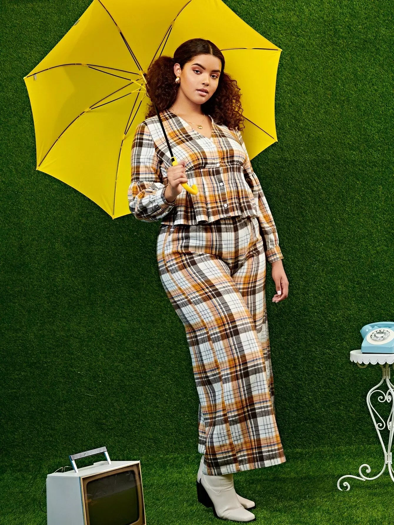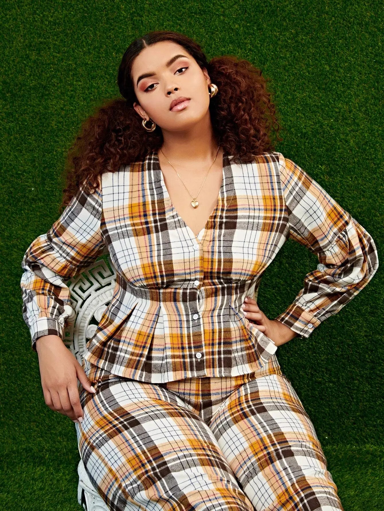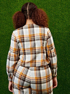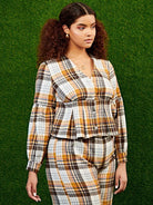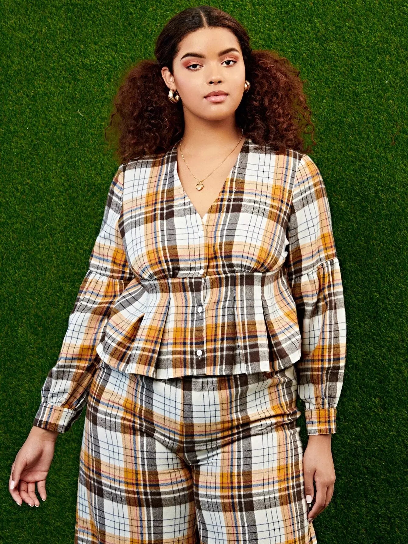 بلوزة بطبعة منقوشة بأزرار أمامية مكشكشة منقوشة بأزرار زائد
