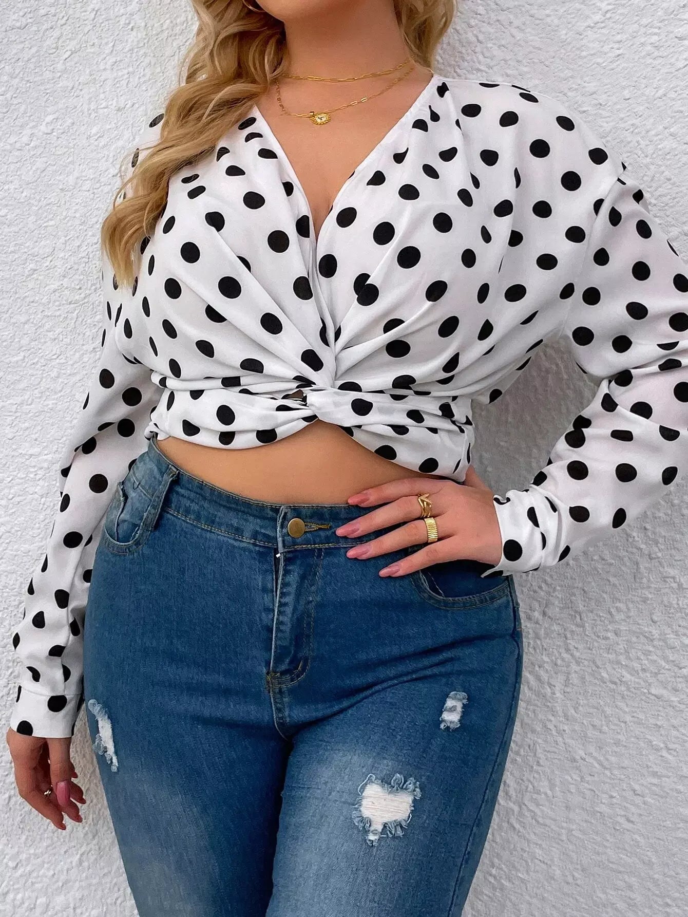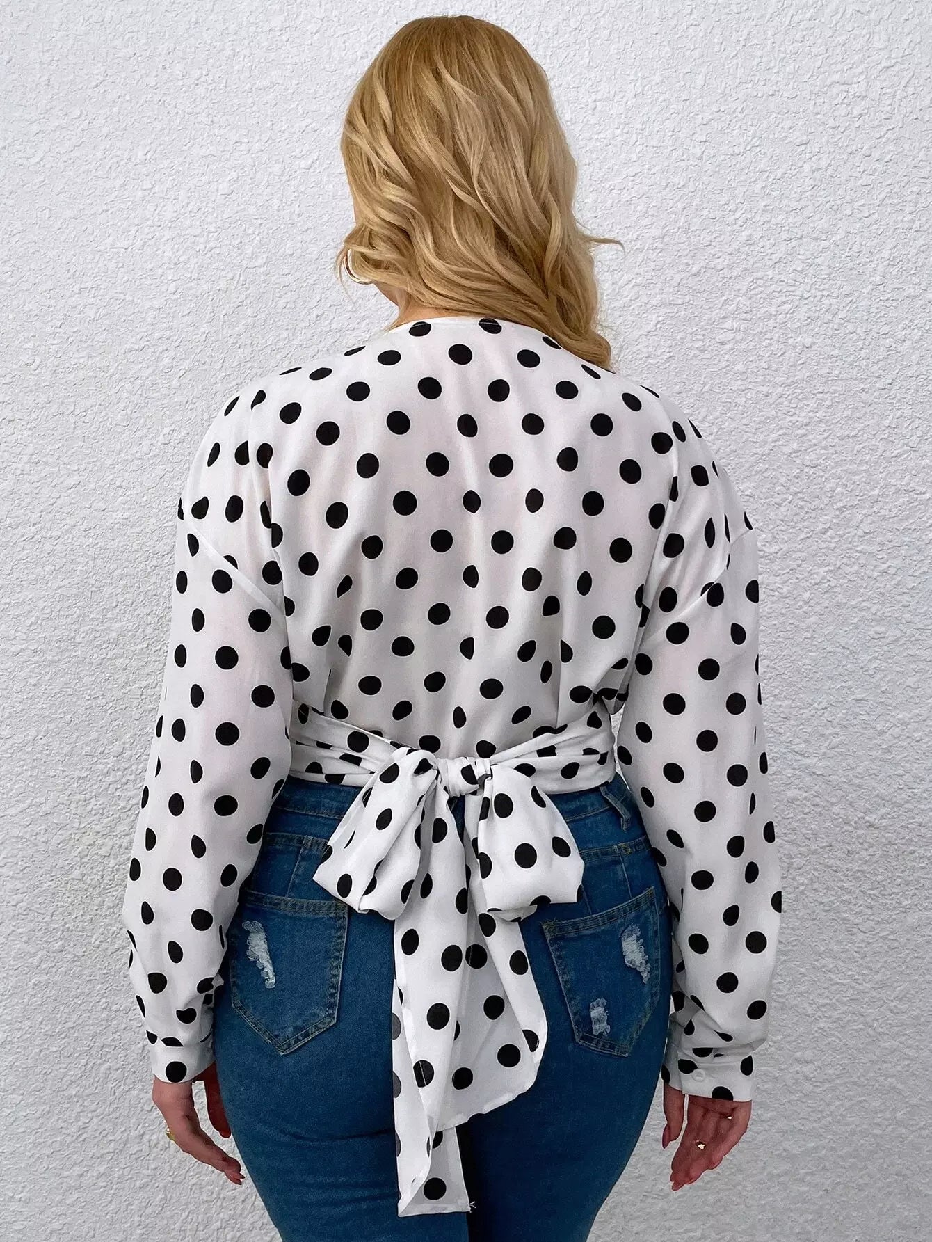 بلوزة قصيرة منسدلة الأكتاف بطبعة منقطة منسدلة من الأمام بربطة عنق من الخلف