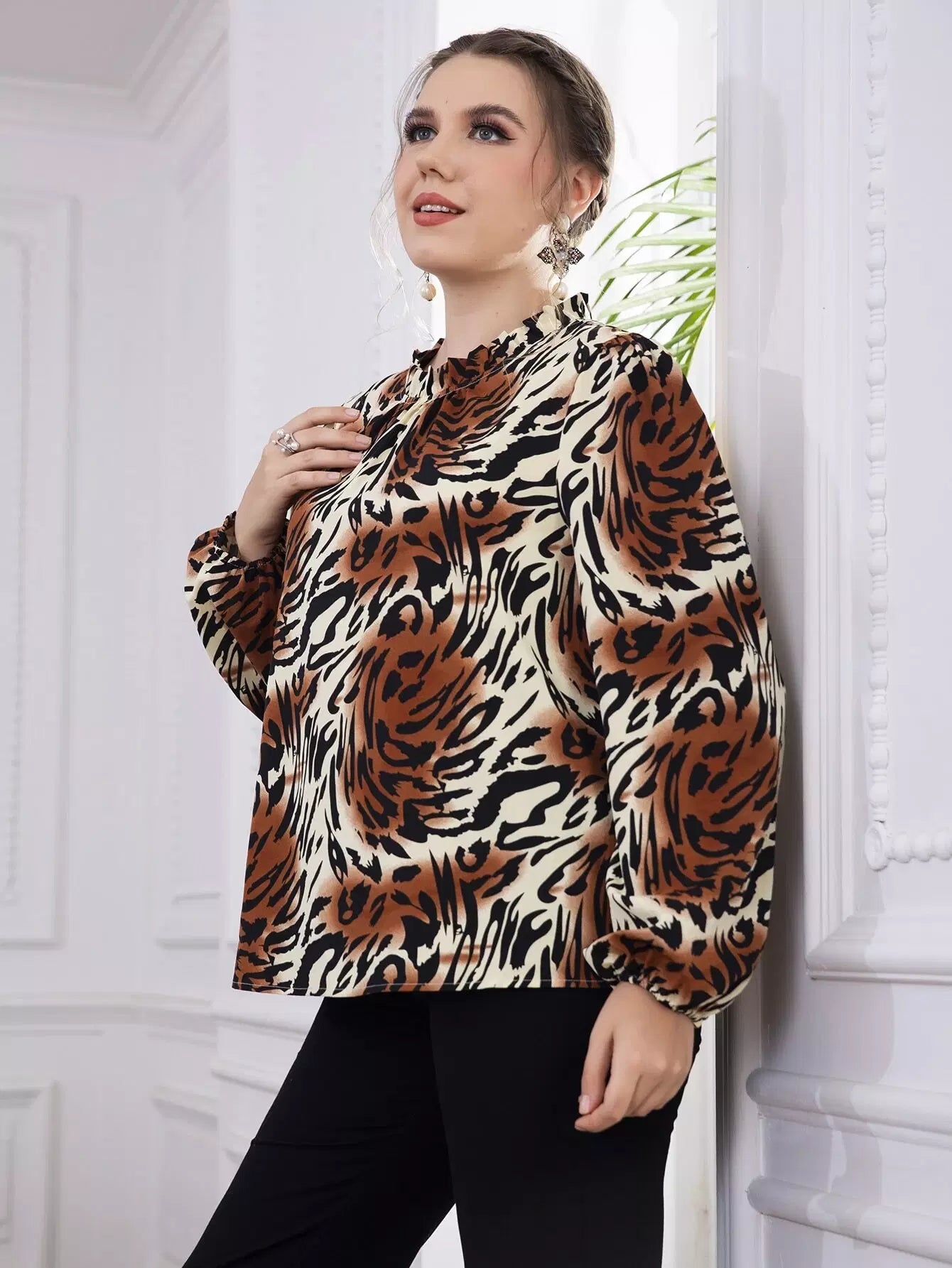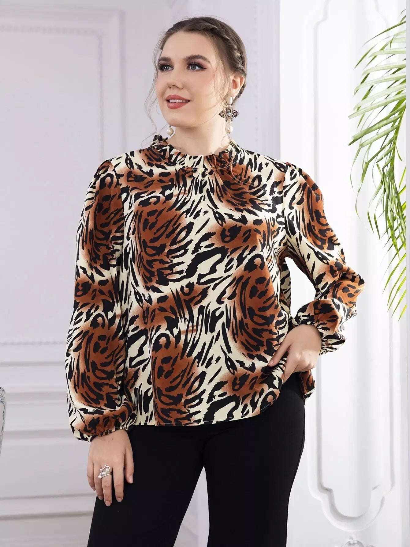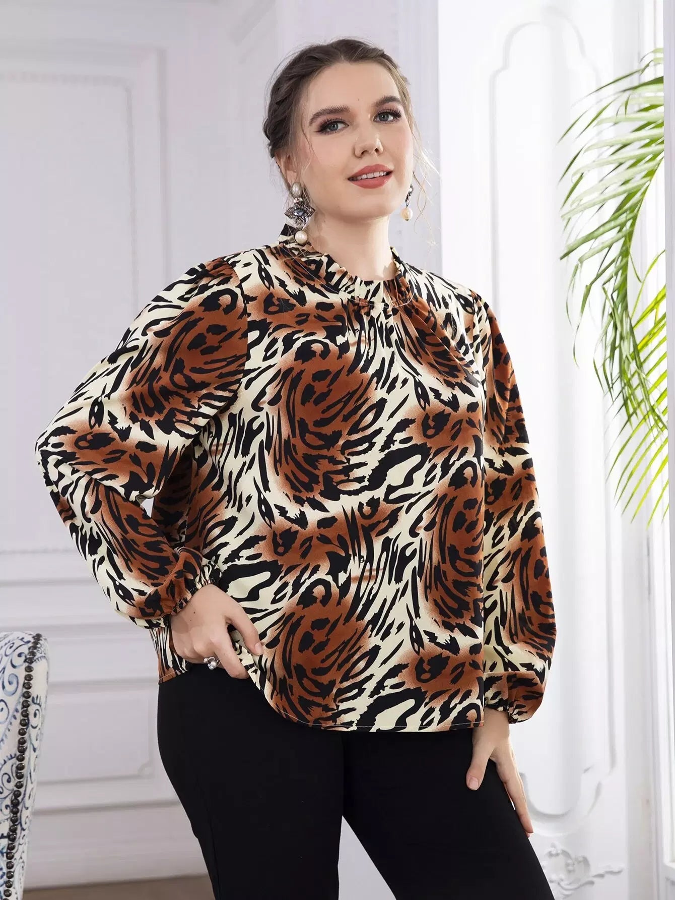 بلوزة مكشكشة برقبة مكشكشة بطبعة جلد النمر