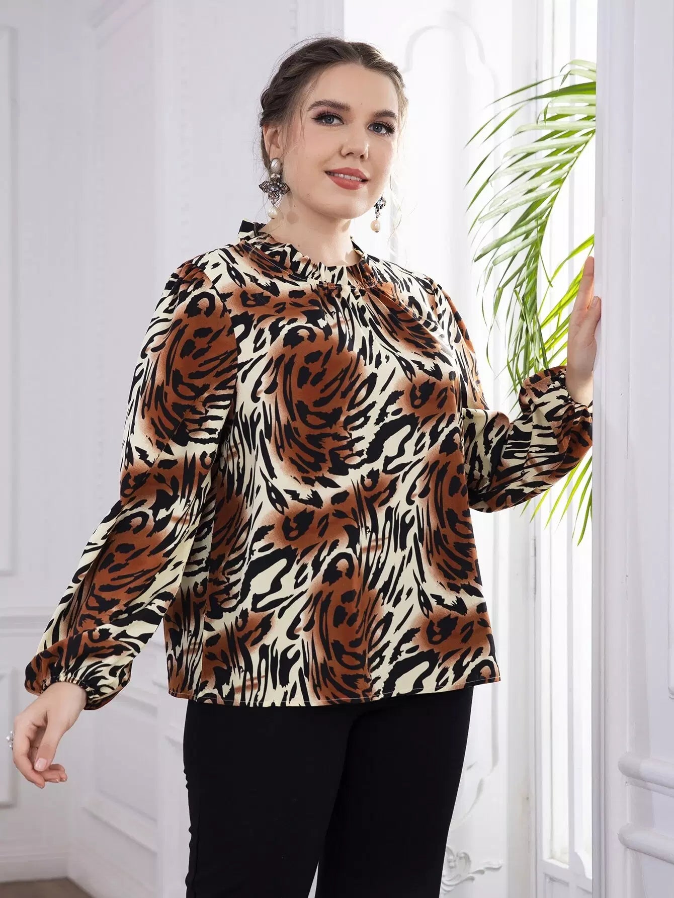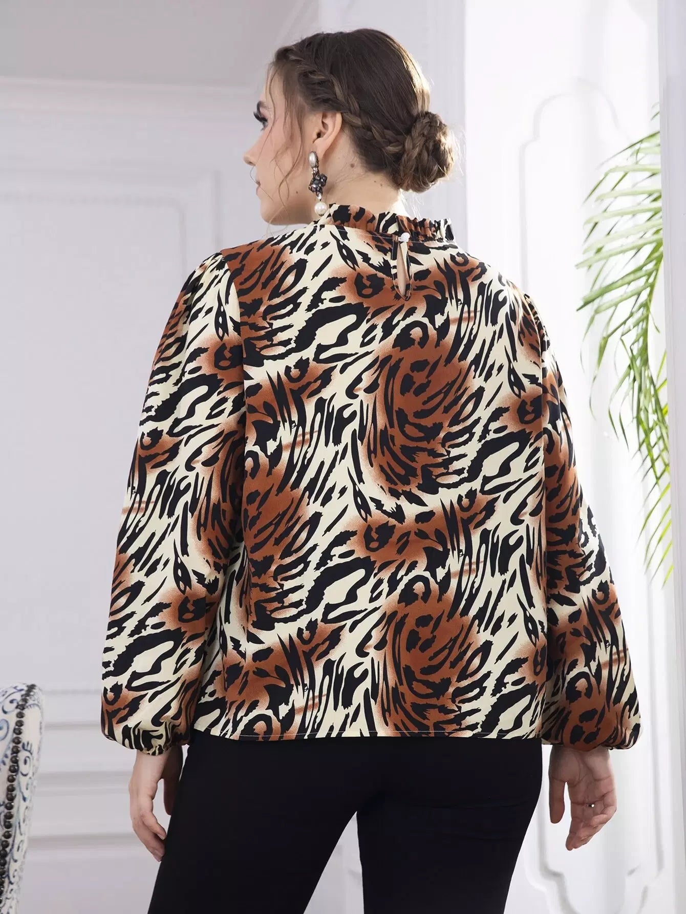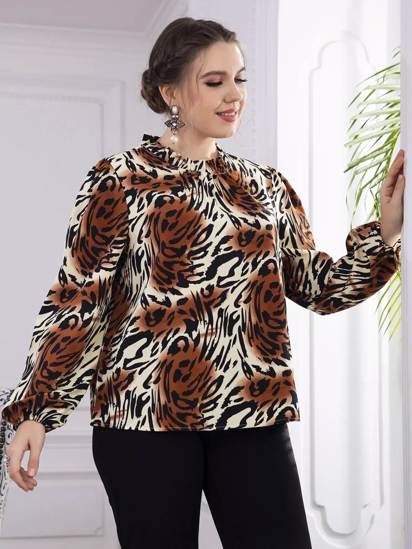 بلوزة مكشكشة برقبة مكشكشة بطبعة جلد النمر