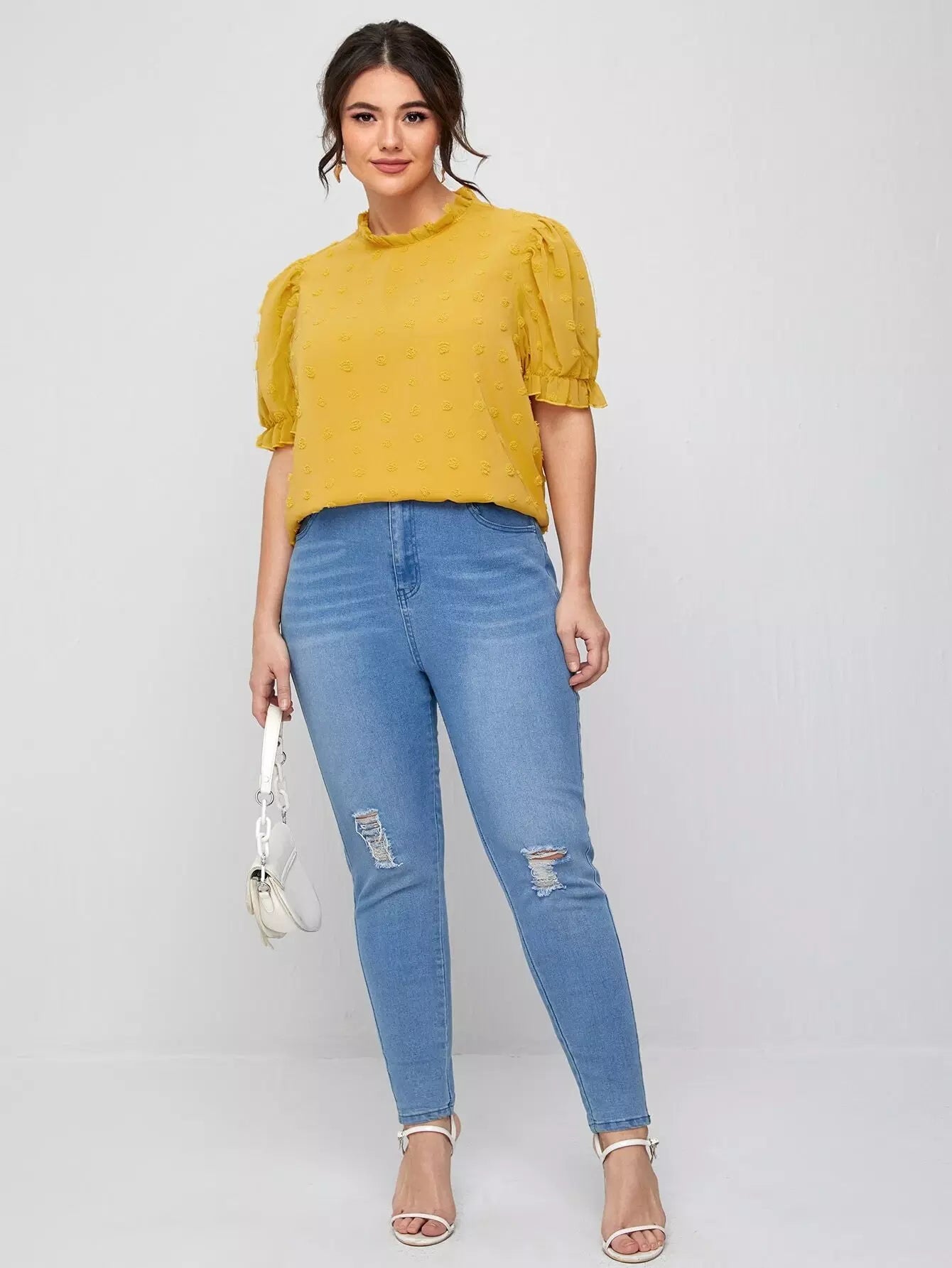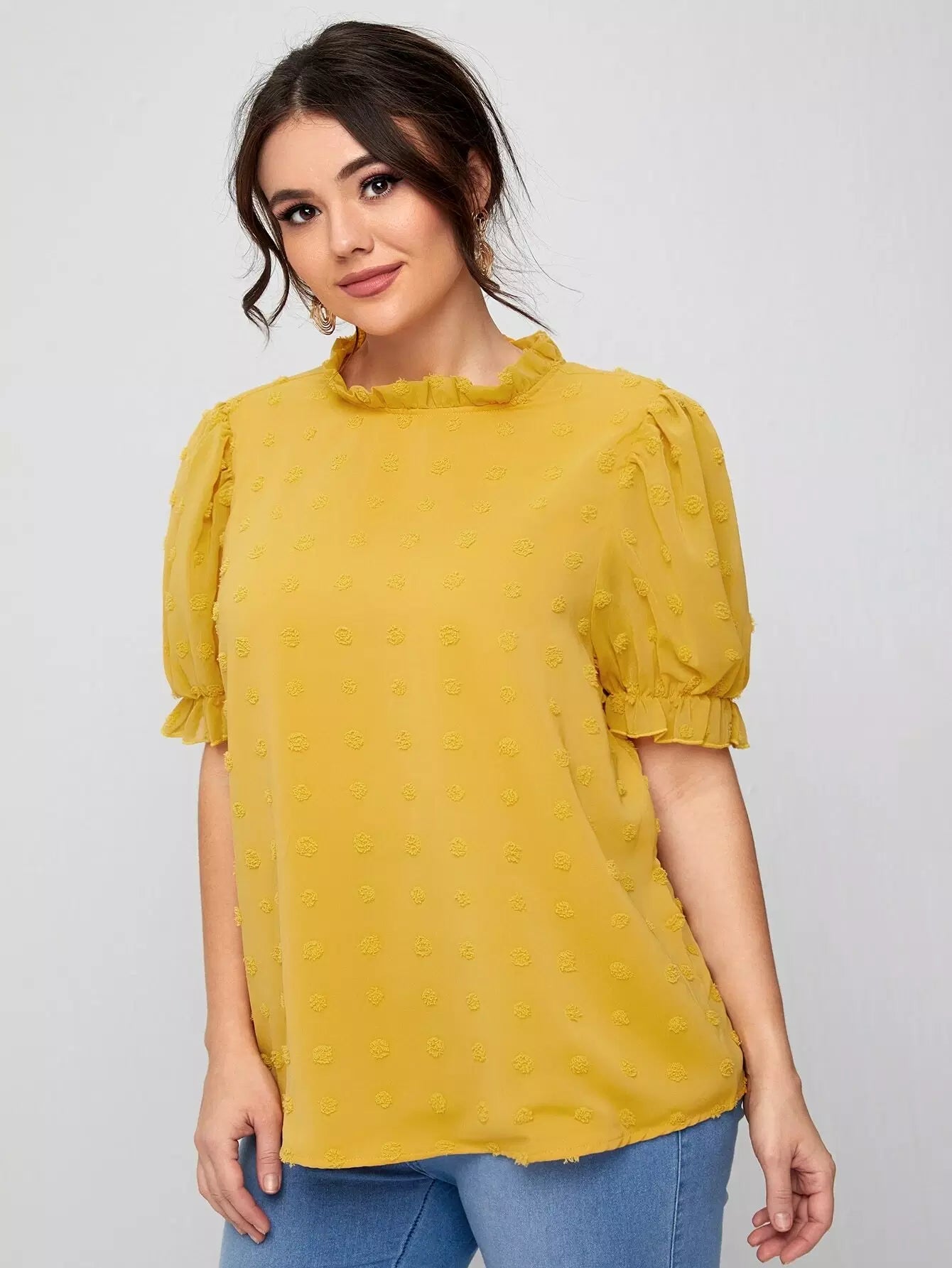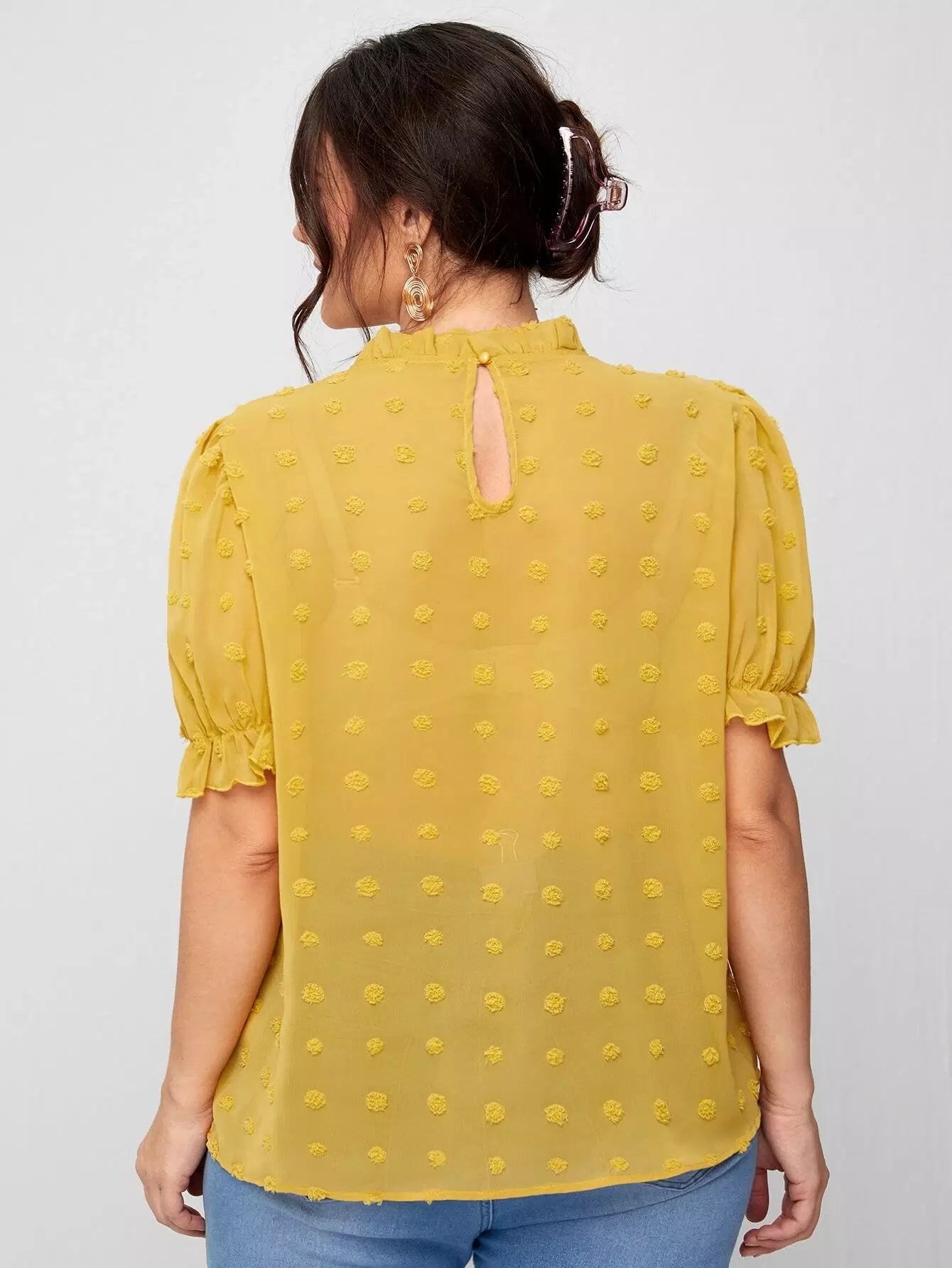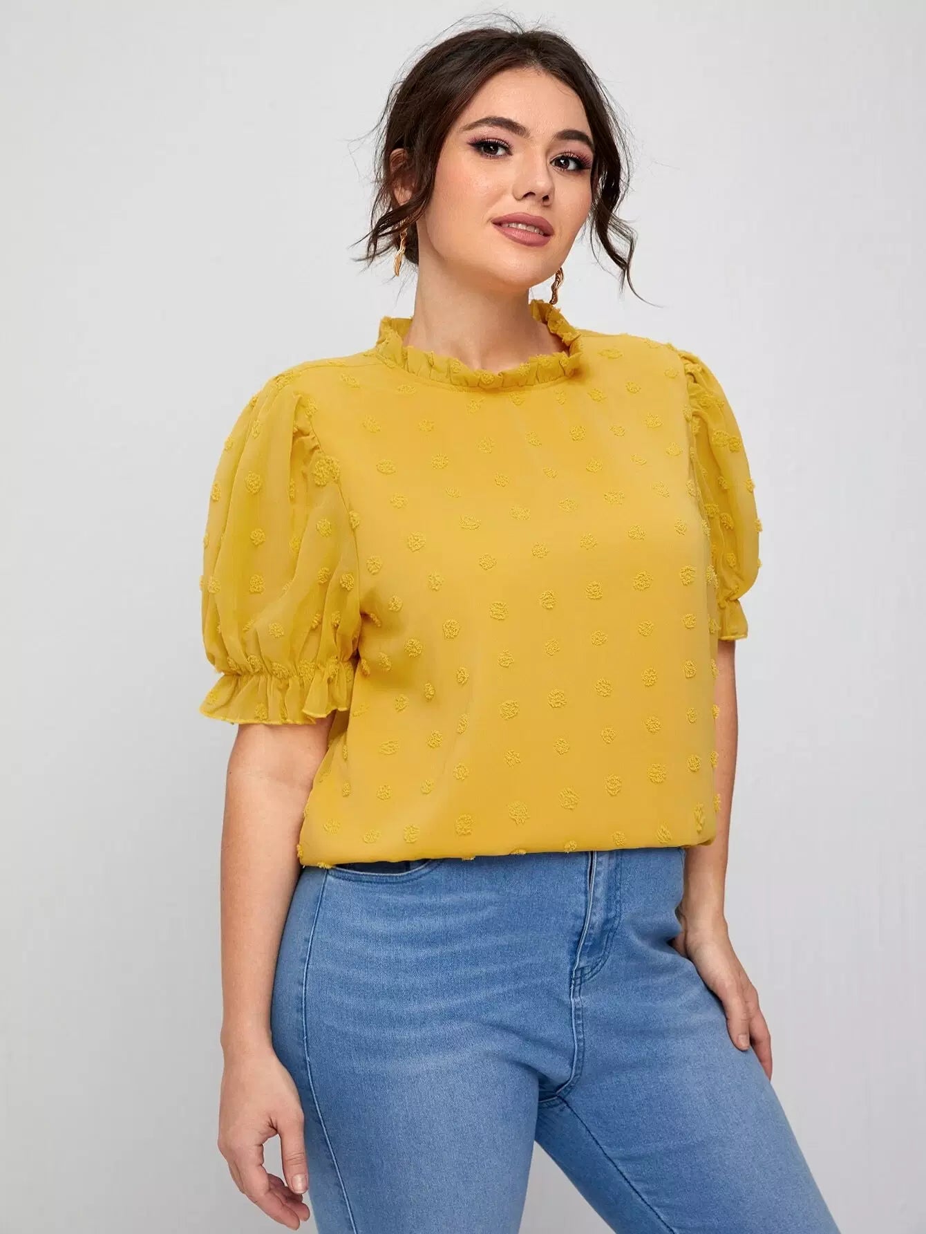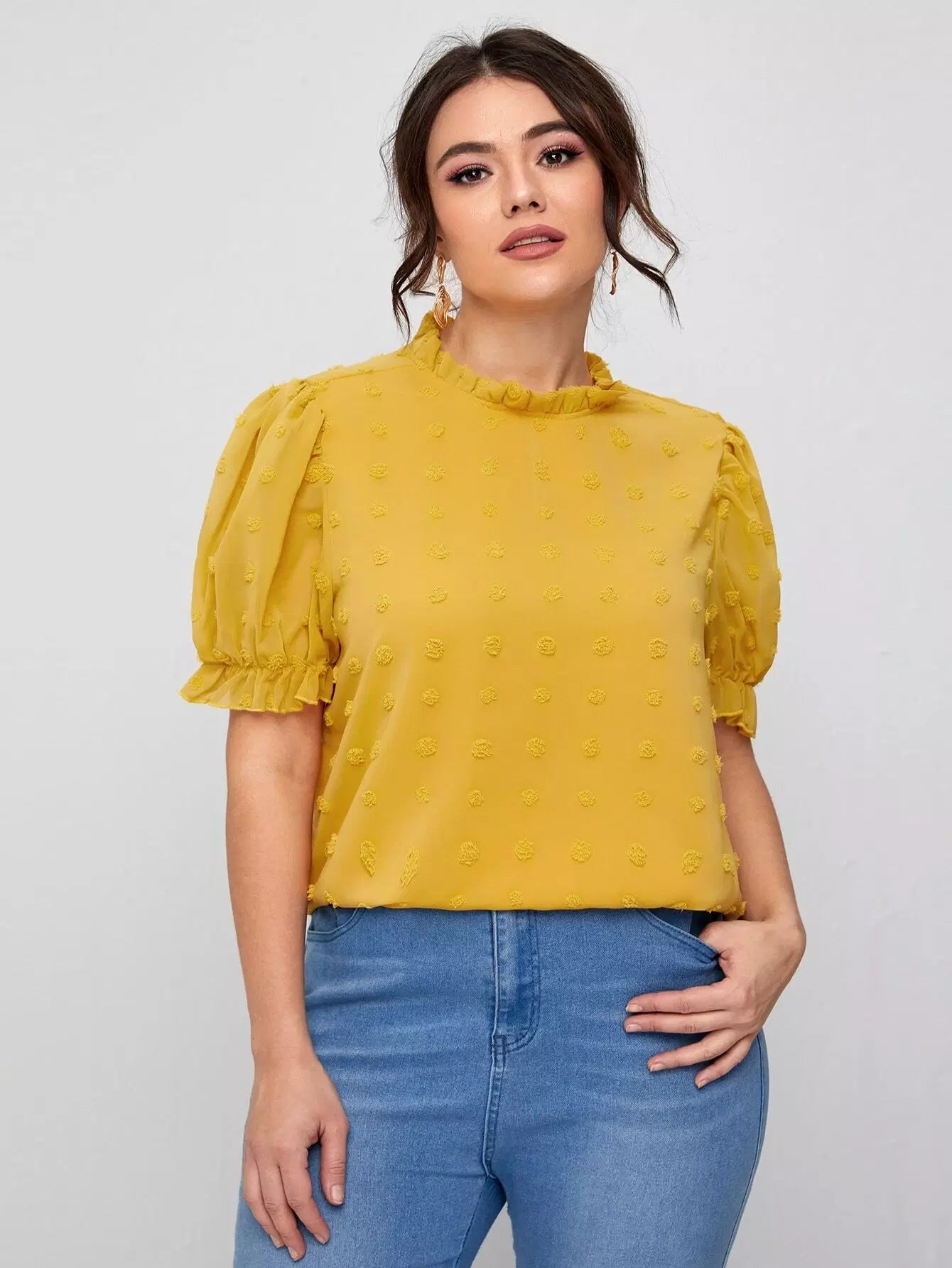 بلوزة بأكمام كشكش منفوشة بأكمام منفوشة زينة برقبة زائد