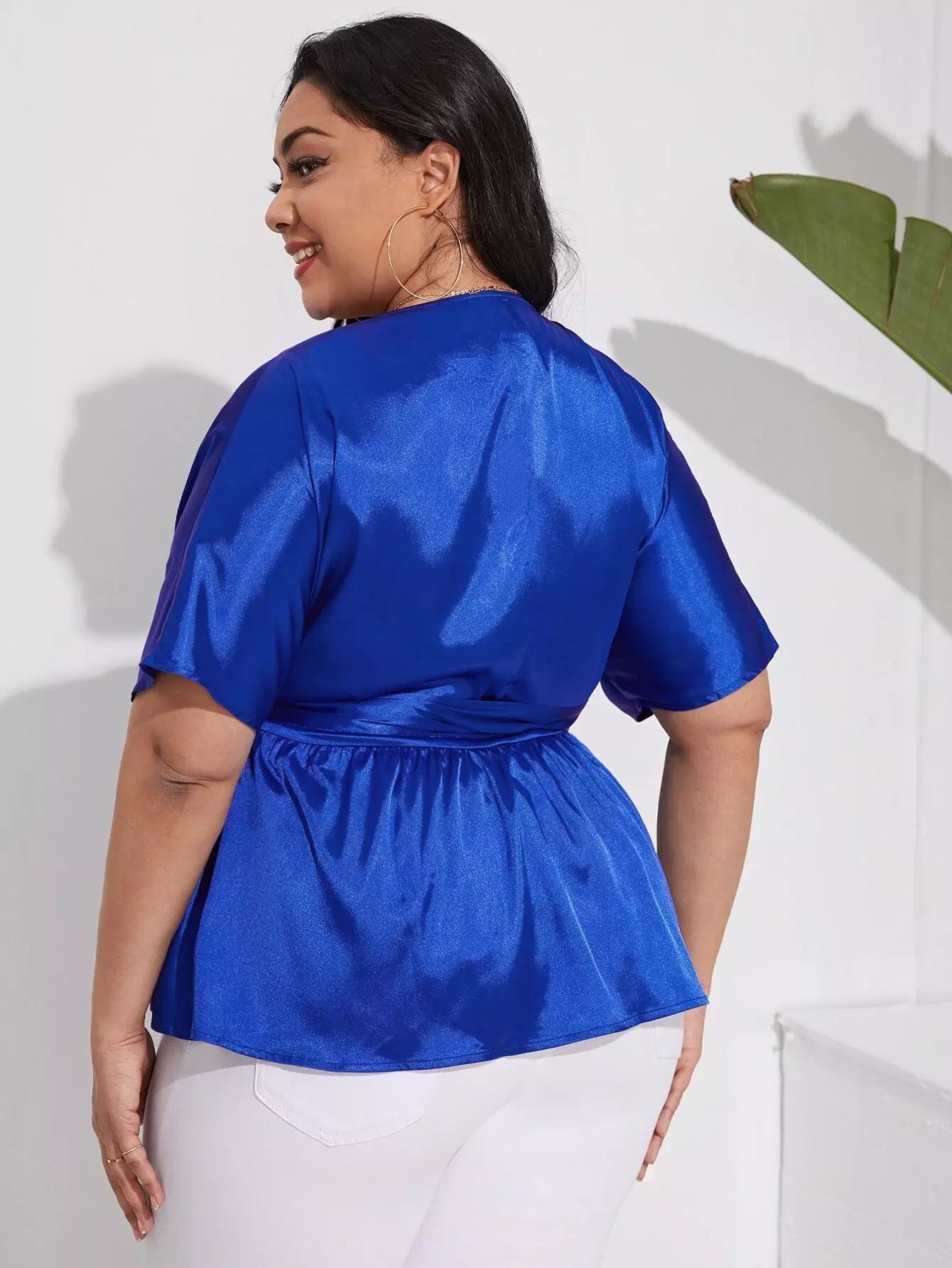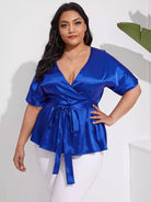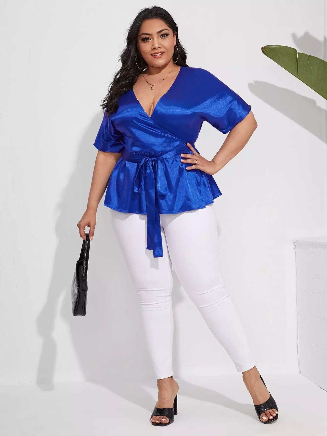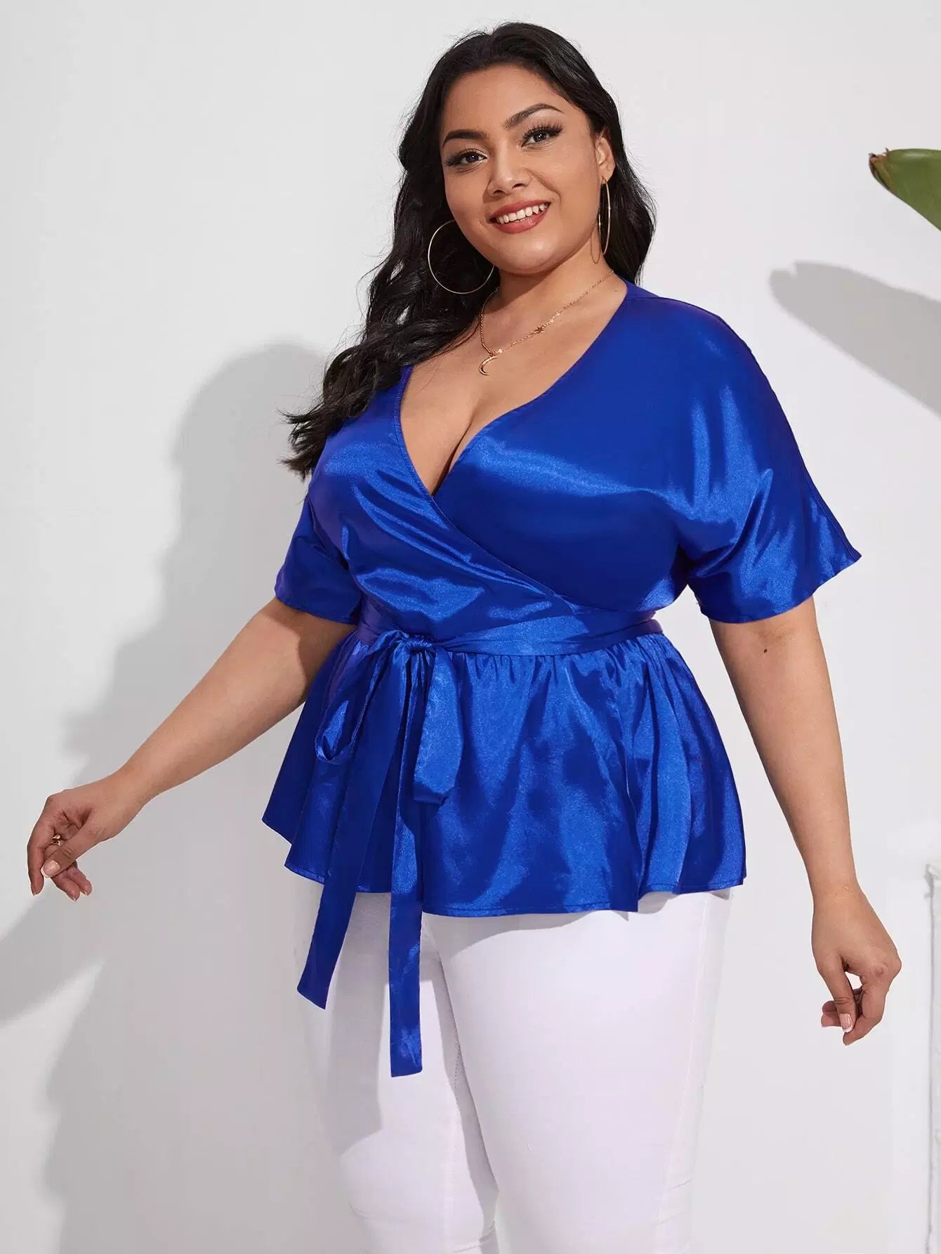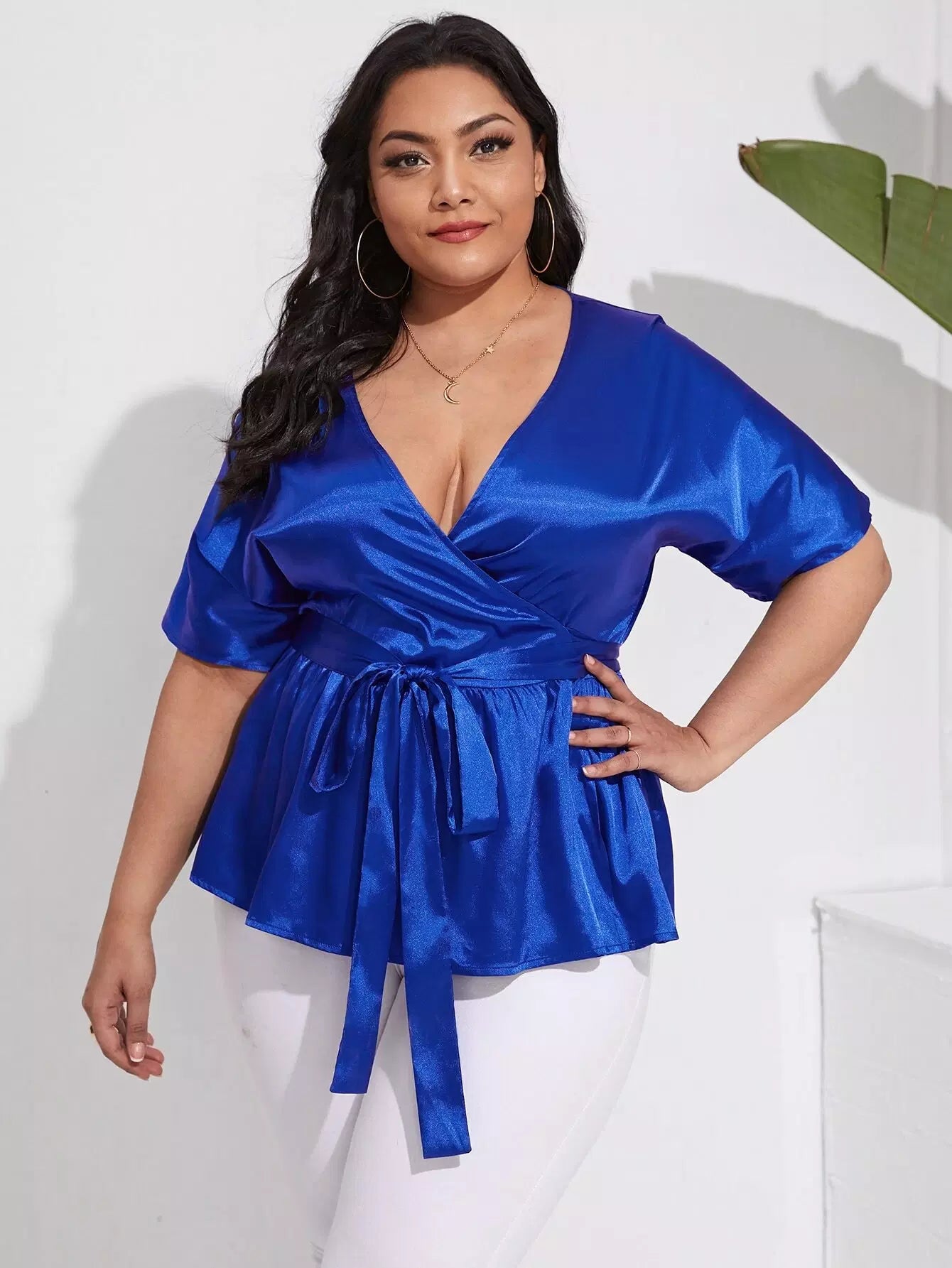 بلوزة ساتان زائد ذات ربطة عنق ذاتي من الساتان