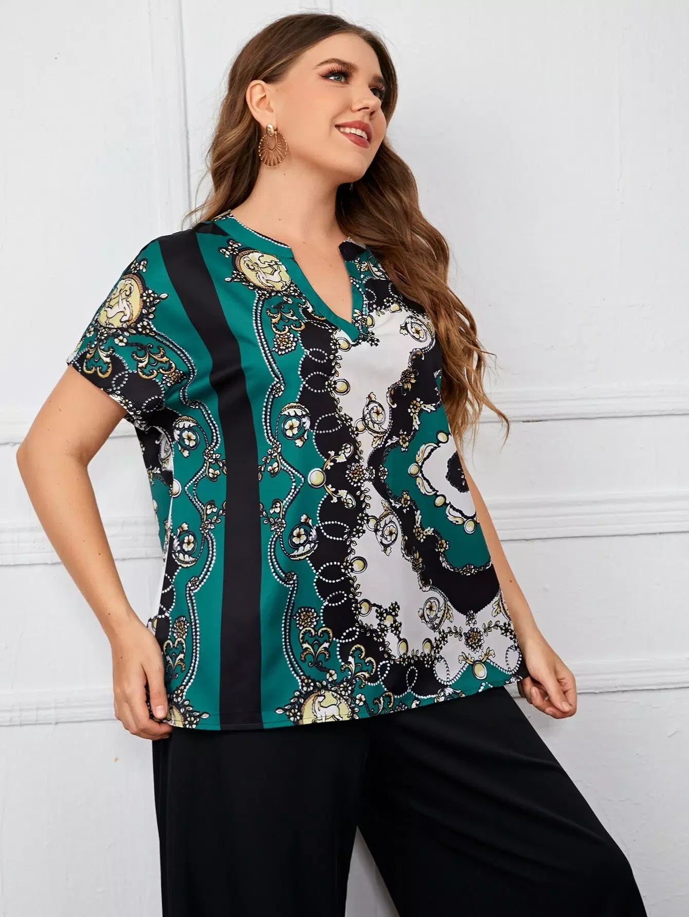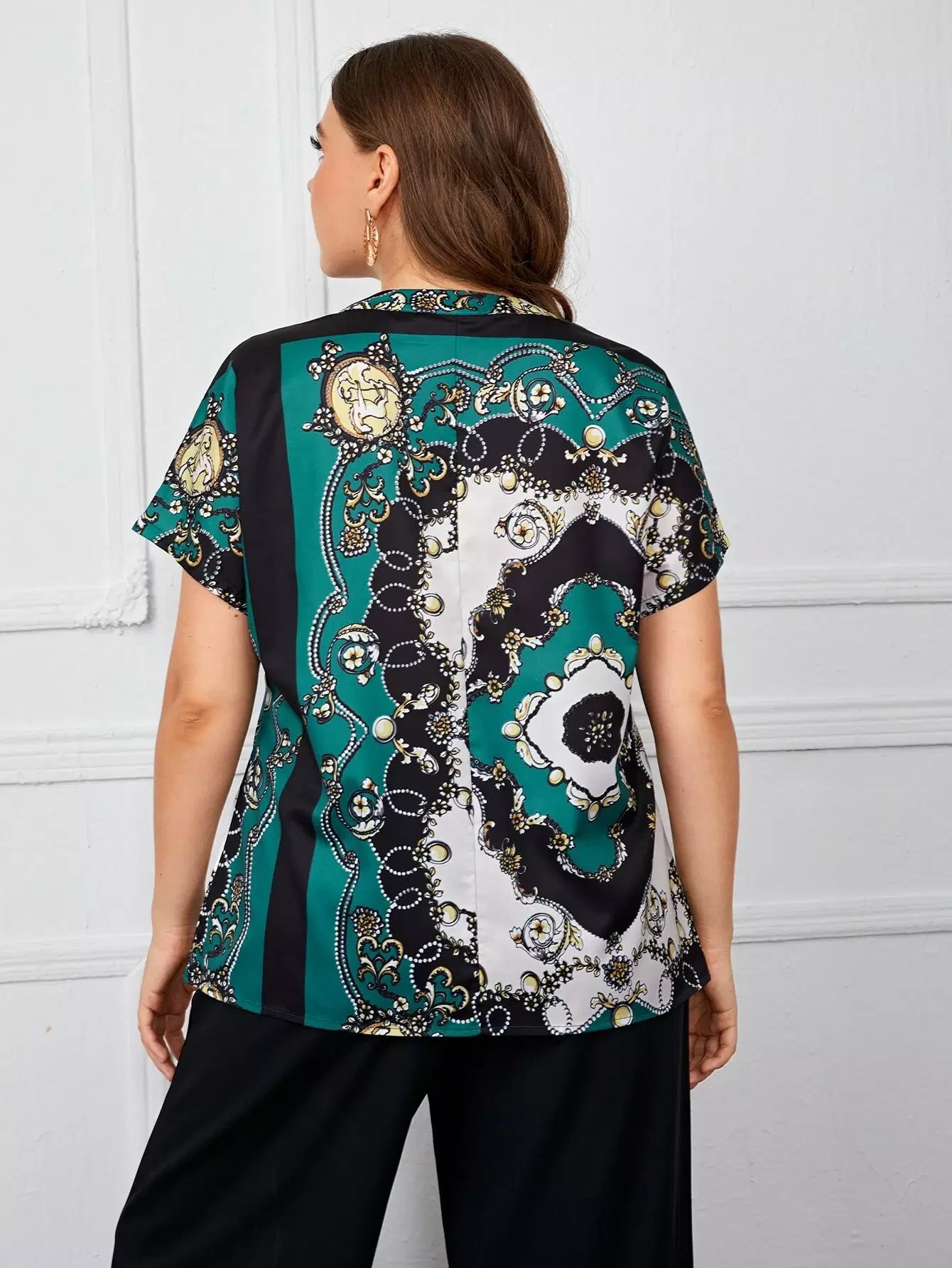 بلوزة برقبة برقبة رقبة رقيقة مطبوع عليها وشاح زائد