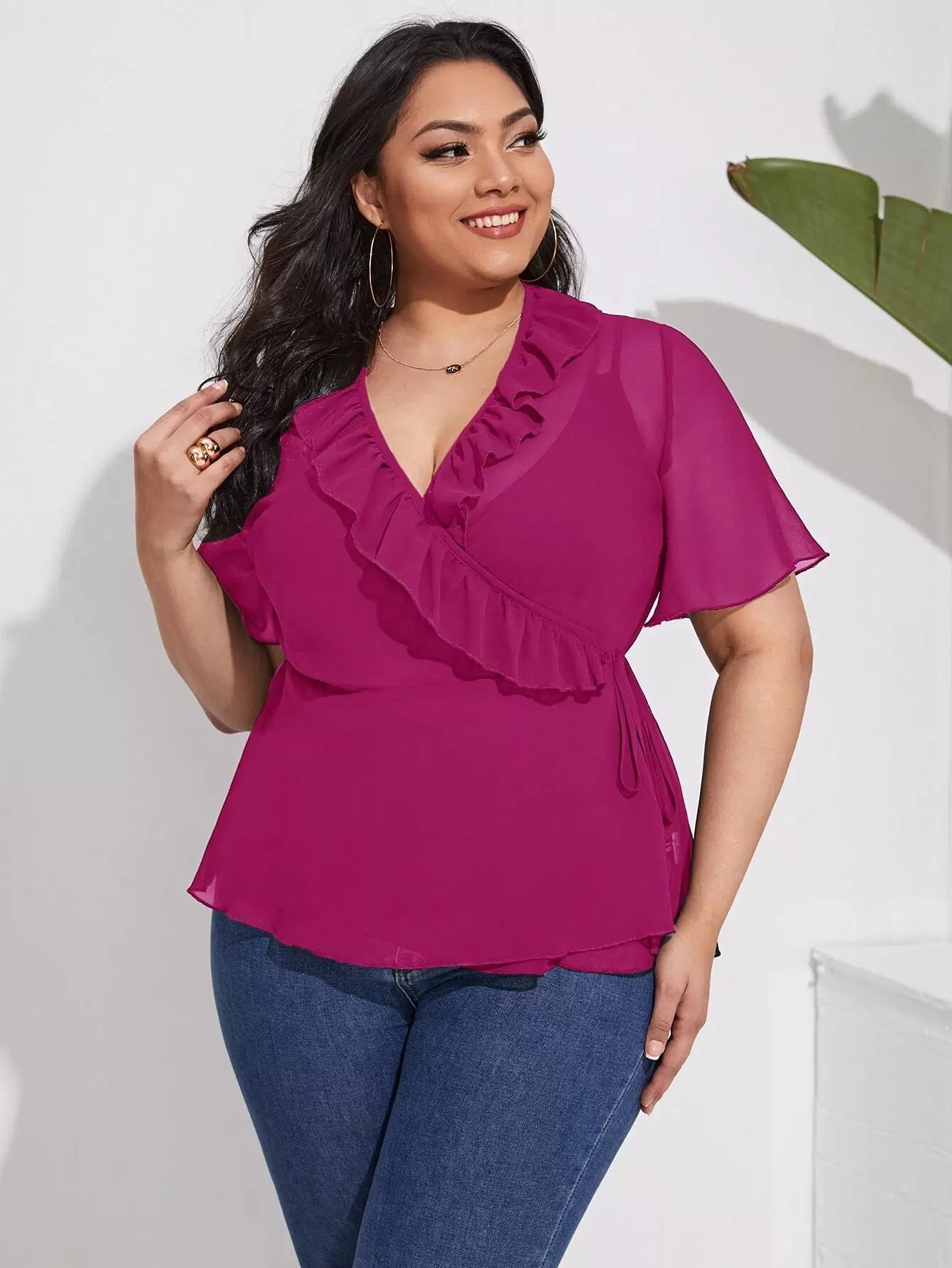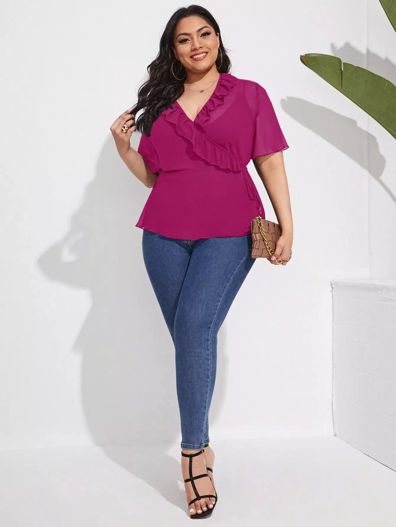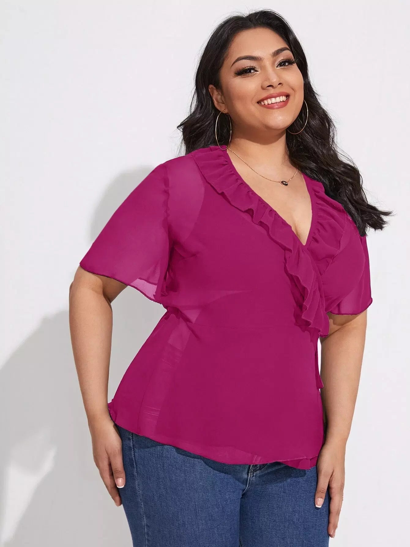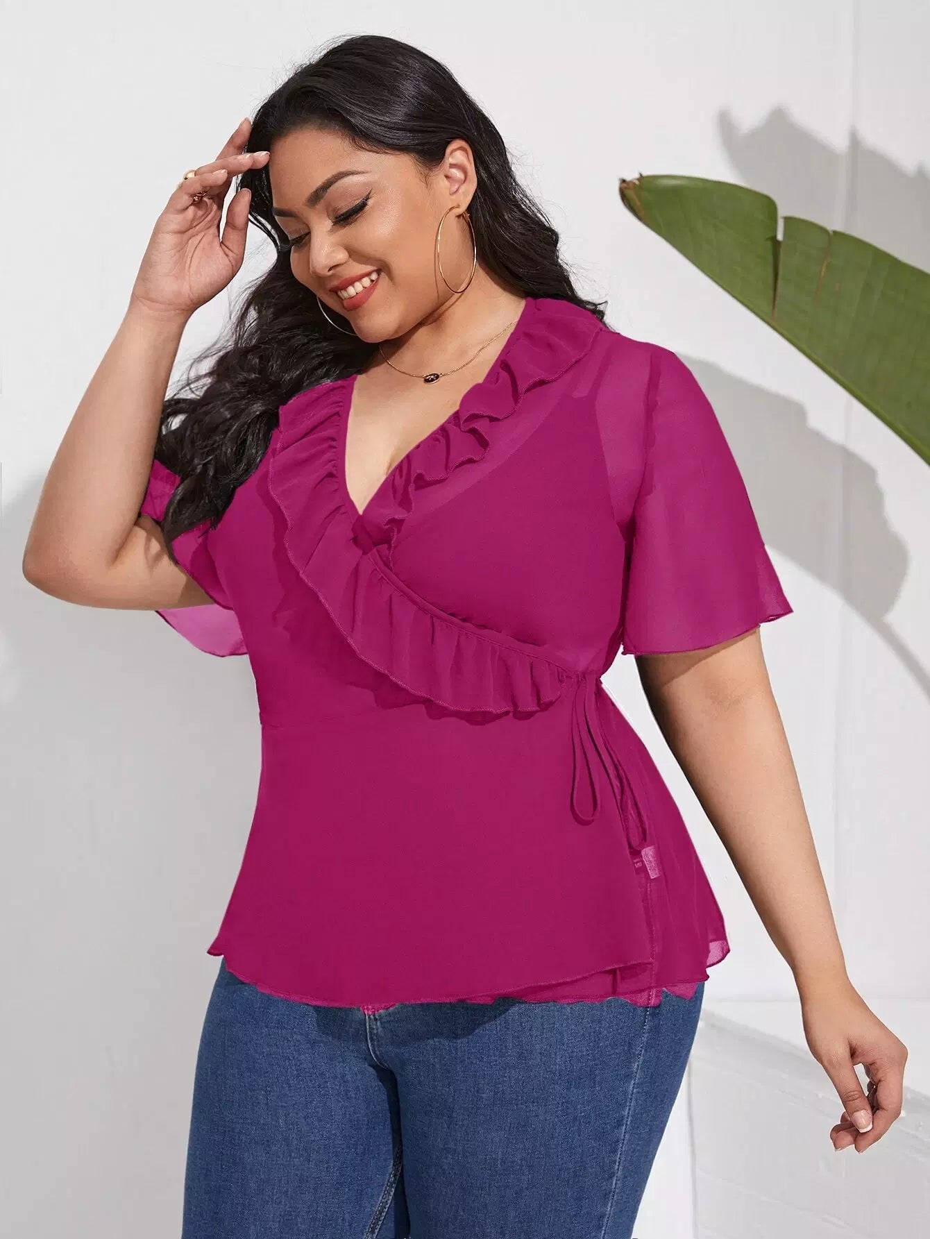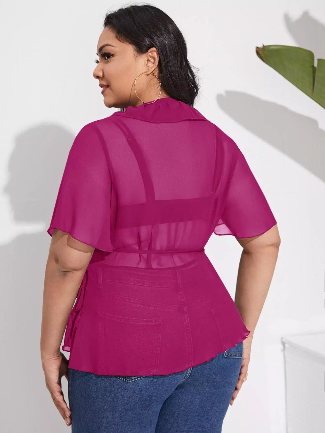 بلوزة شفافة ذات حواف مكشكشة بفتحة ملفوفة على شكل عقدة شفافة