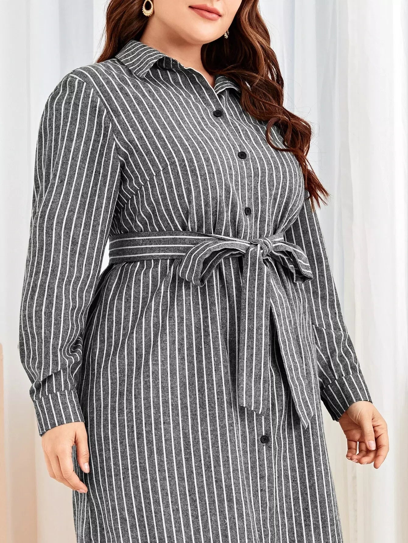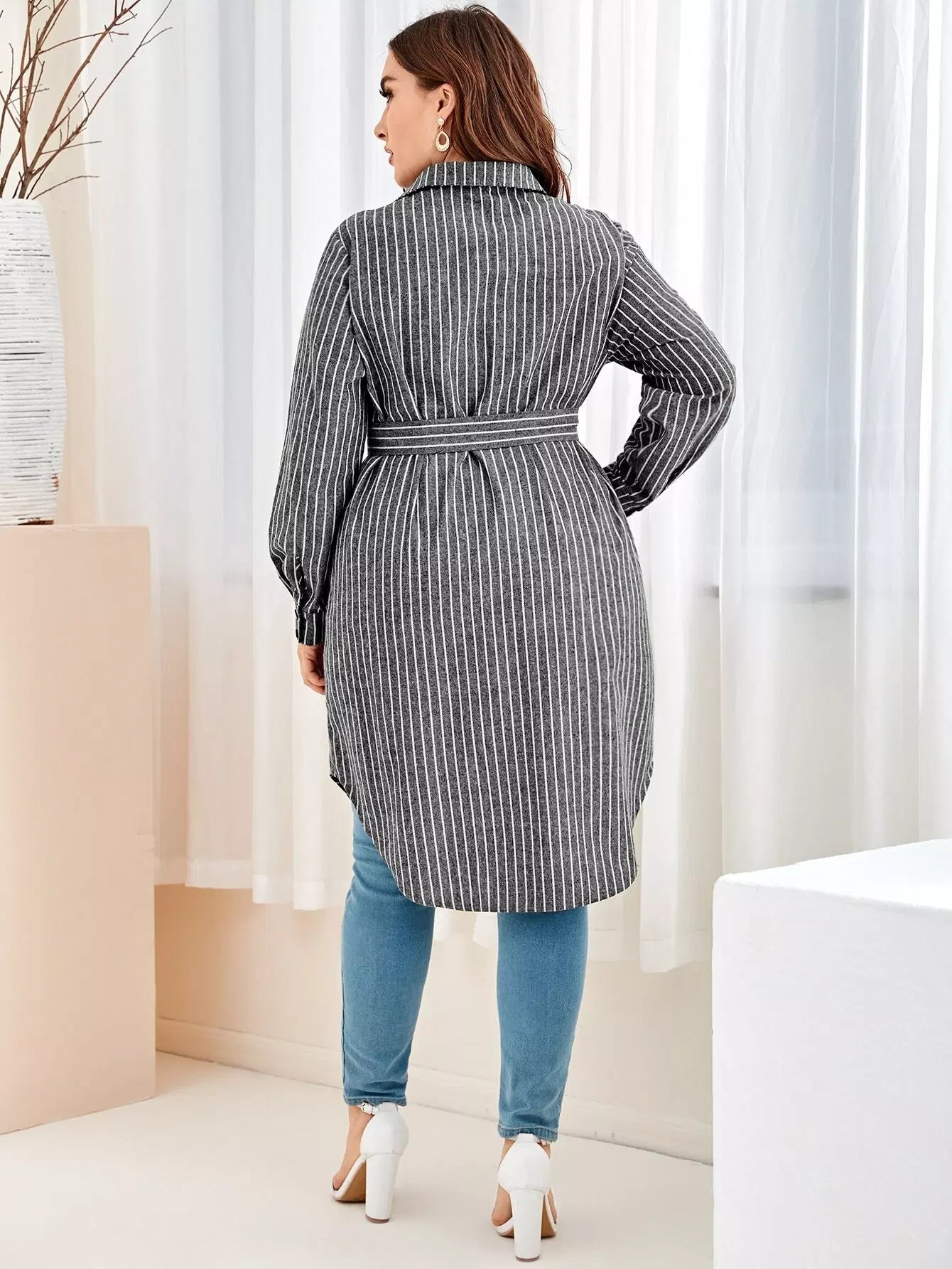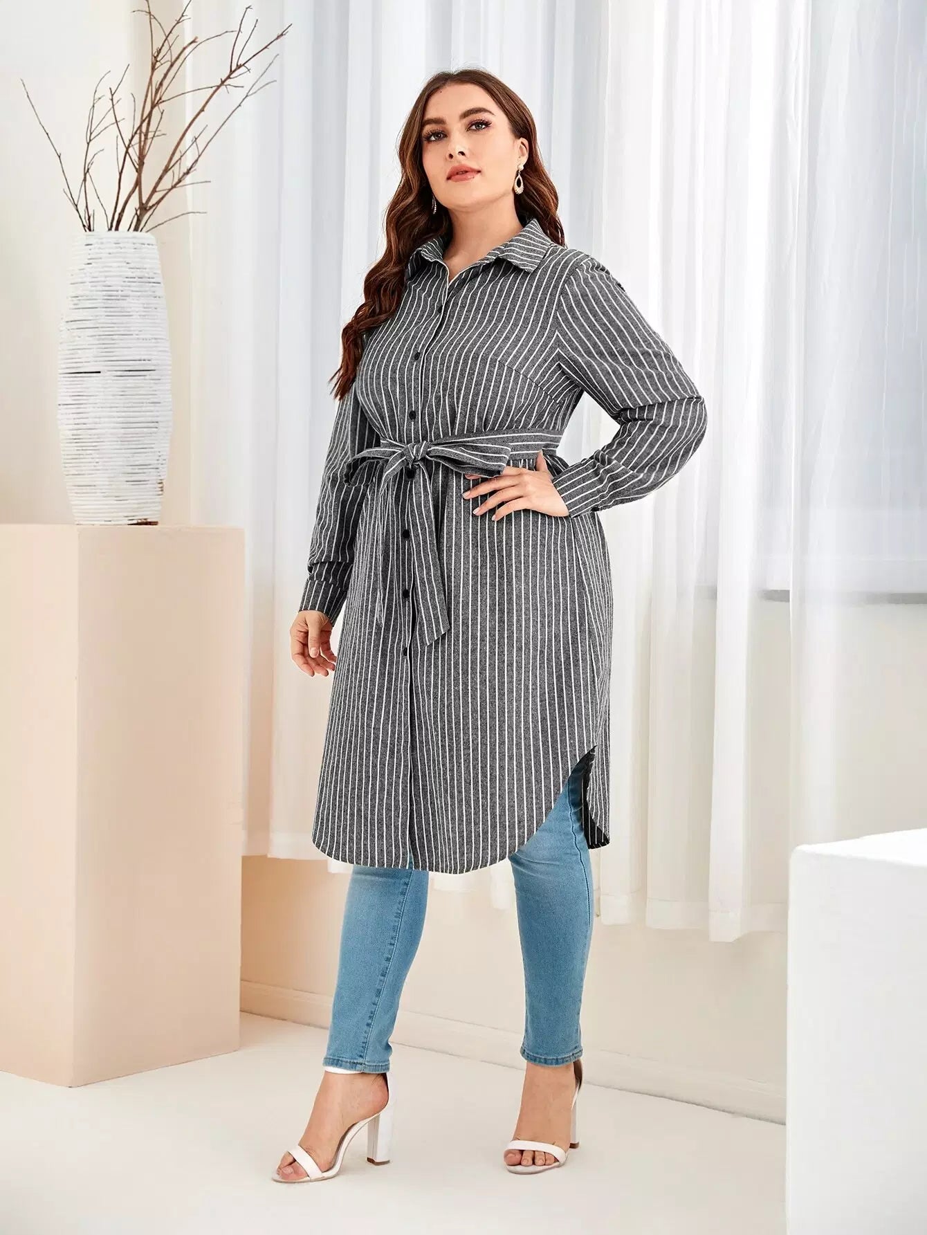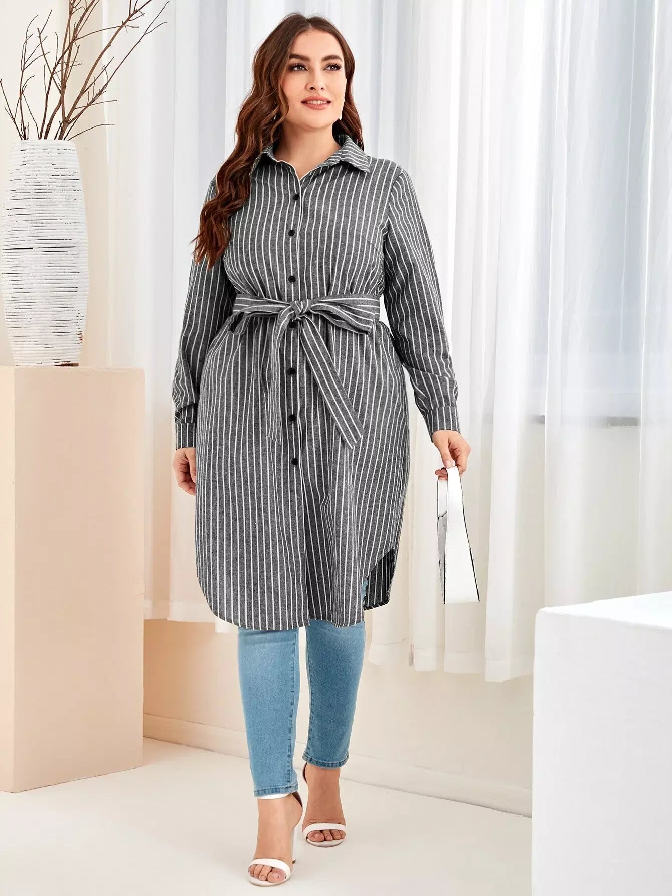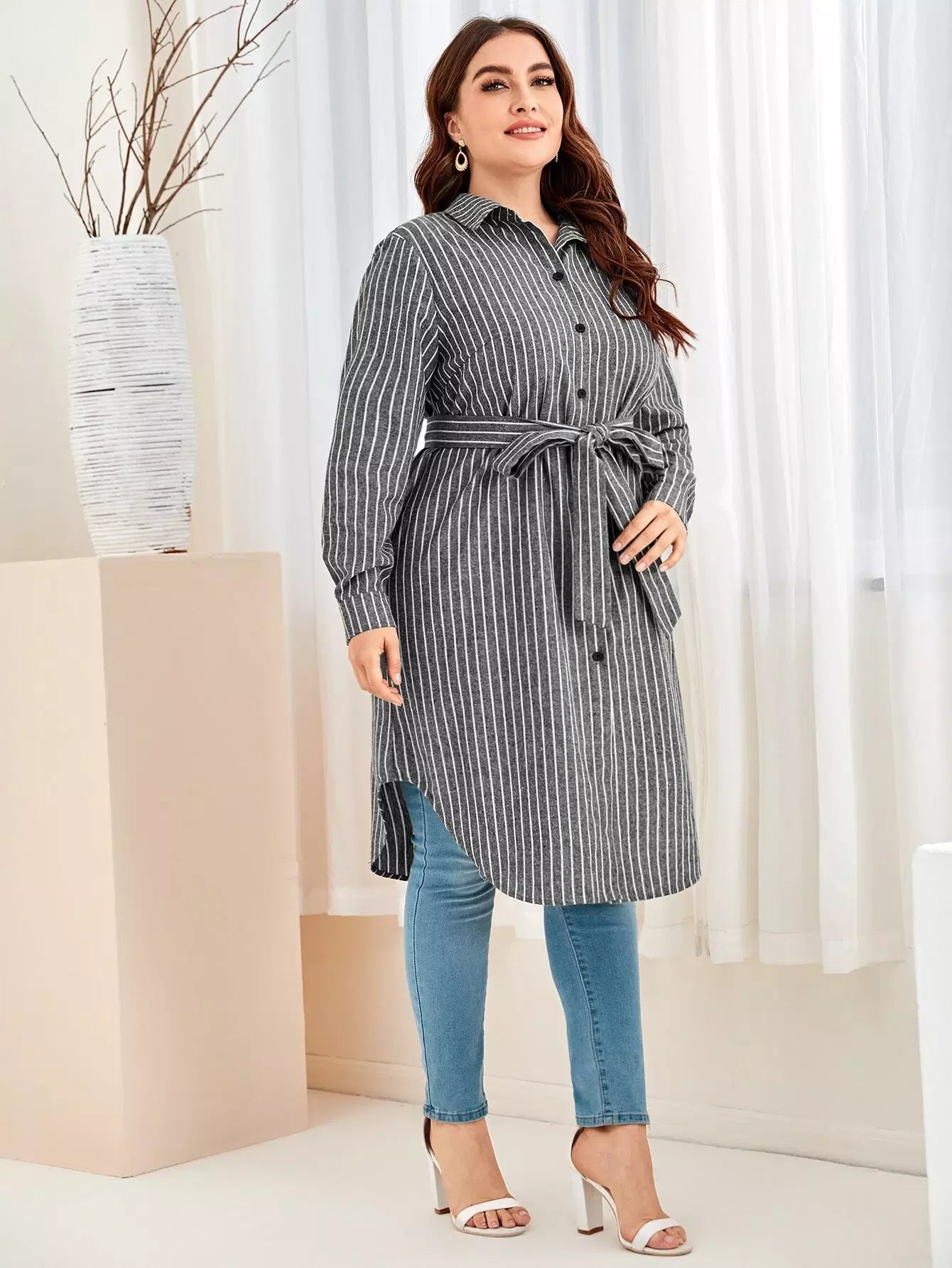 بالإضافة إلى بلوزة مخططة بدون حزام