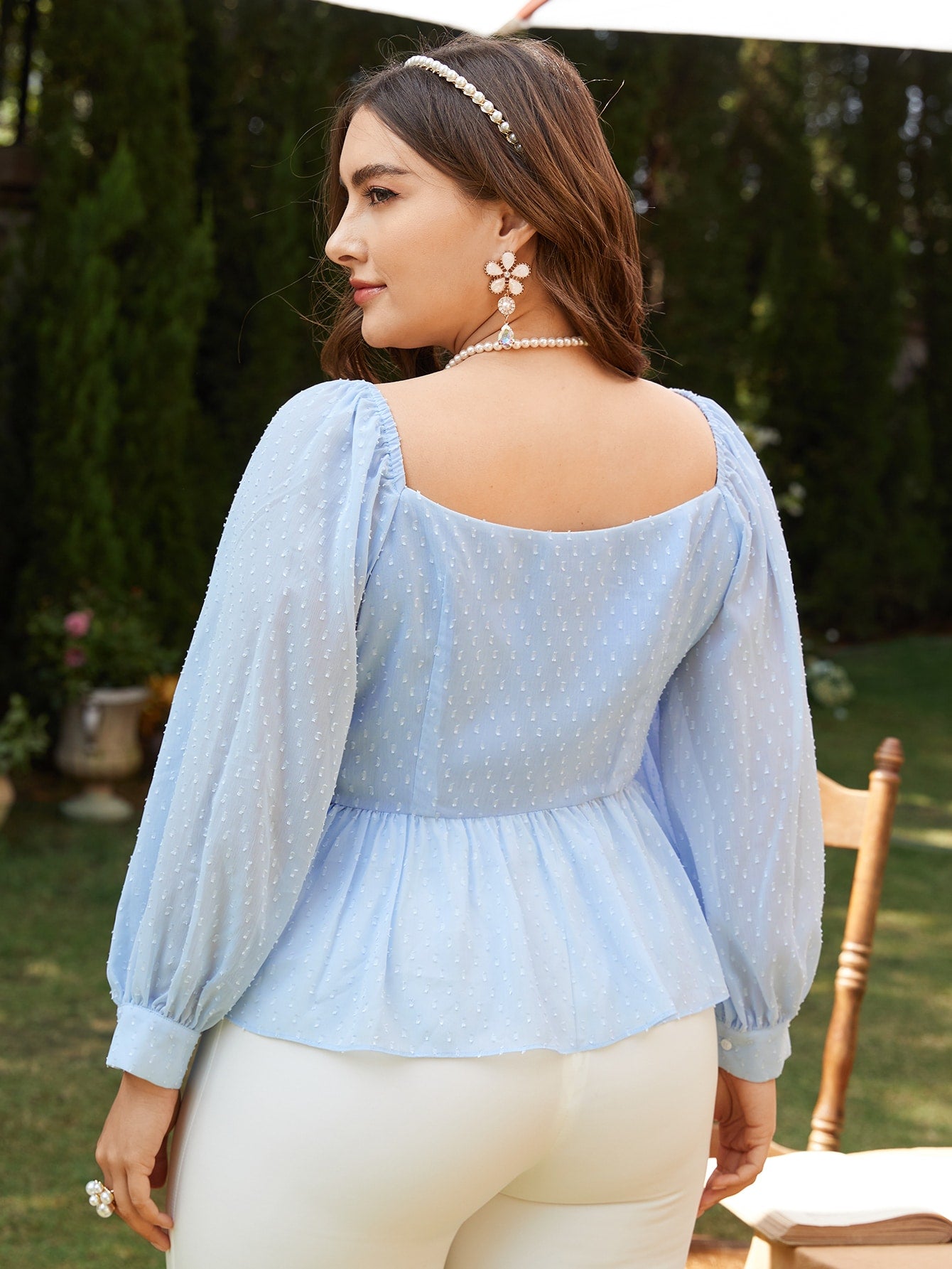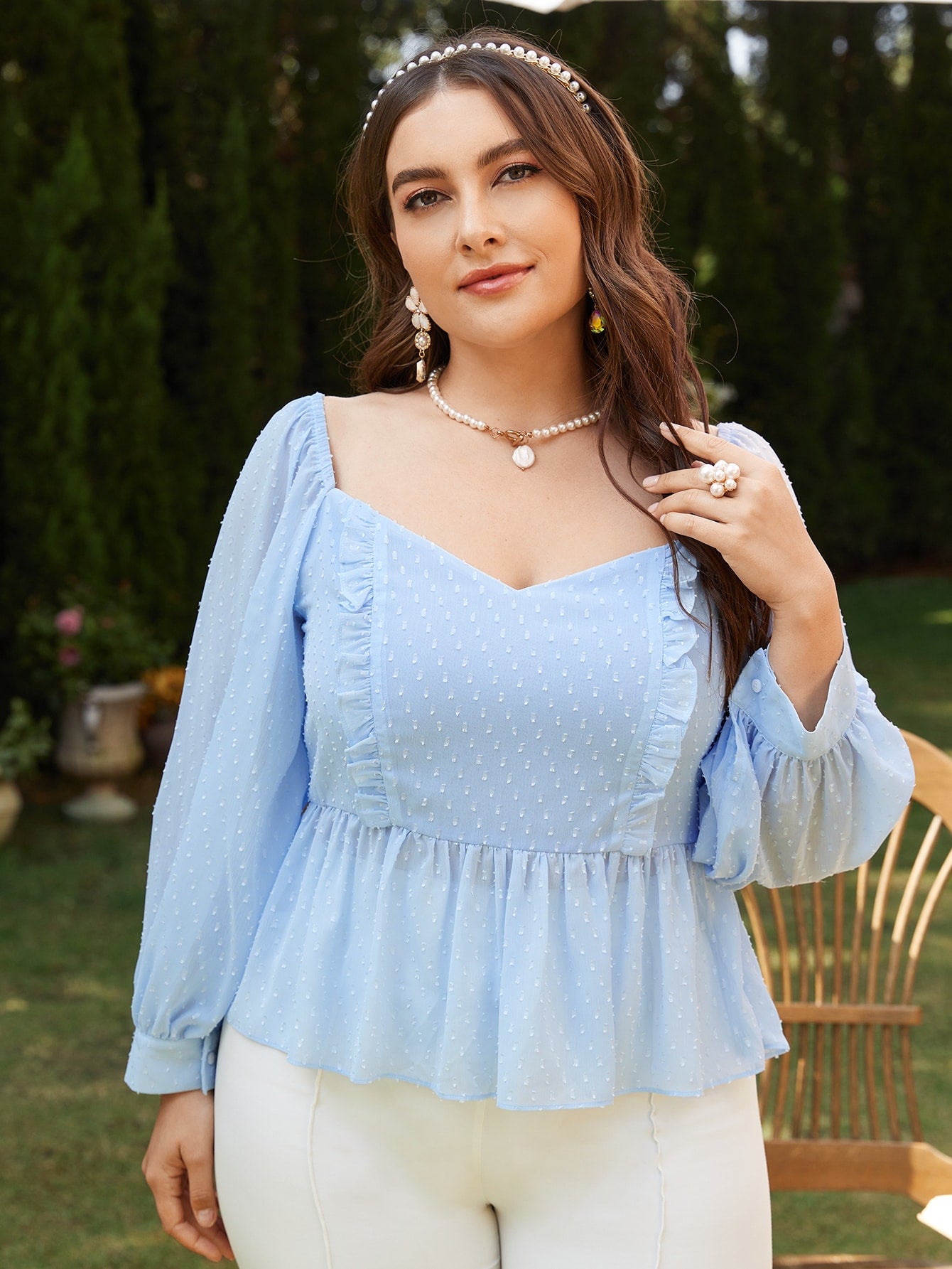 Plus Swiss Dot Frill Trim Sweetheart Neck Peplum Blouse