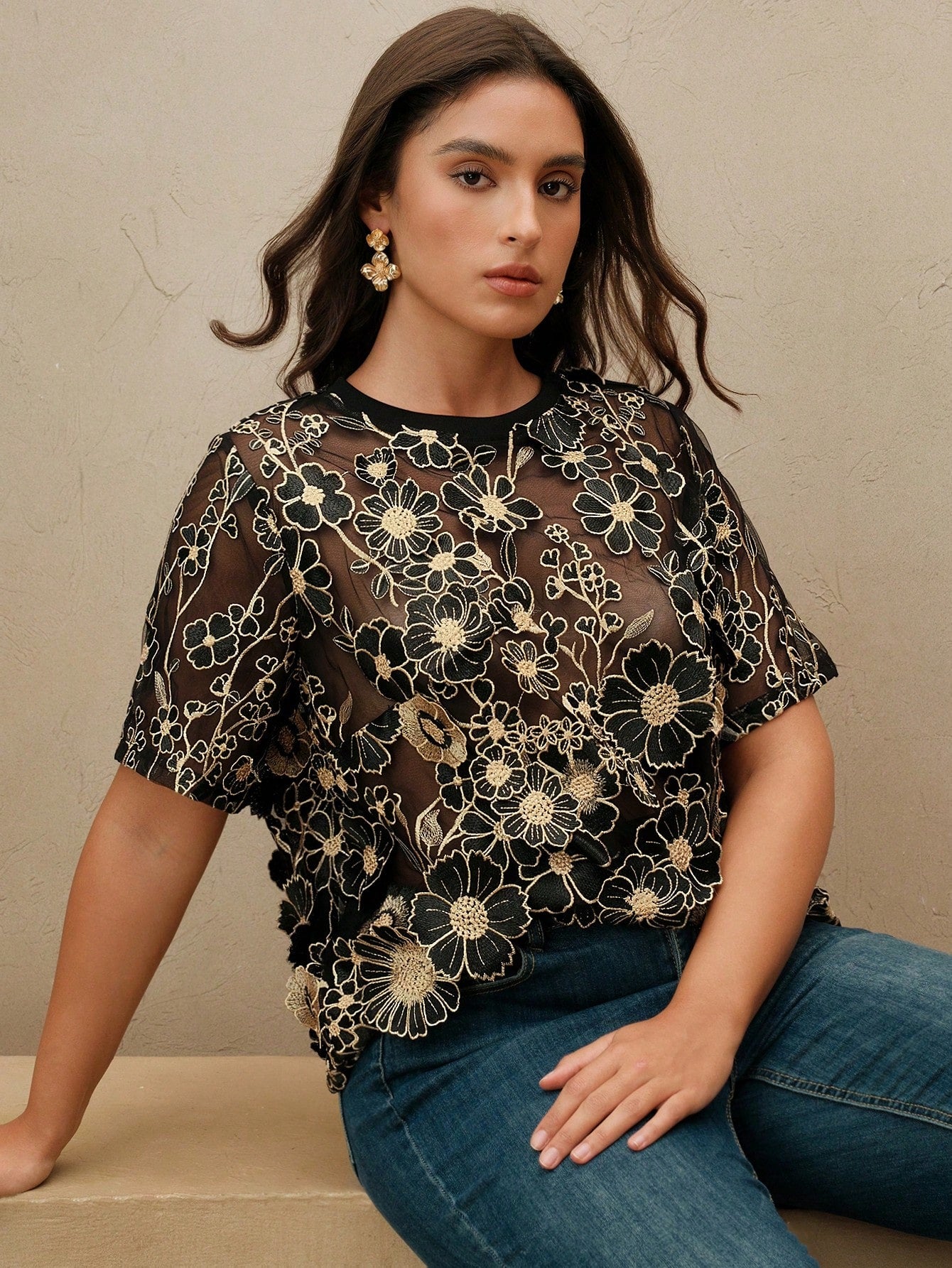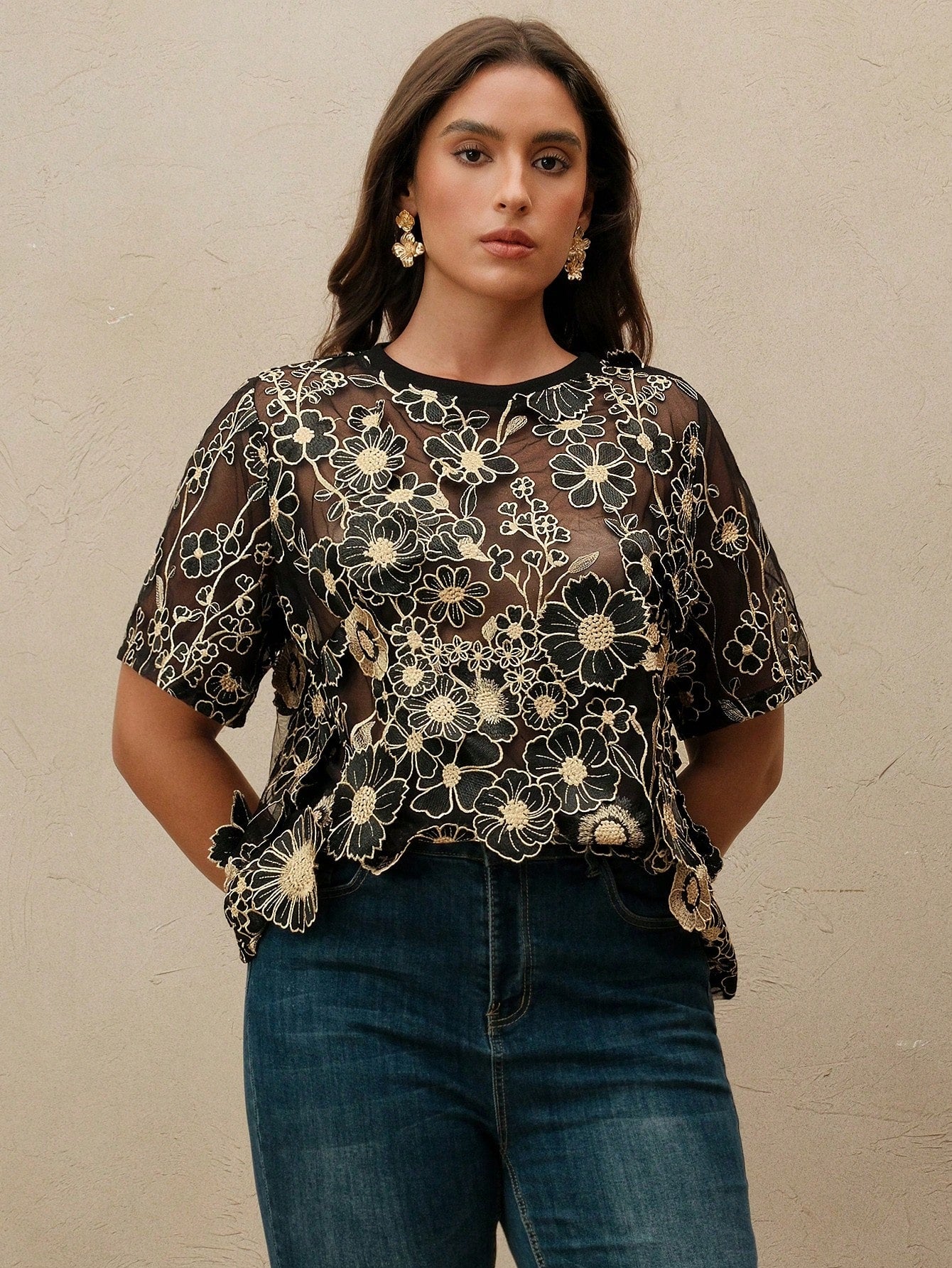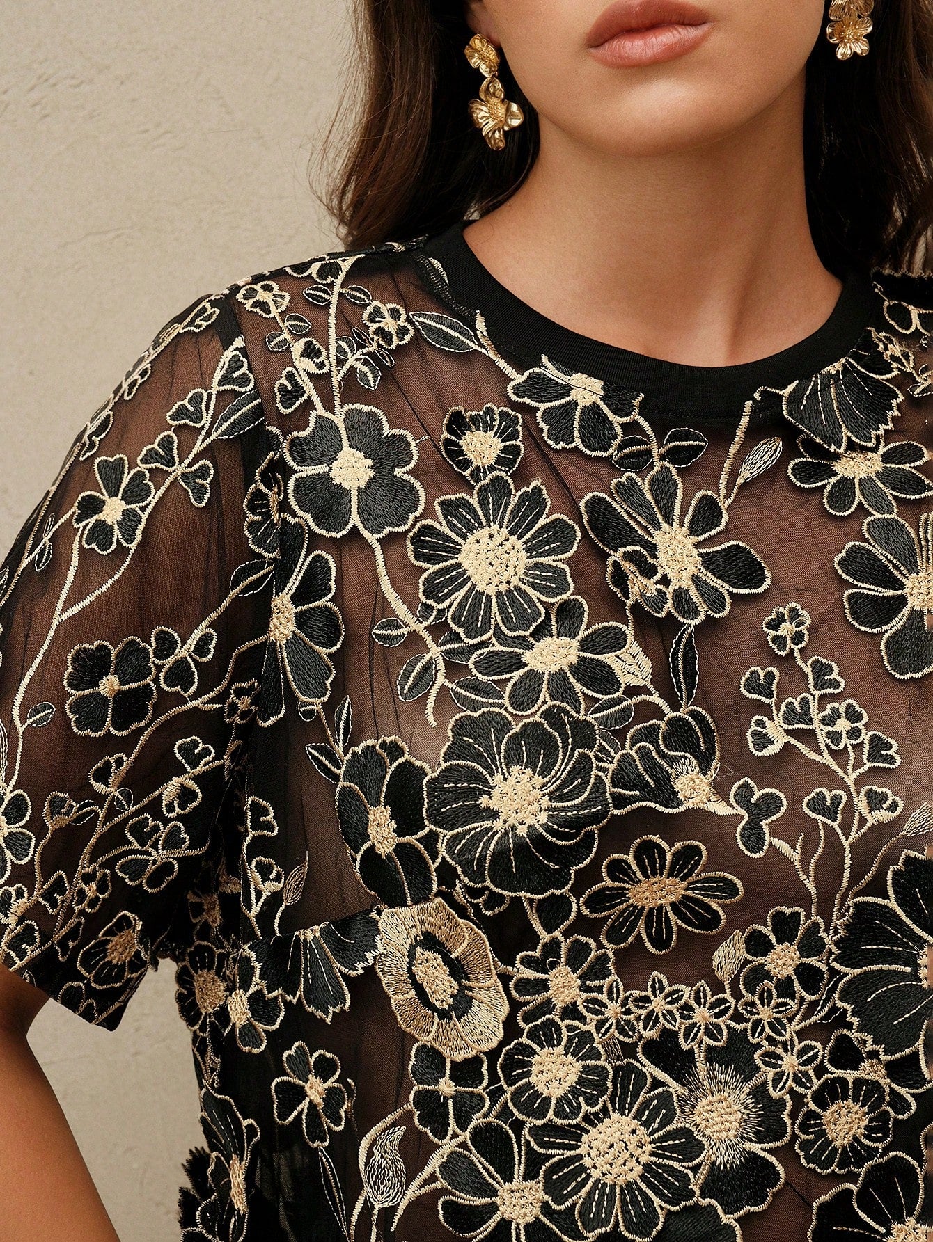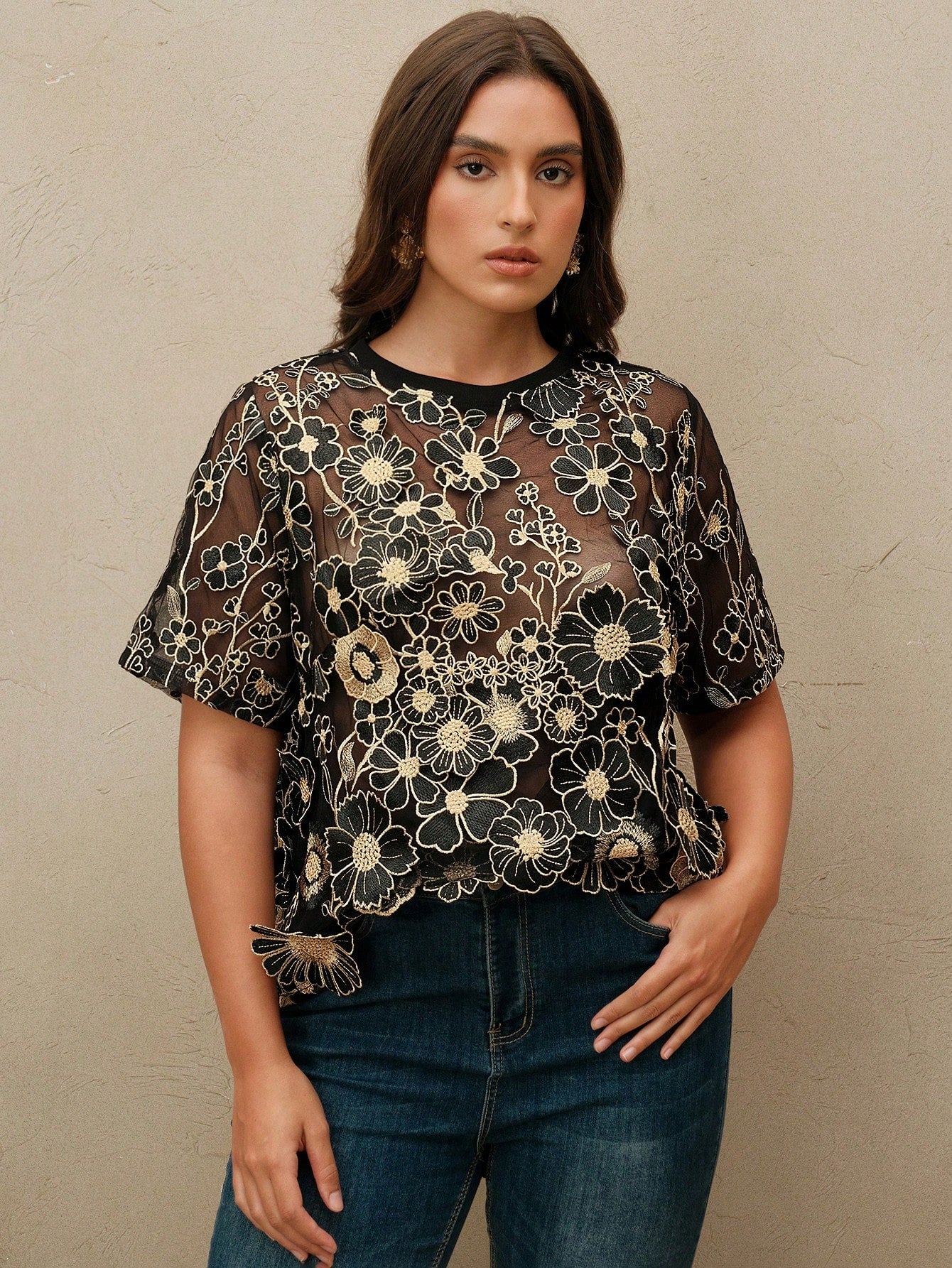 women Anewsta Elegant & Romantic See-Through 3D Embroidery Women Blouse Top T-Shirt