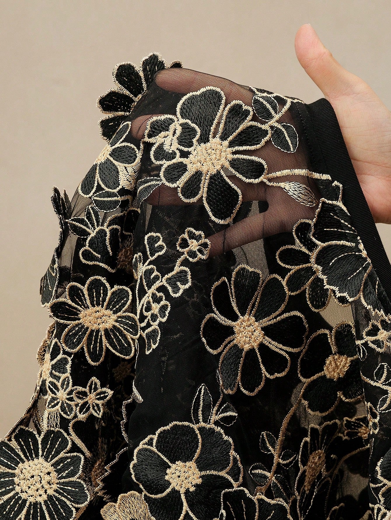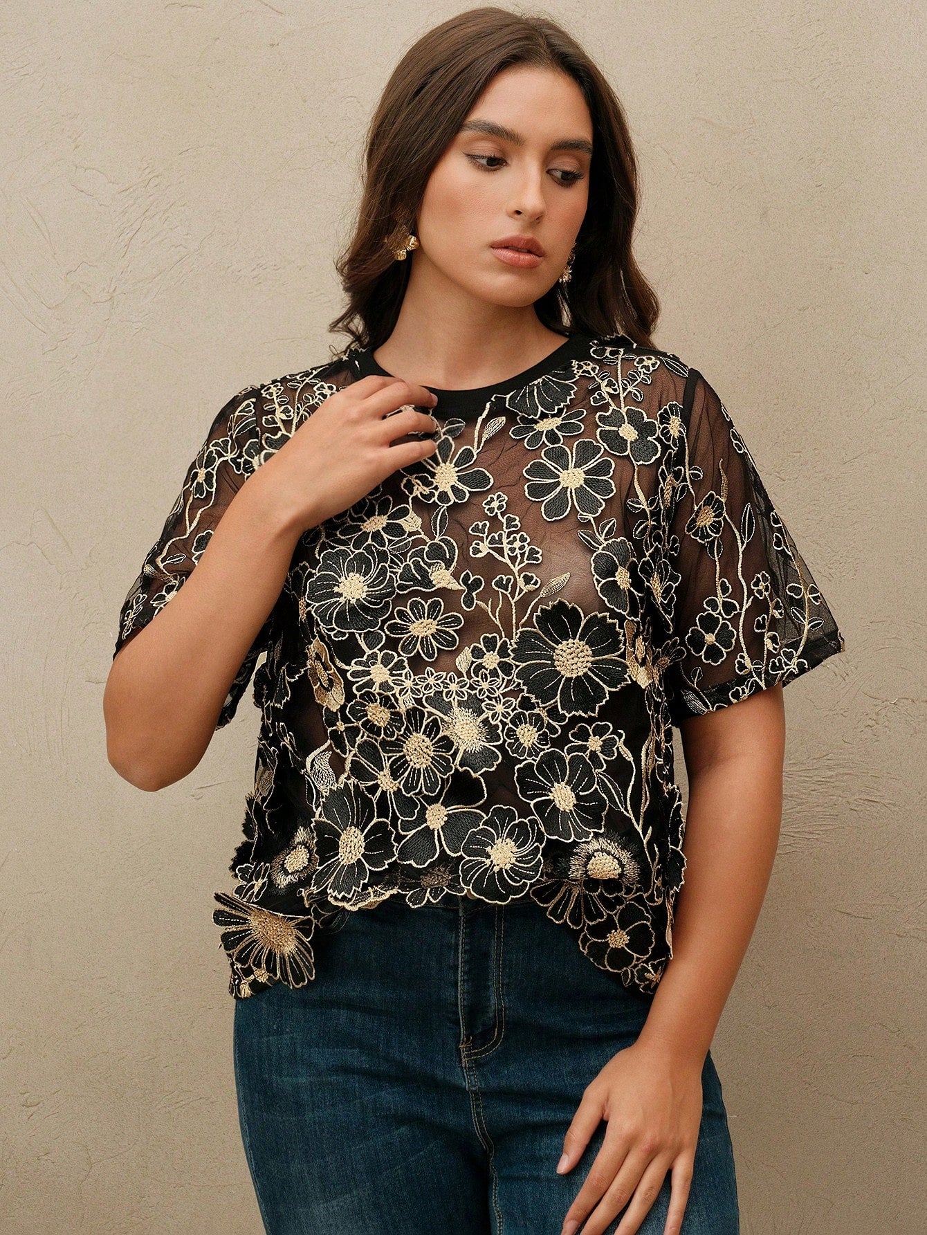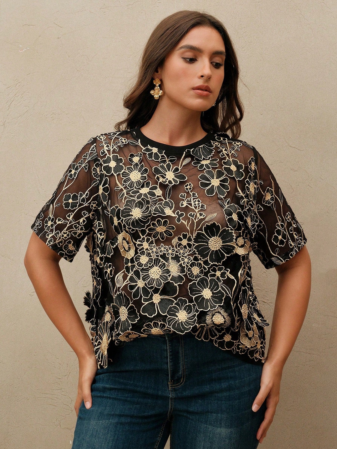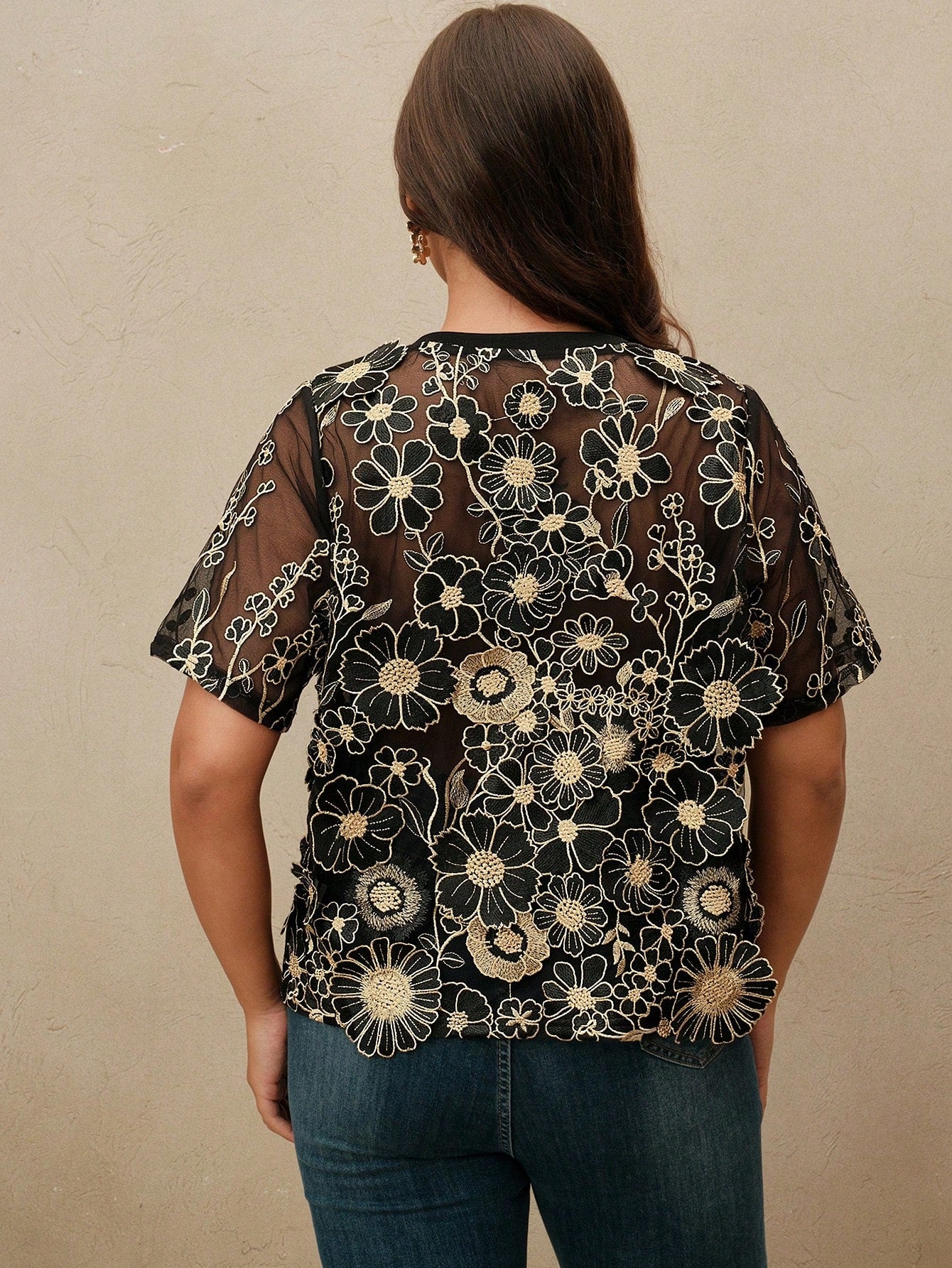women Anewsta Elegant & Romantic See-Through 3D Embroidery Women Blouse Top T-Shirt