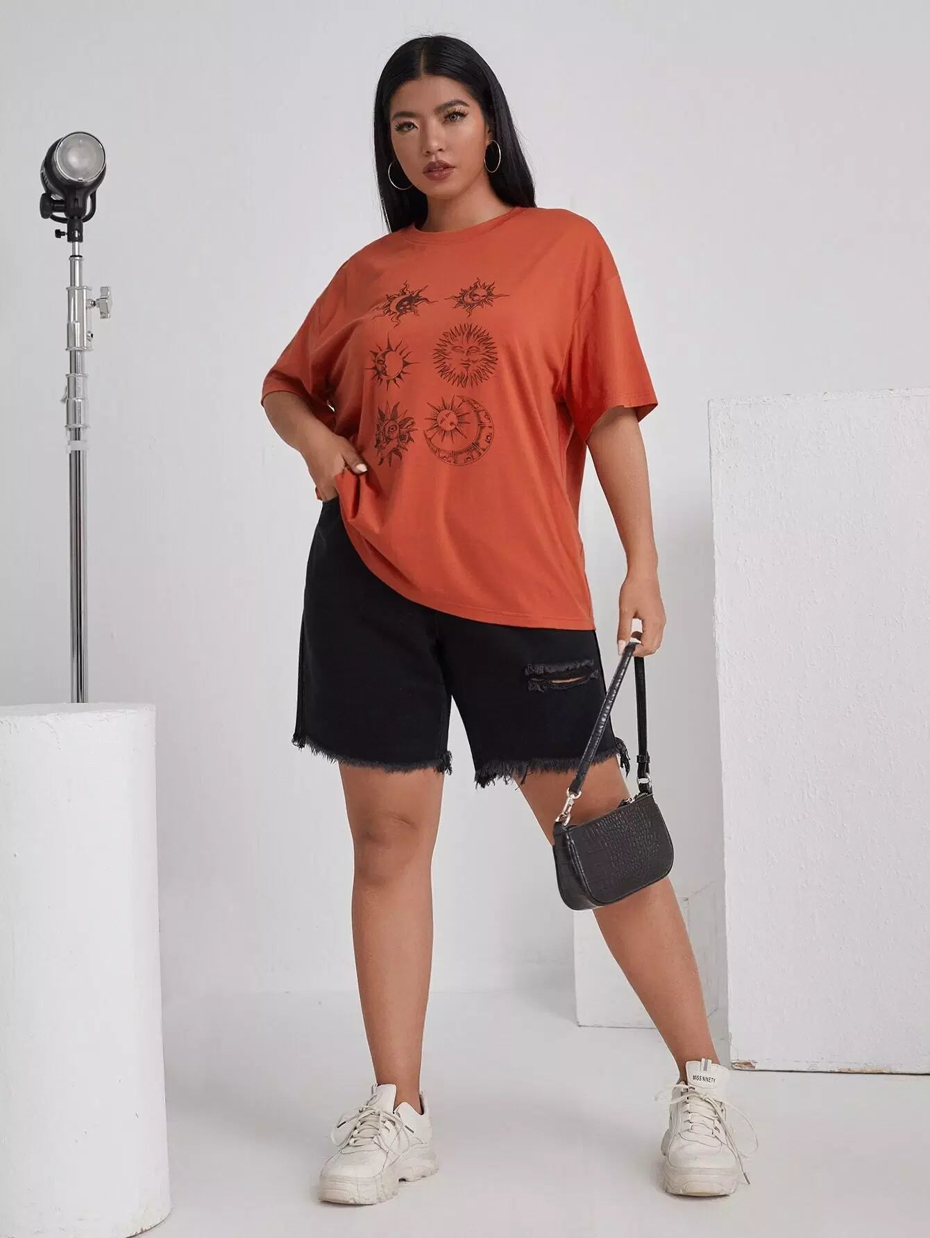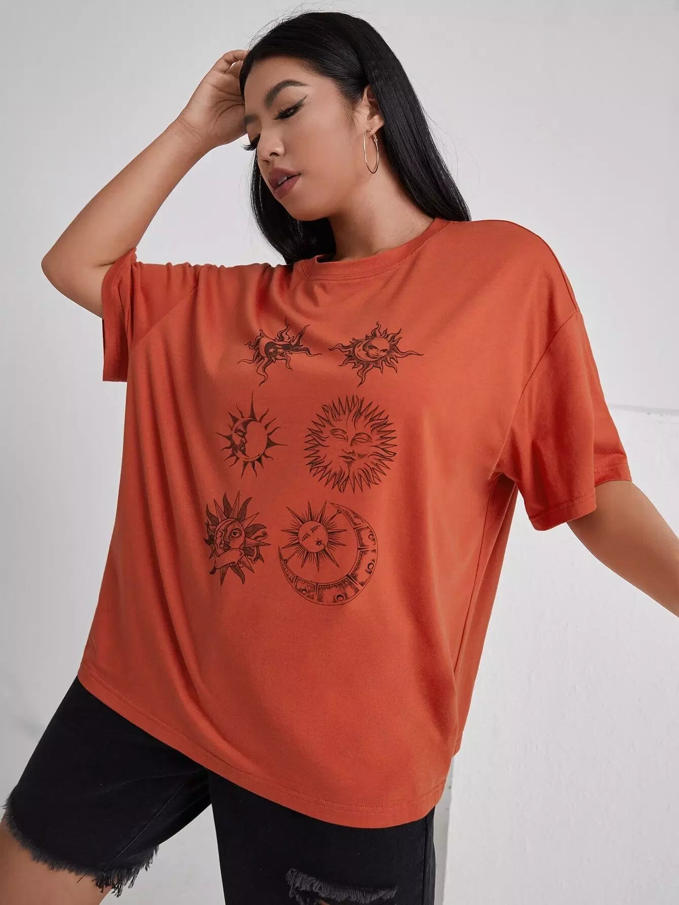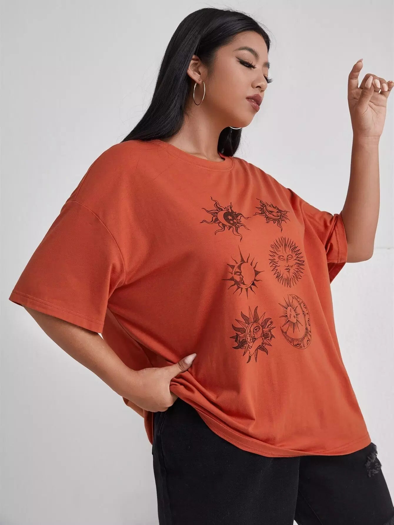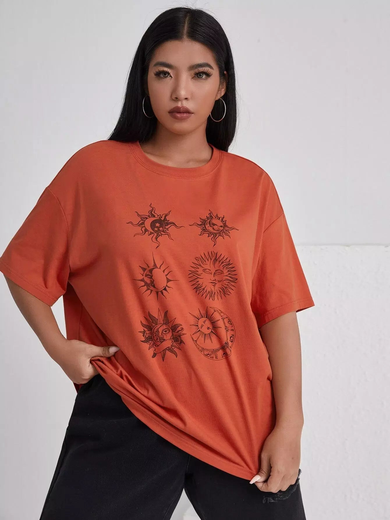 تي شيرت بطبعة قمر وشمس تجريدي زائد
