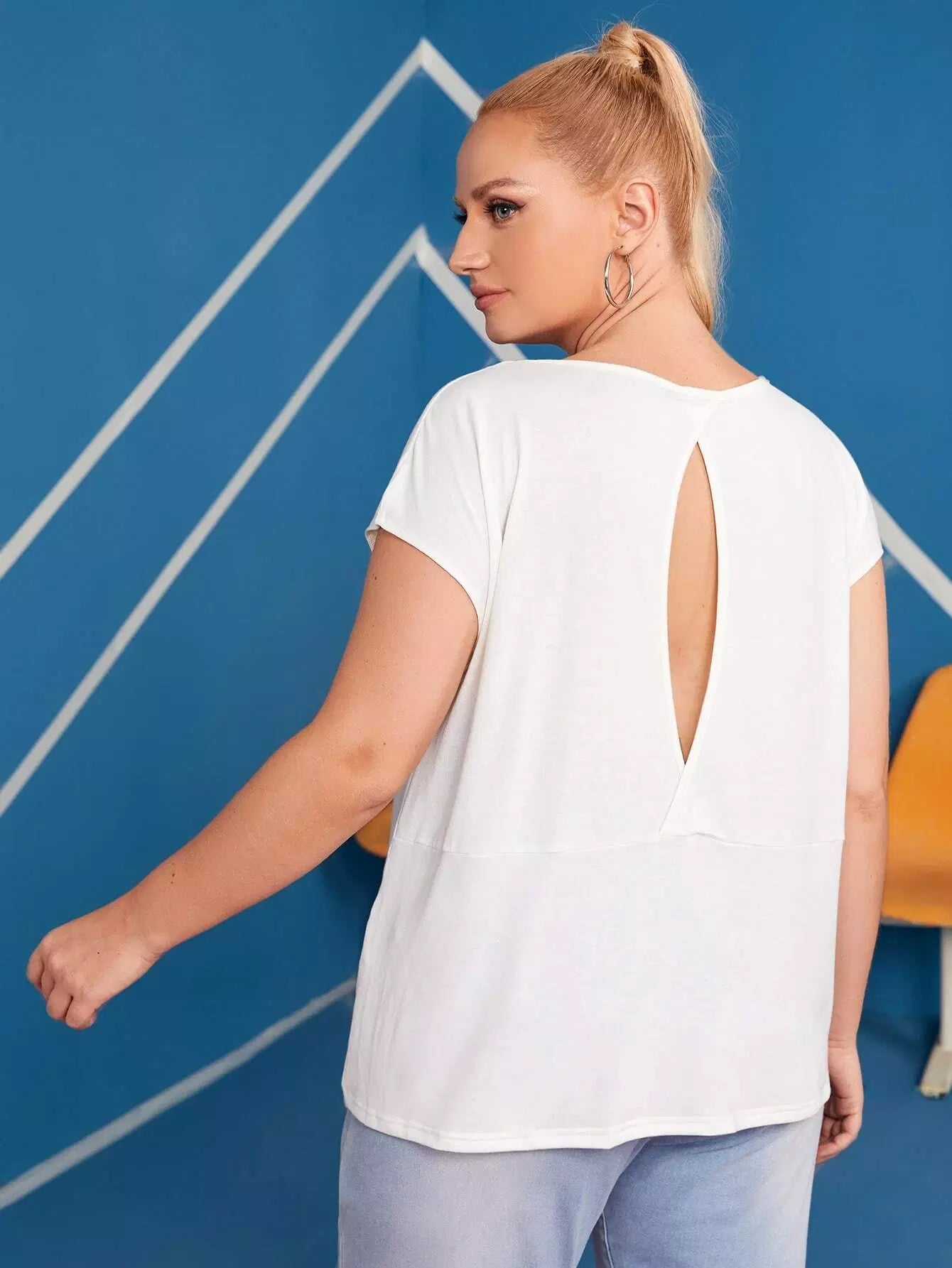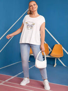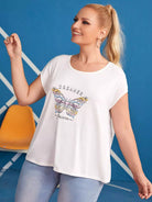 تي شيرت بقصّة مقطوعة من الخلف برسومات فراشة وحروف زائد