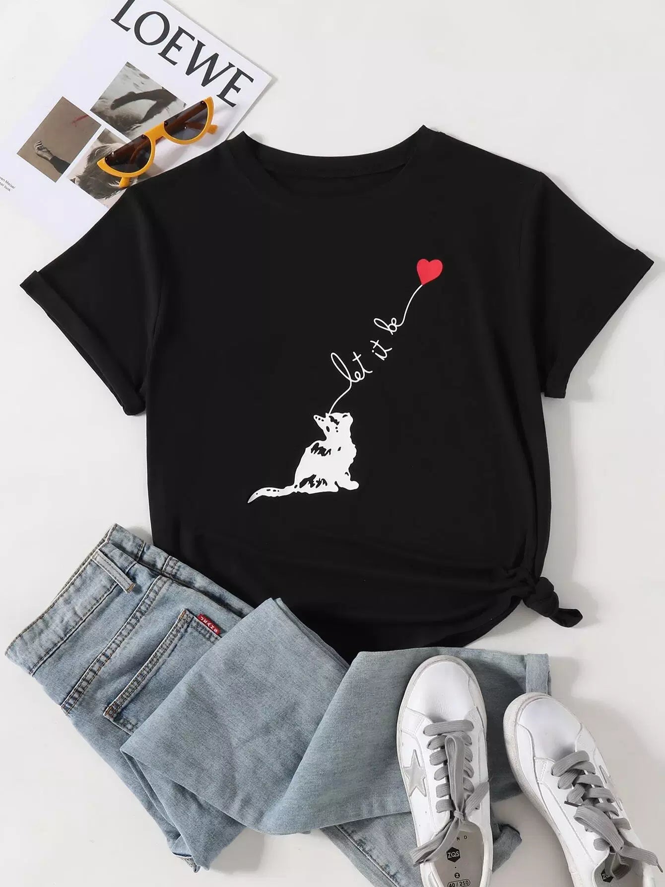 تي شيرت جرافيك بشعار قطة وشعار زائد