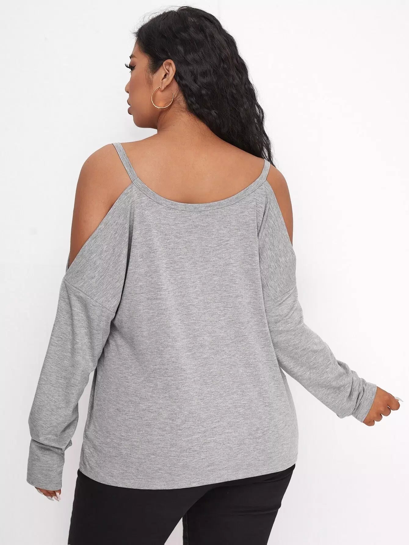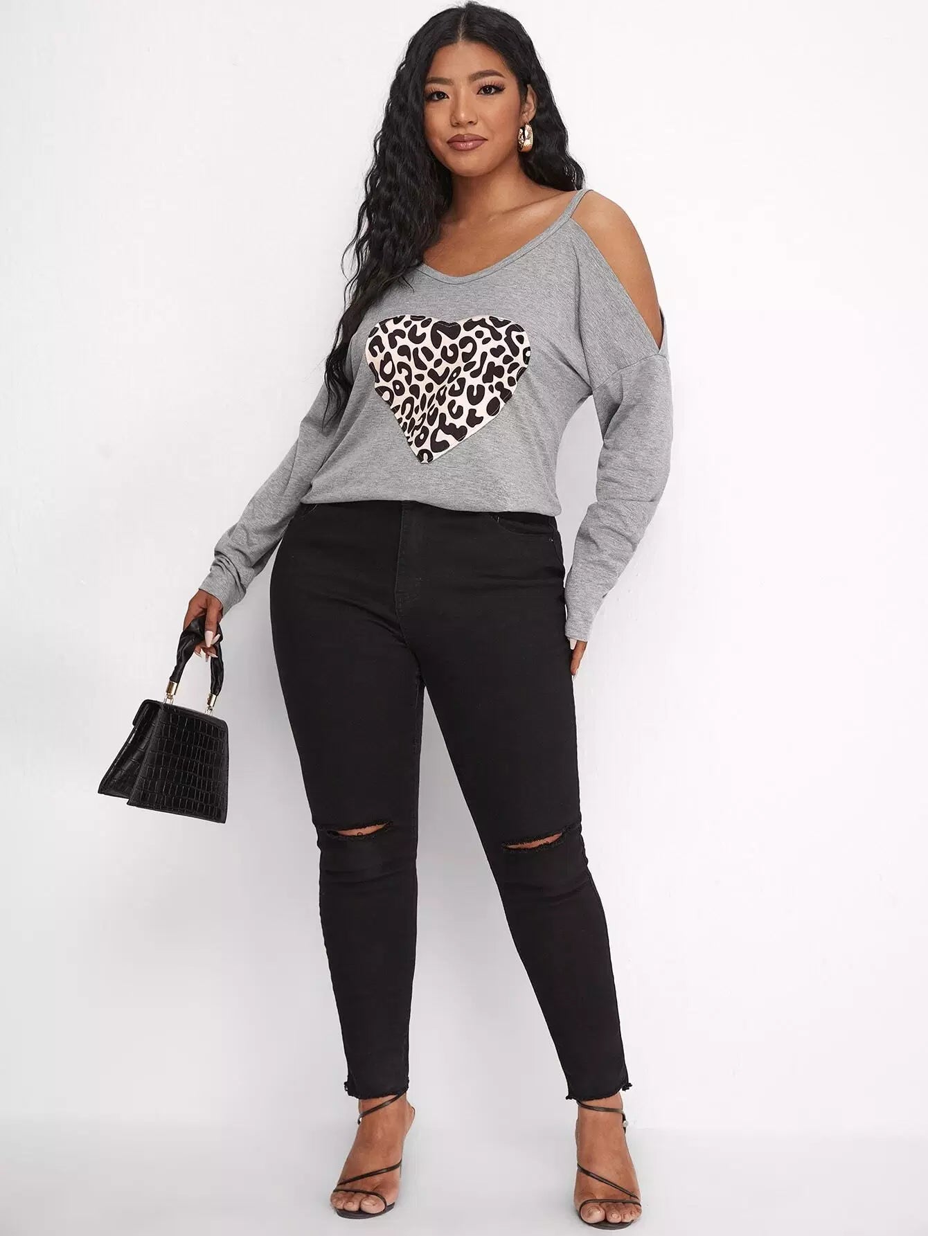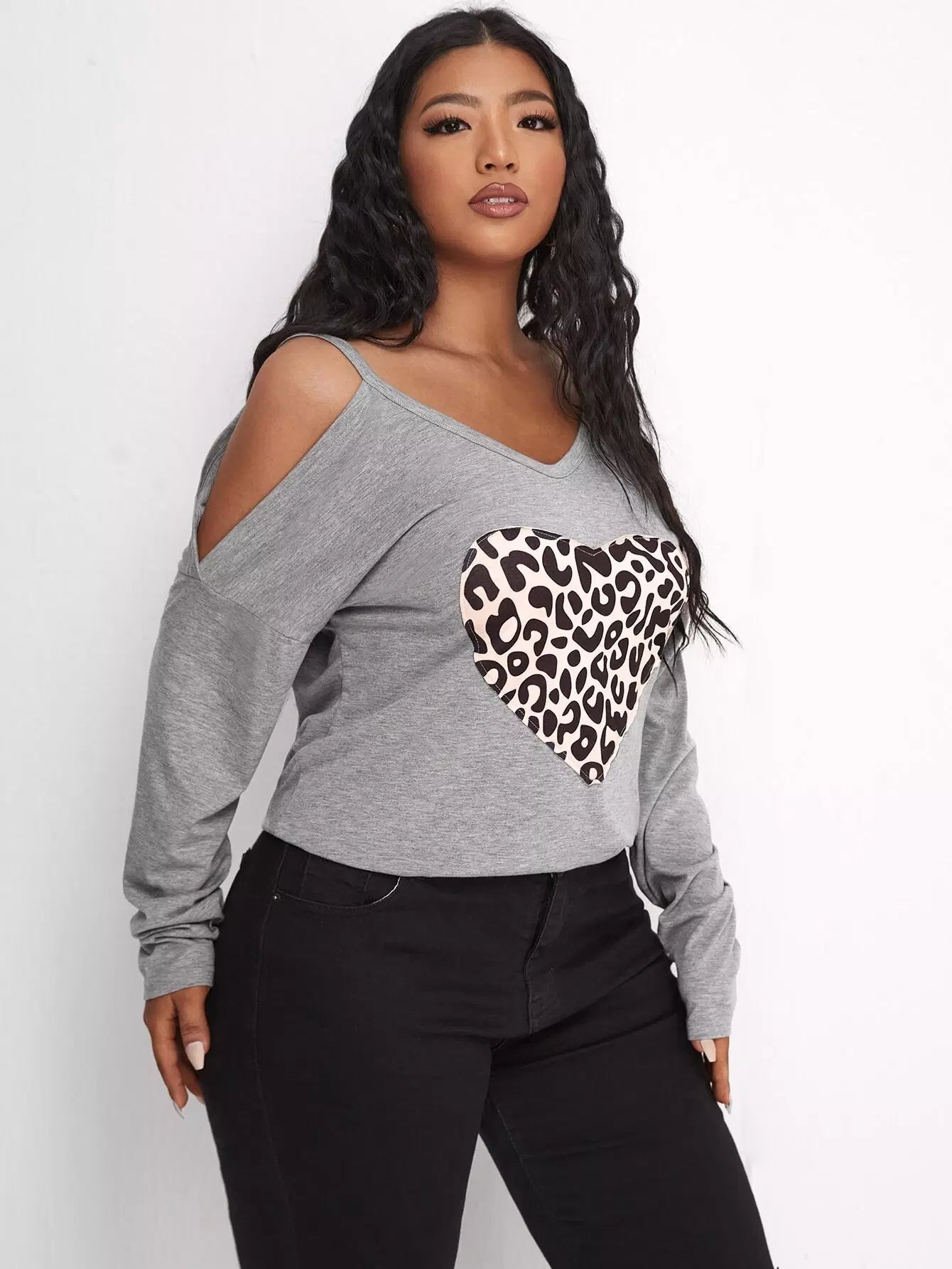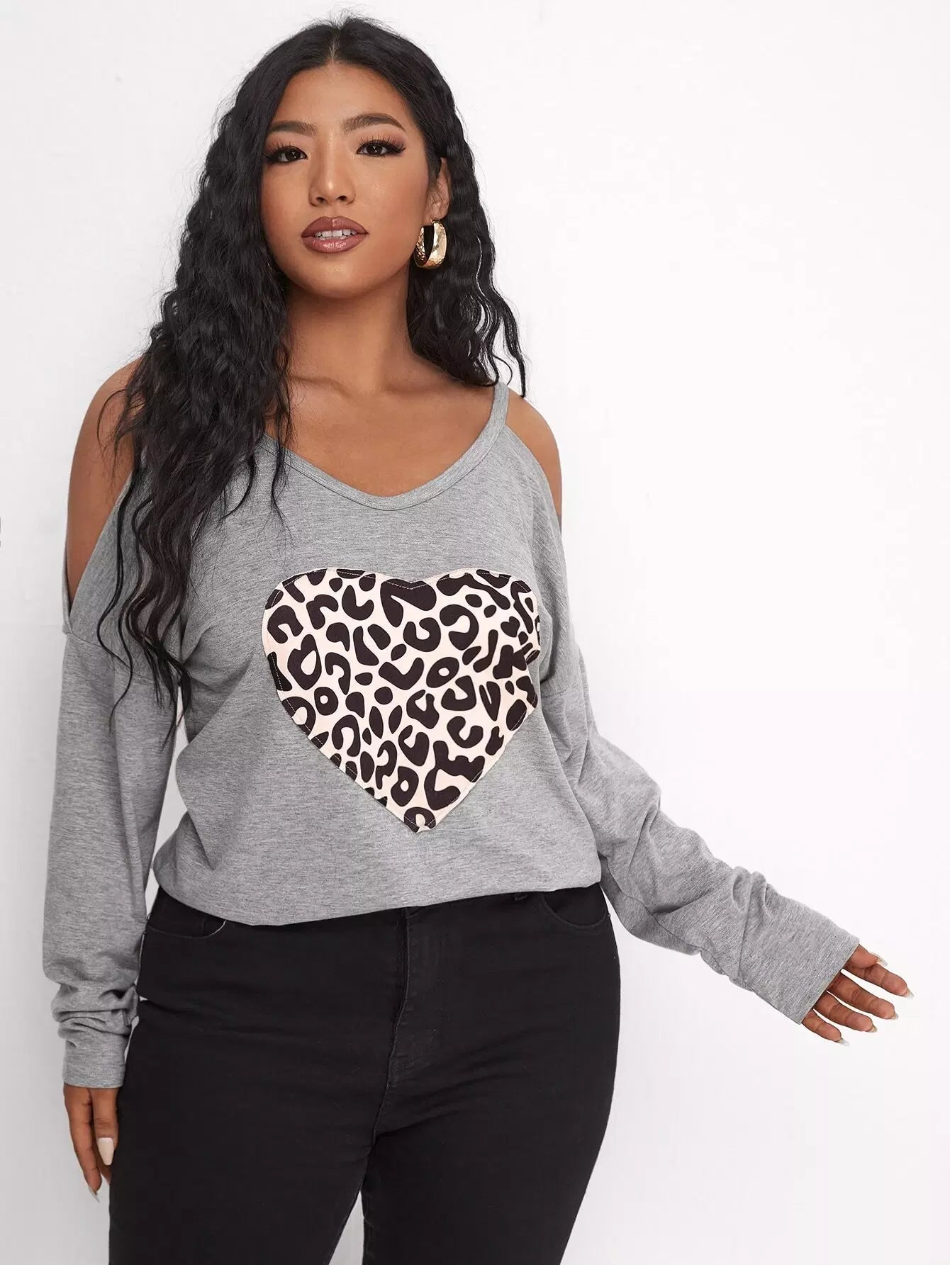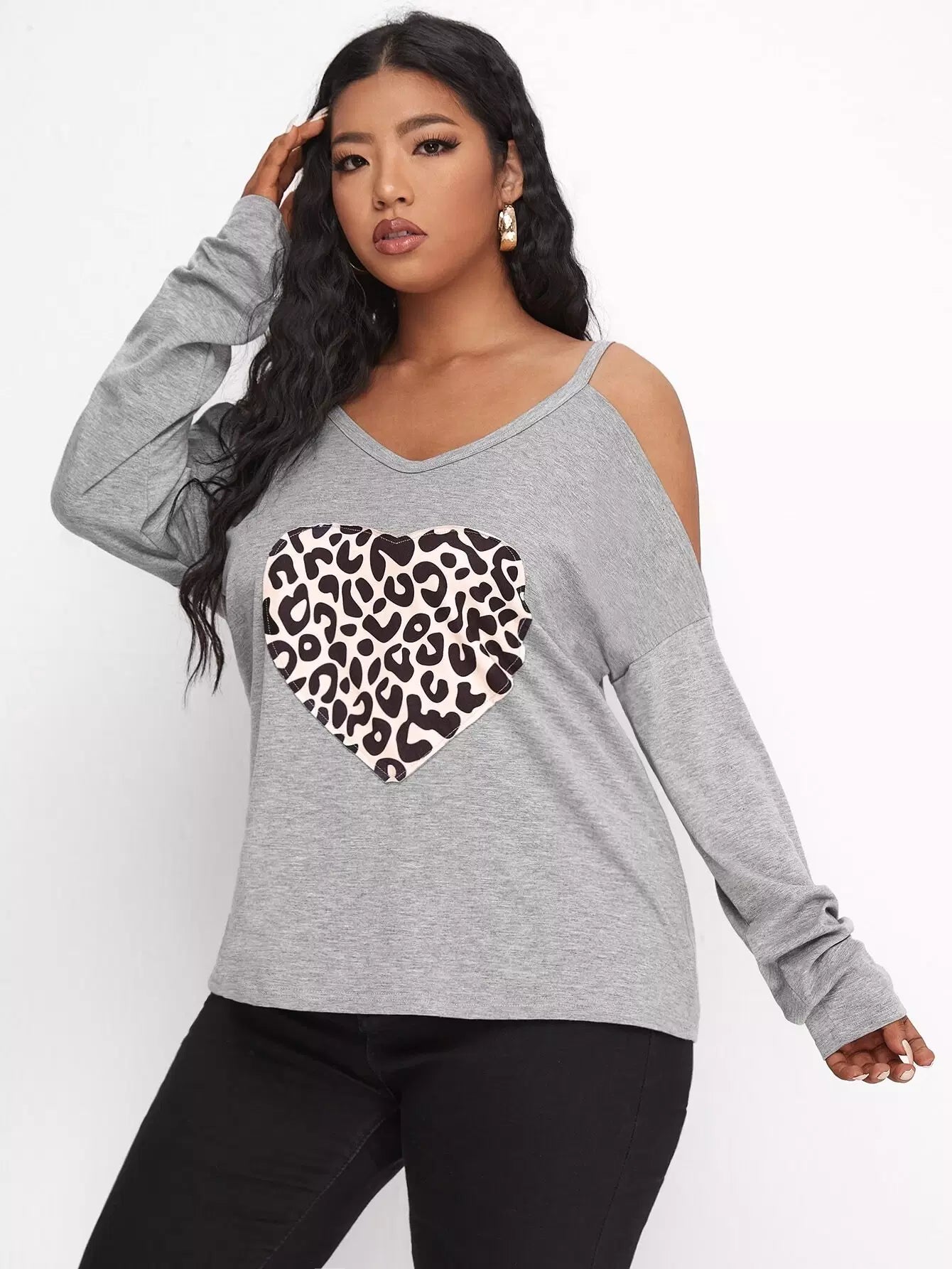 تي شيرت بطبعة قلب على الأكتاف بارد زائد