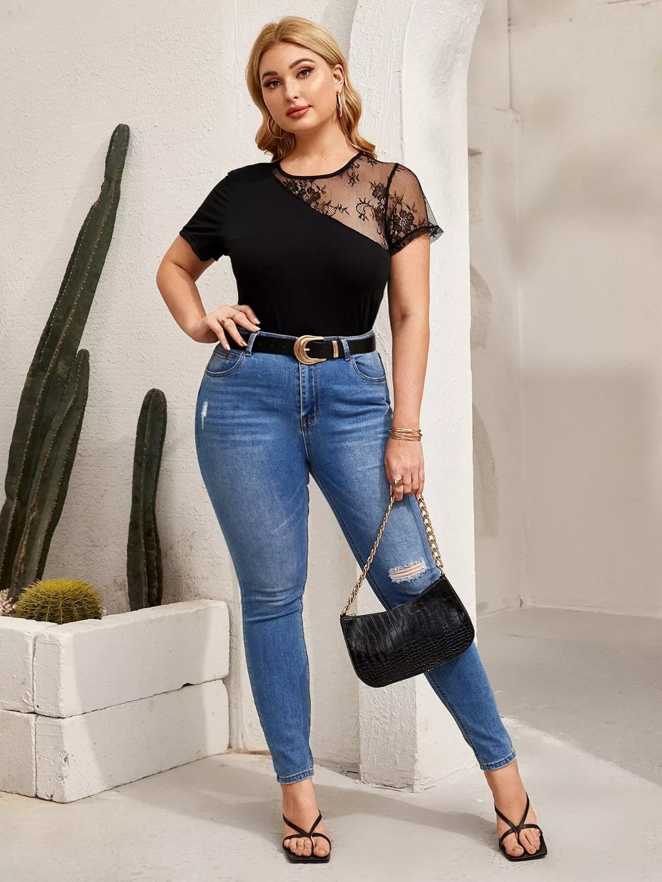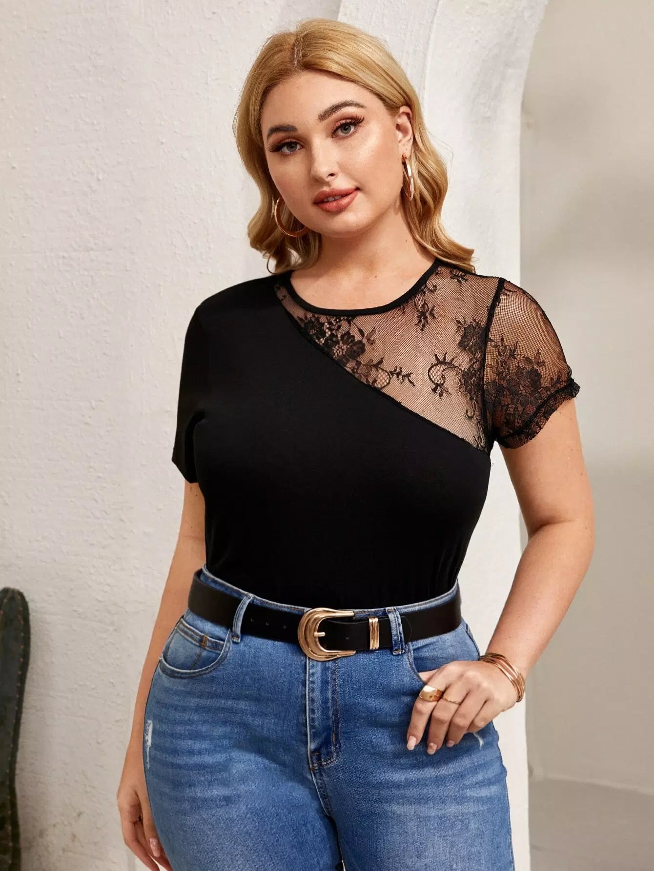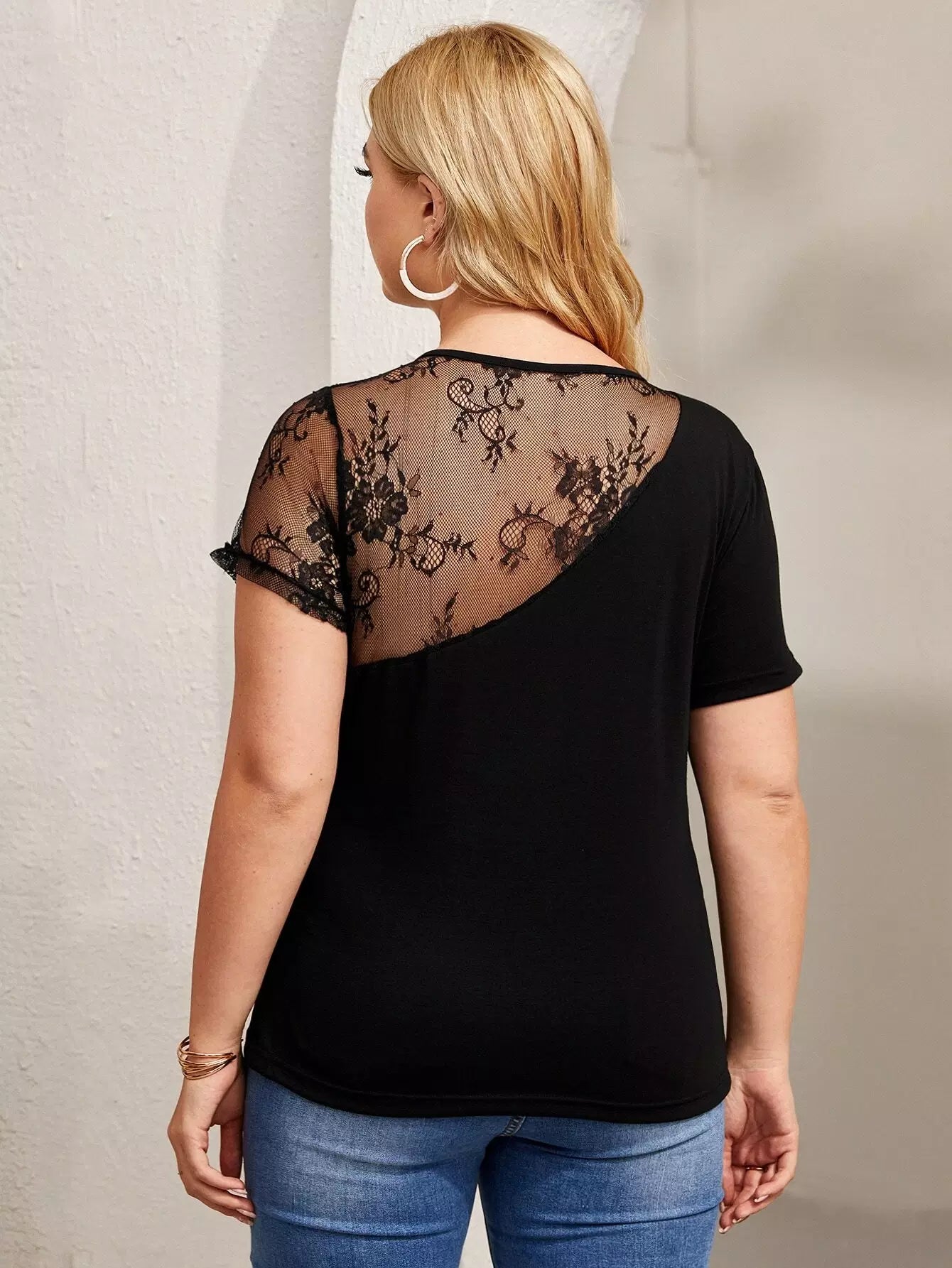 نحيف - مقاس كبير تي شيرت سادة من الدانتيل بلون متباين
