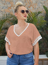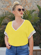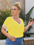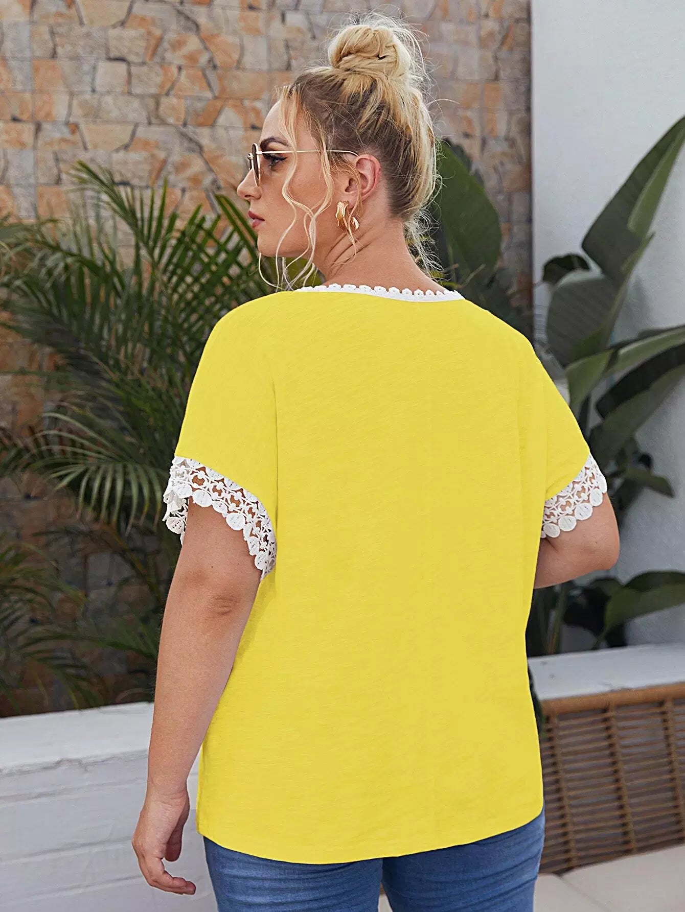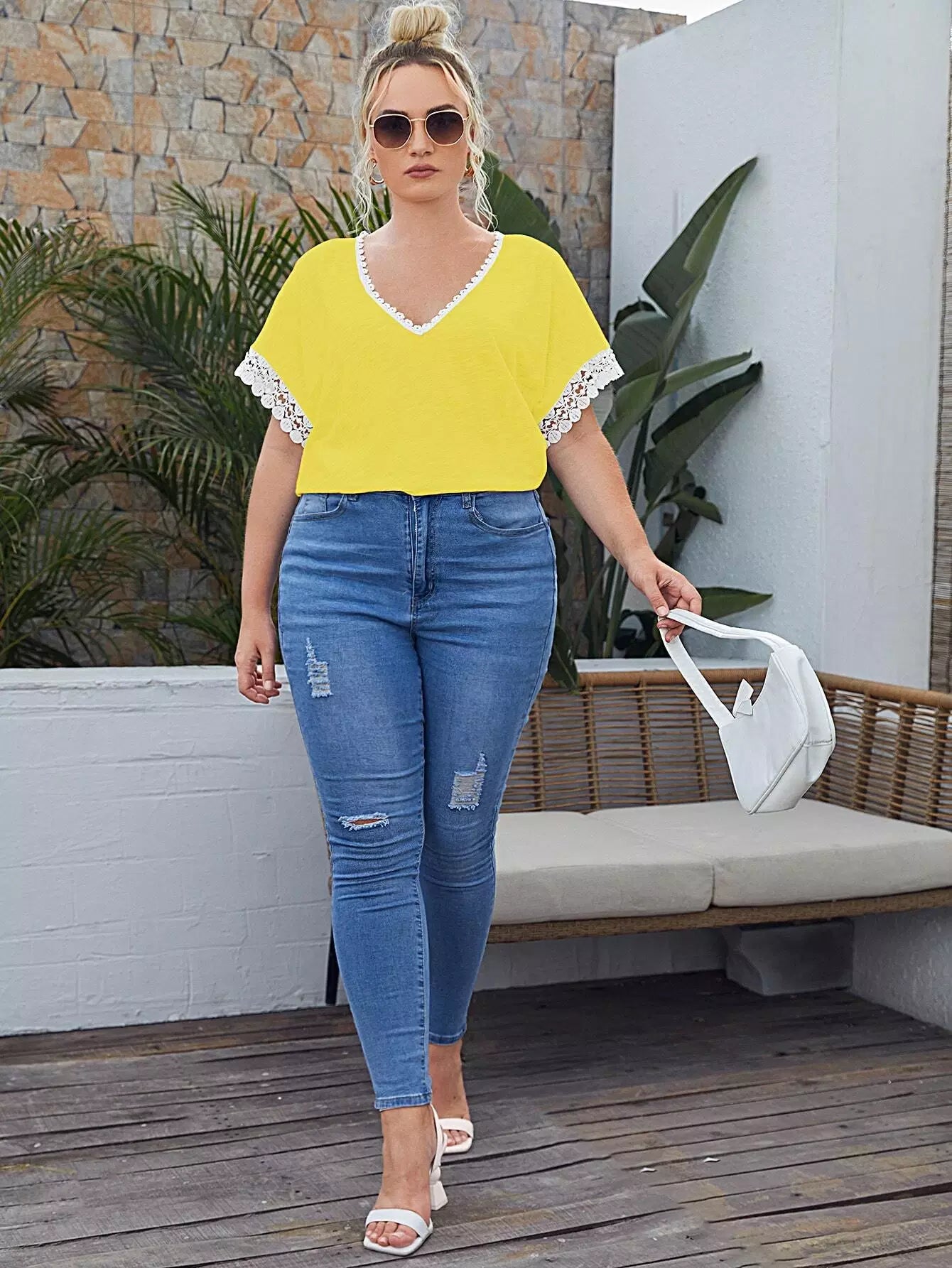 تي شيرت بأكمام دانتيل على شكل V بياقة على شكل V بلون مغاير