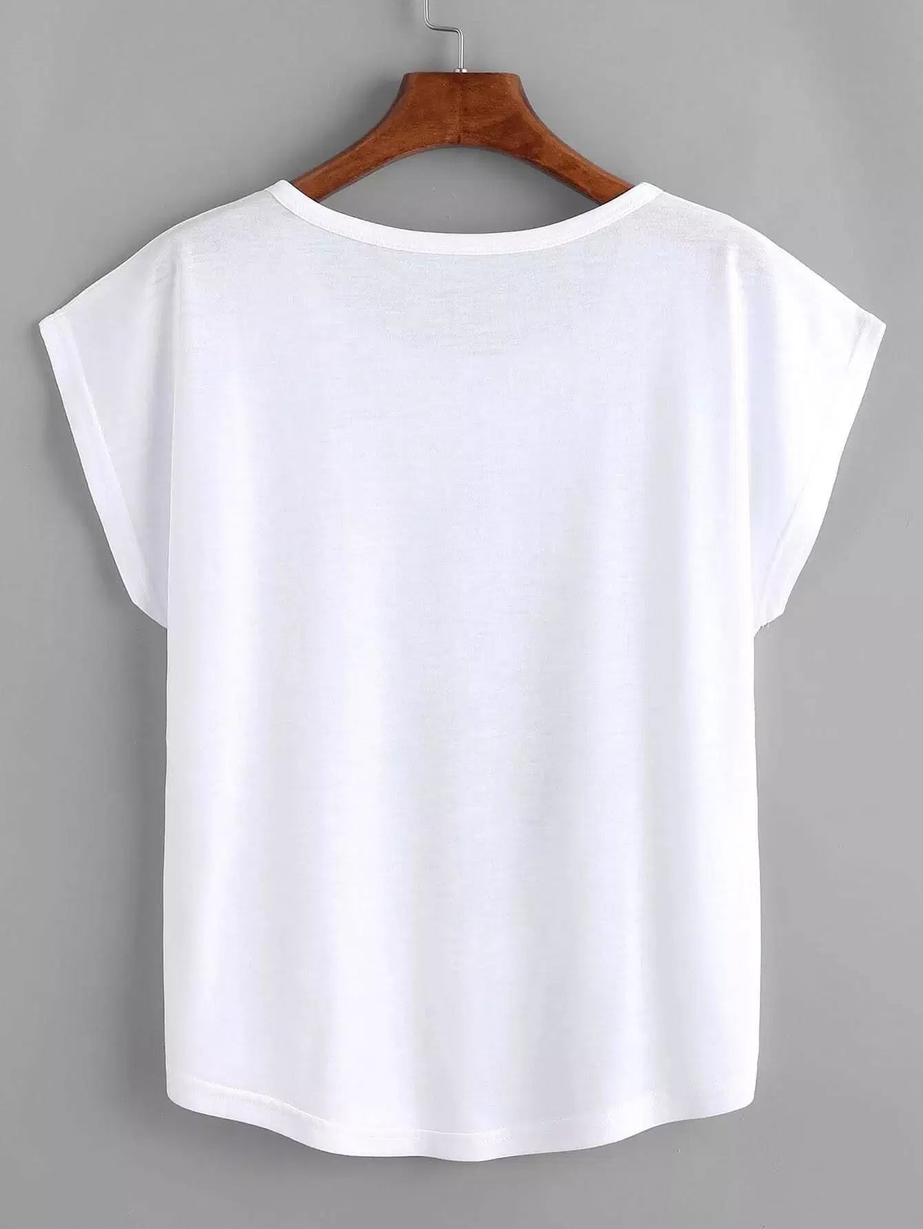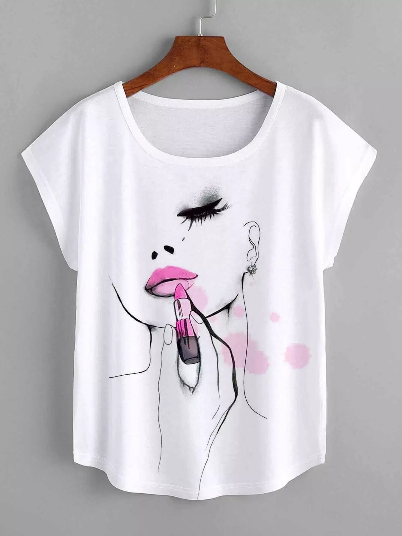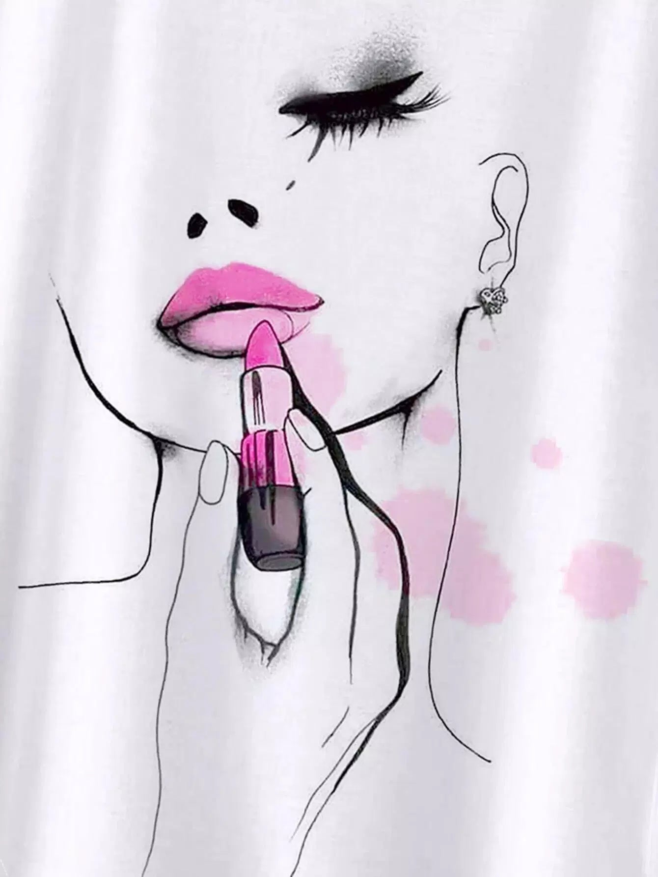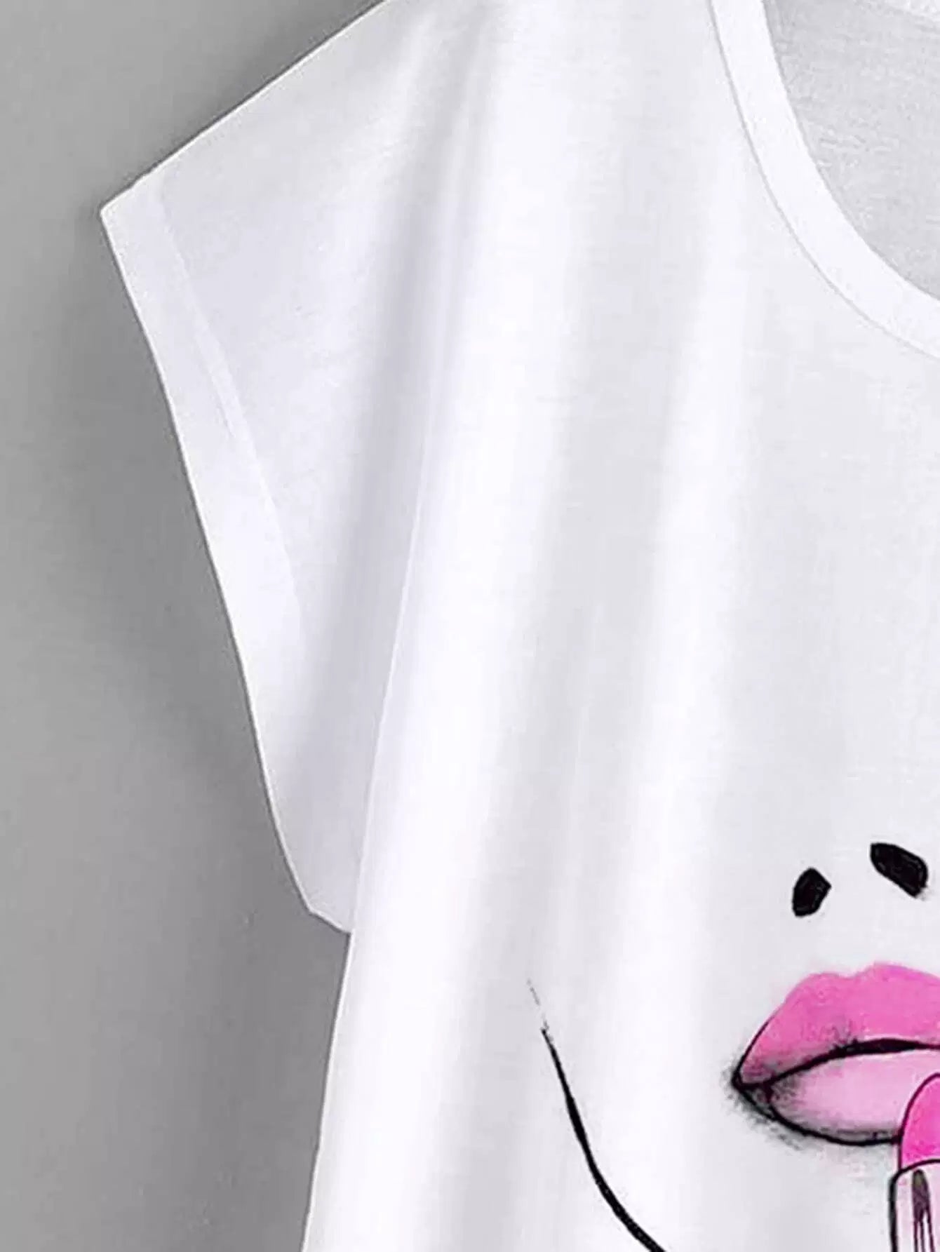 تي شيرت مطبوع عليه شكل زائد وأحمر شفاه مطبوع