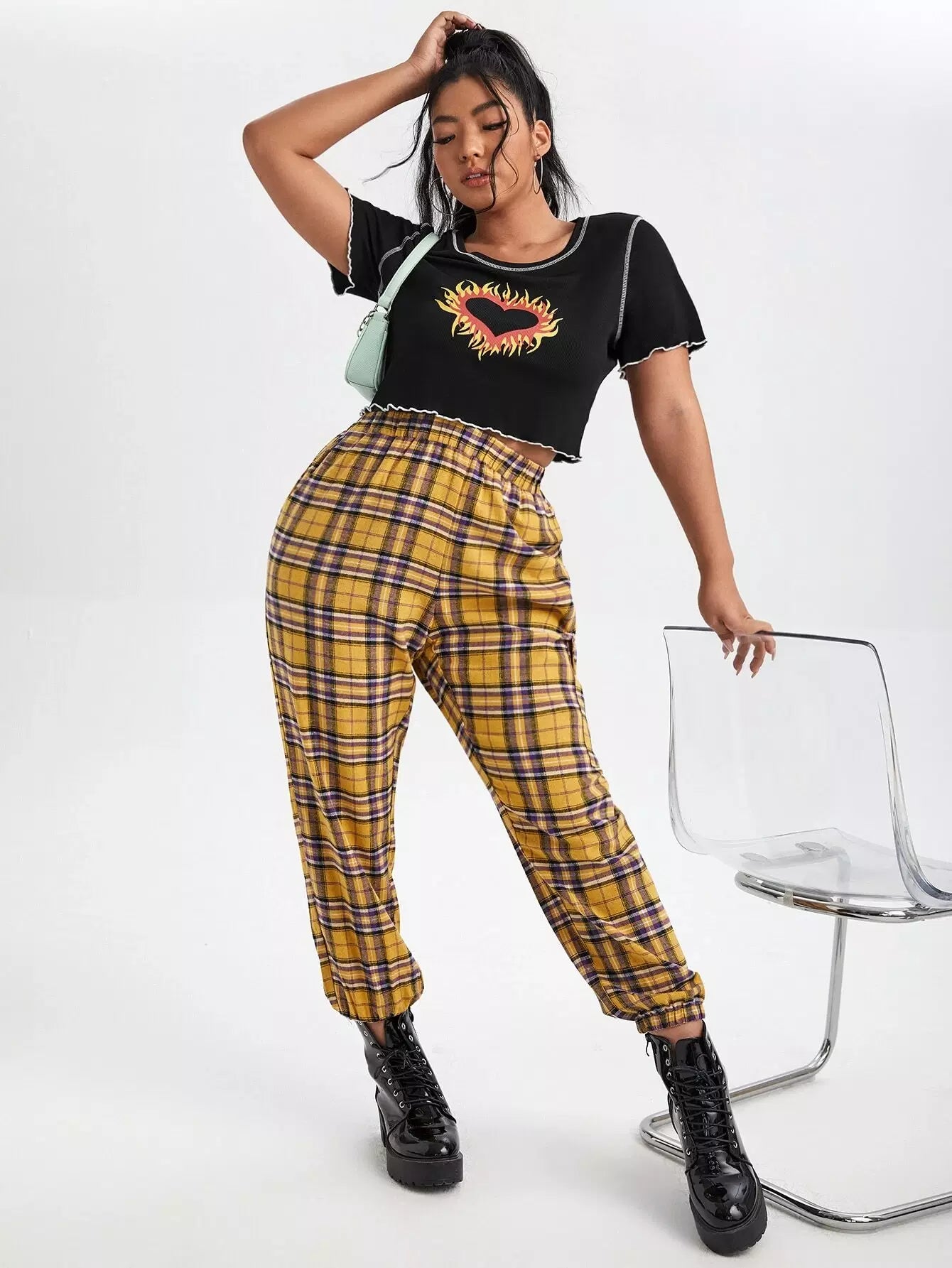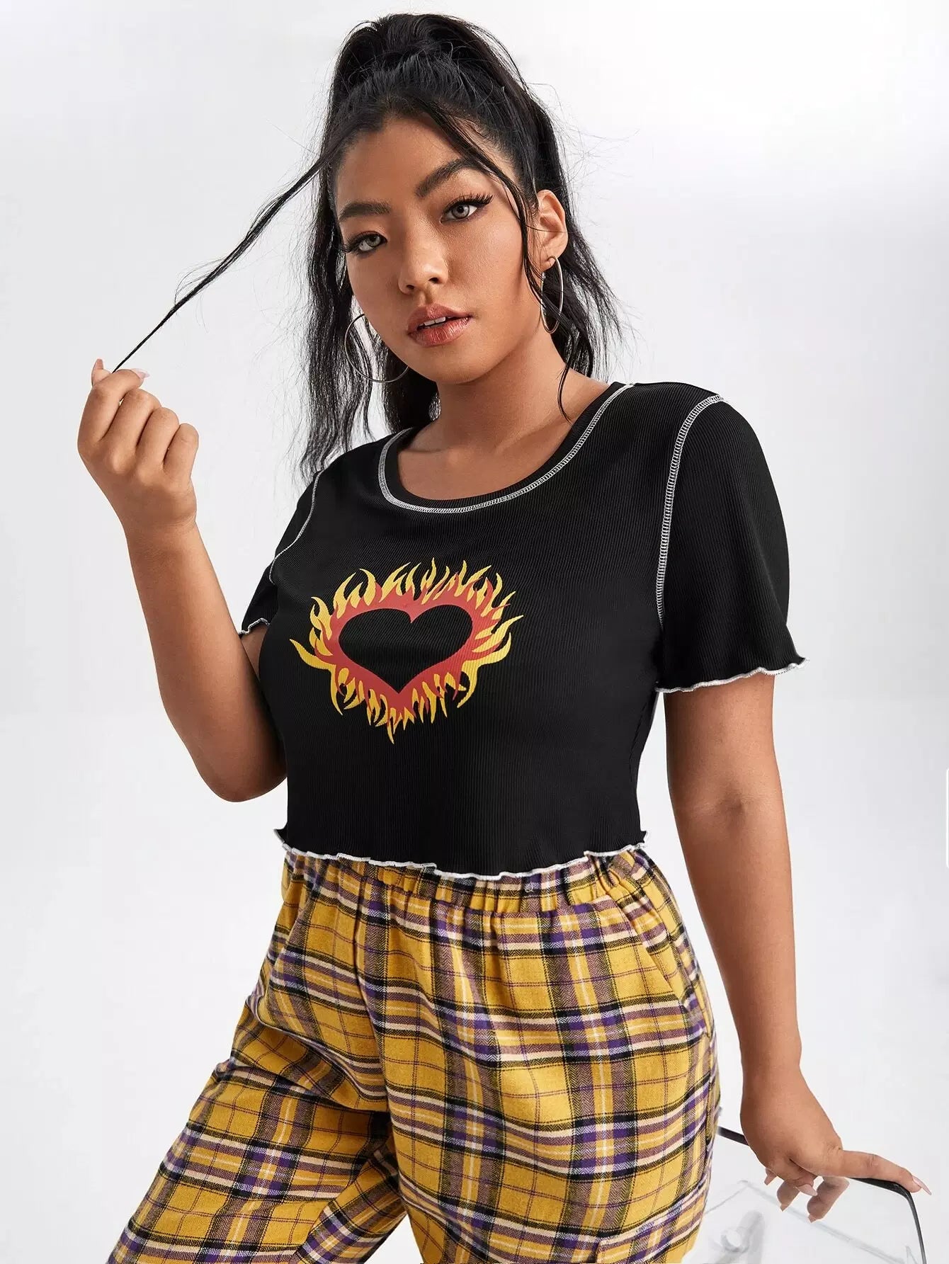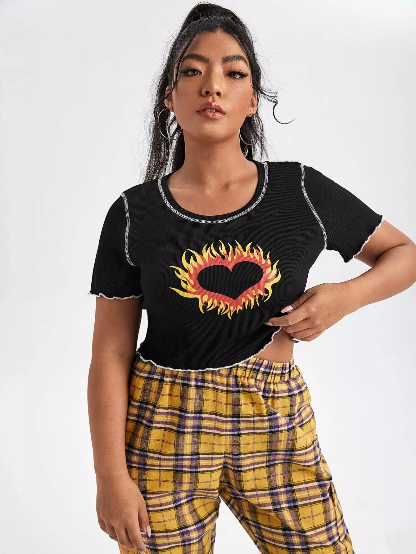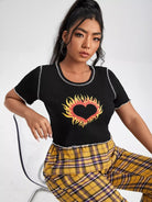 تي شيرت بطبعة قلب ونار مطبوع عليه طبعة قلب ونار بلون مغاير