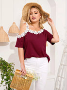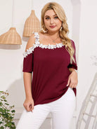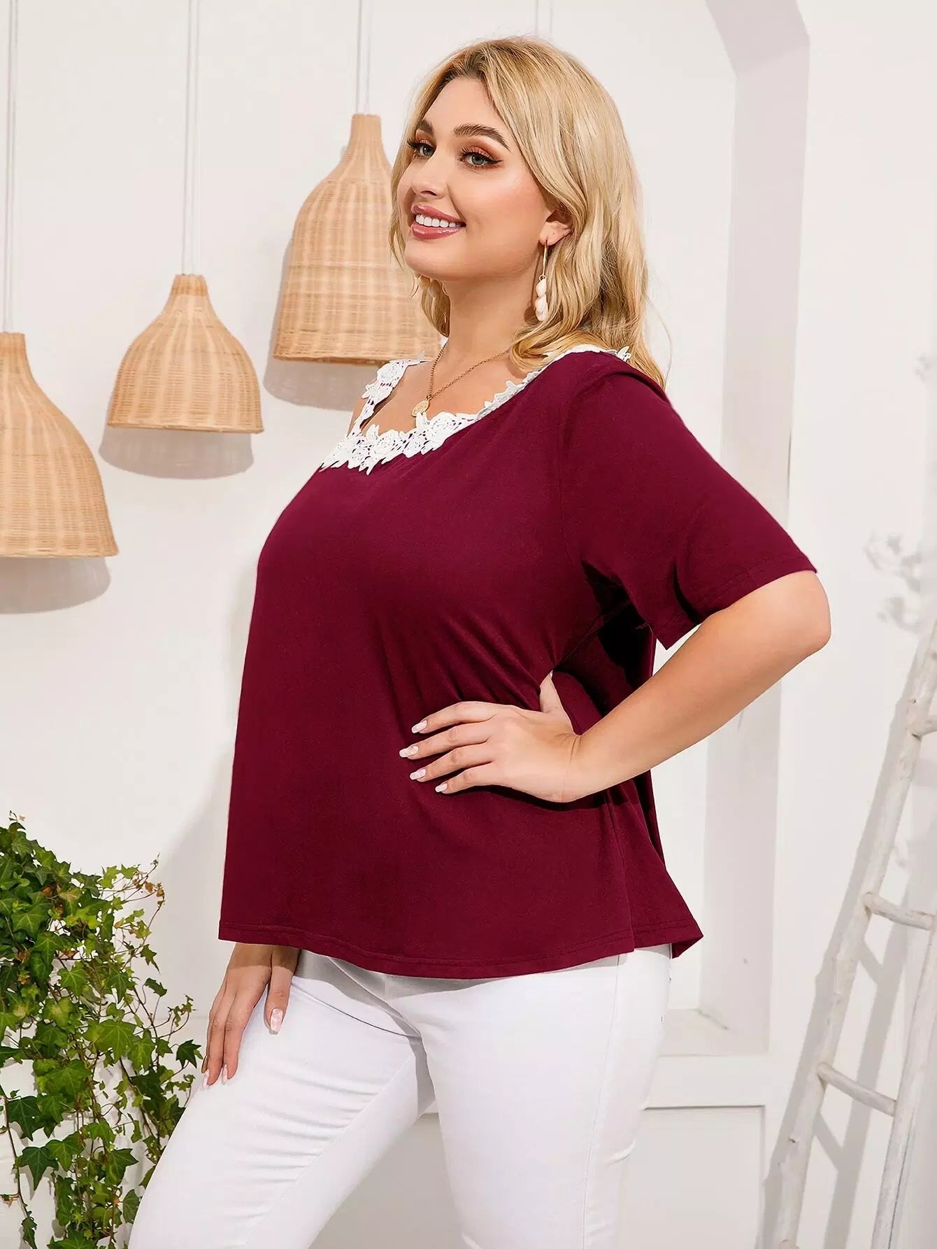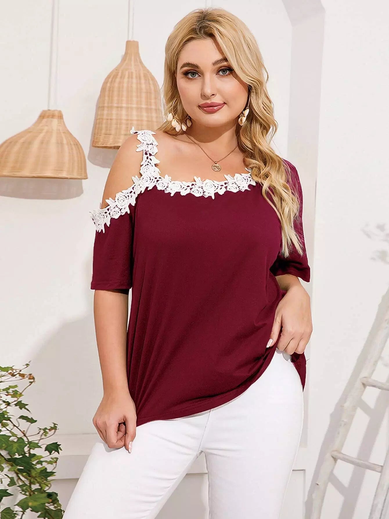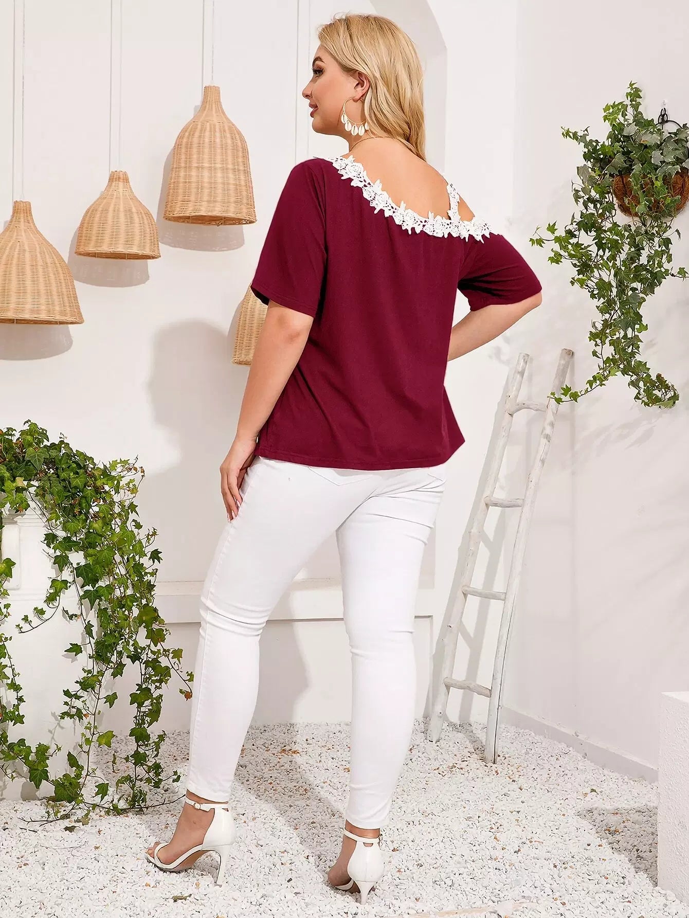 تي شيرت برقبة غير متناسقة من الدانتيل بلس
