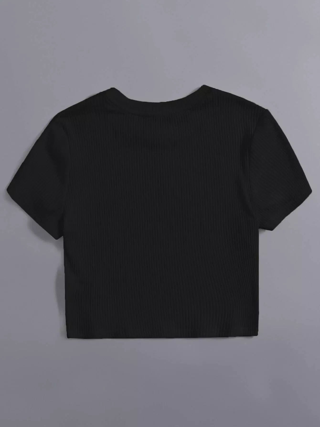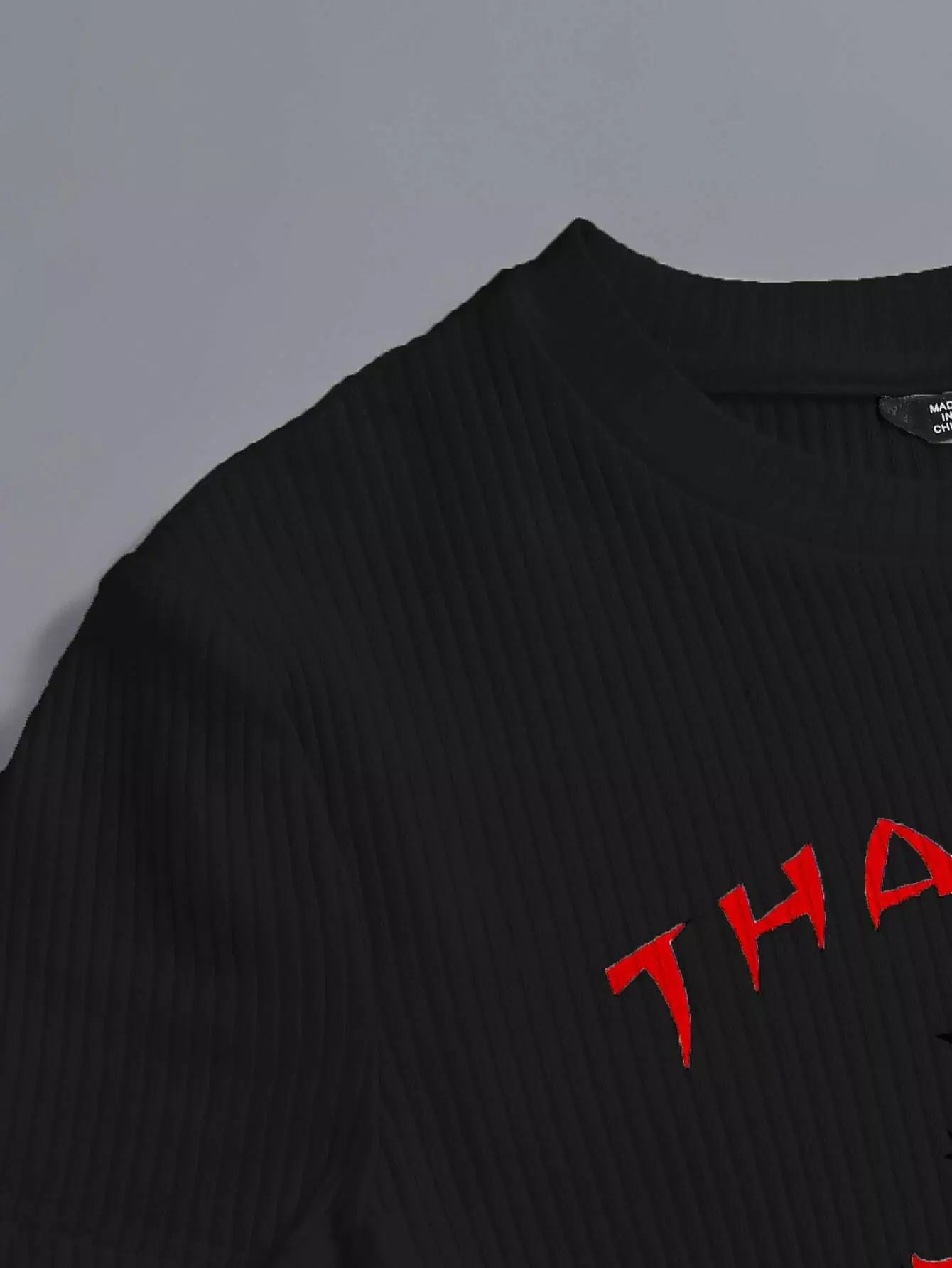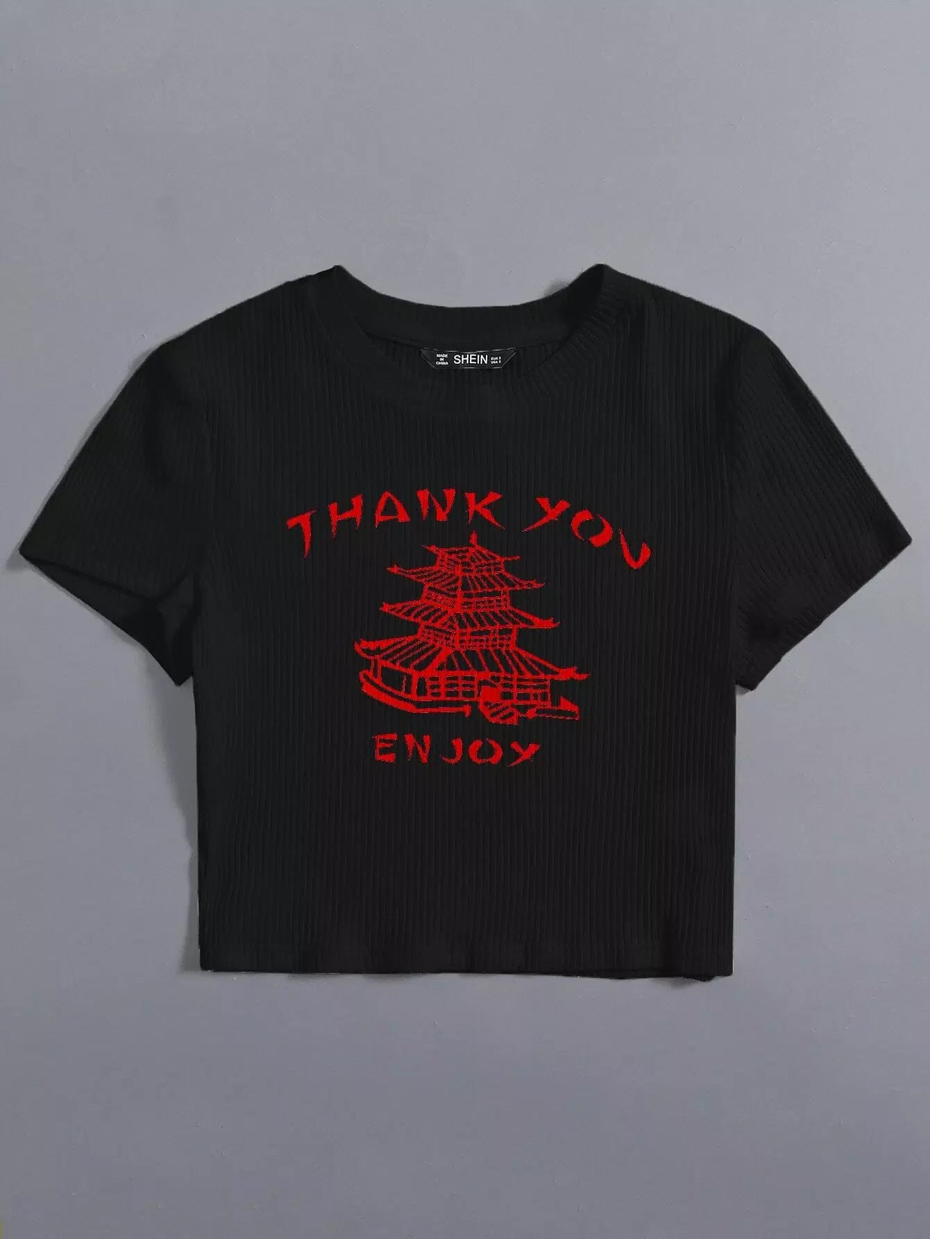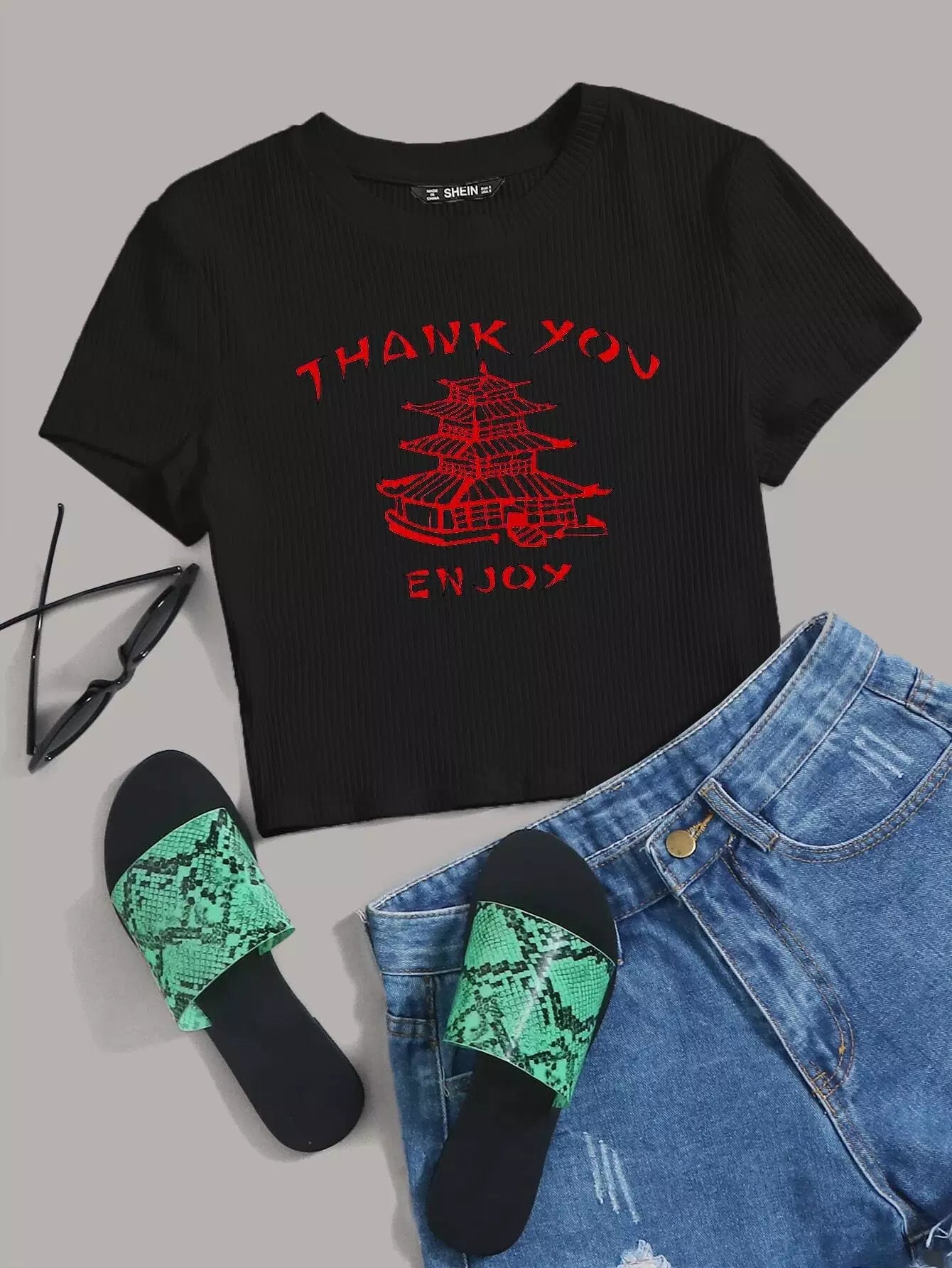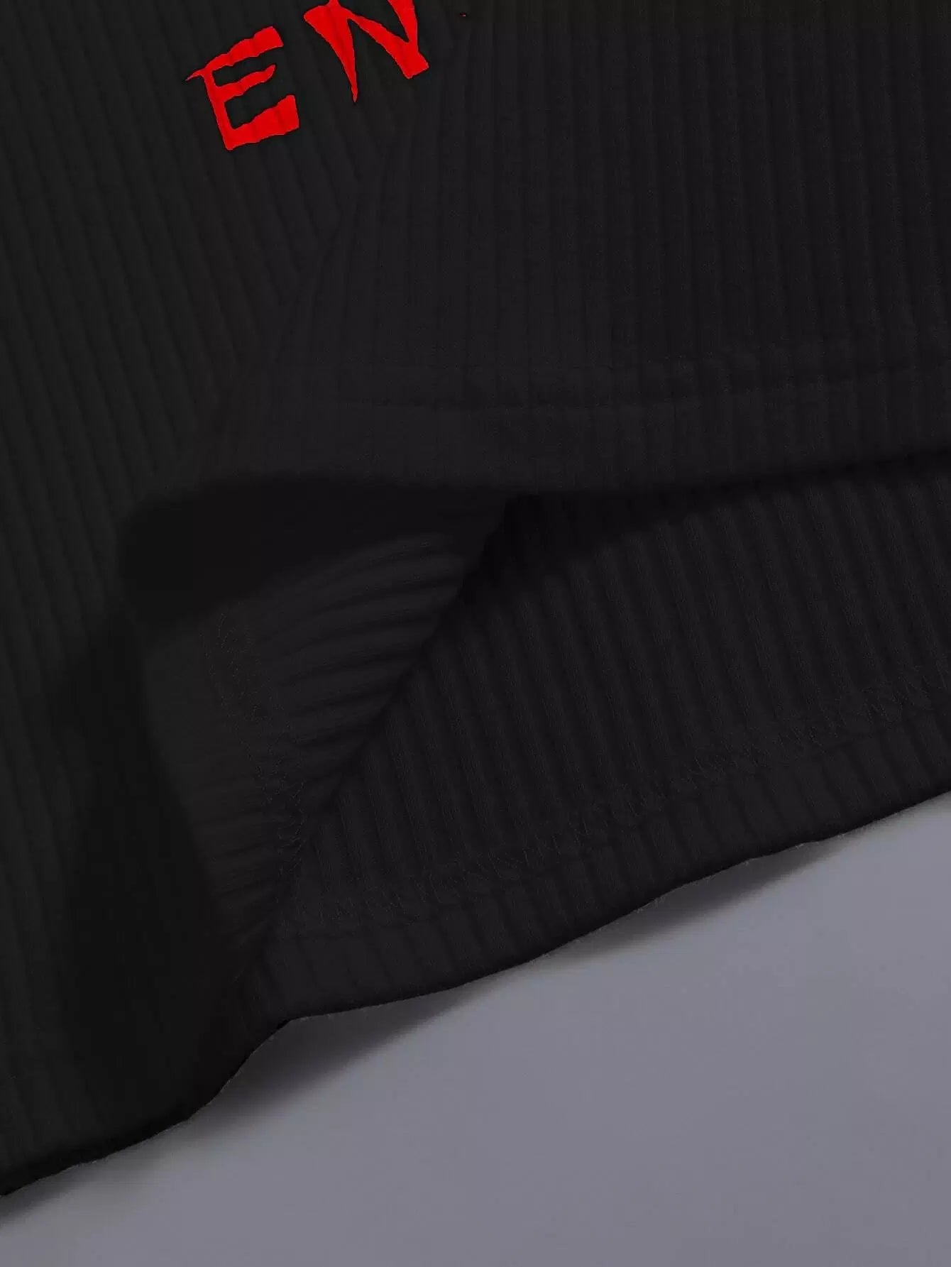 تي شيرت بطبعة حروف ورسومات جرافيك محبوكة على شكل ضلع