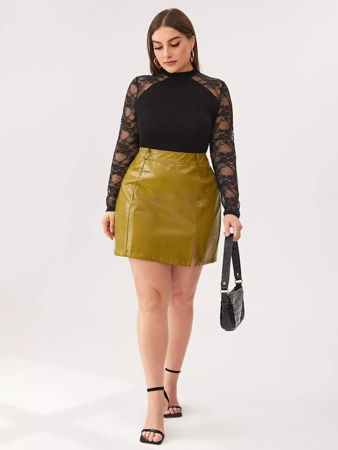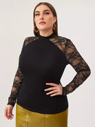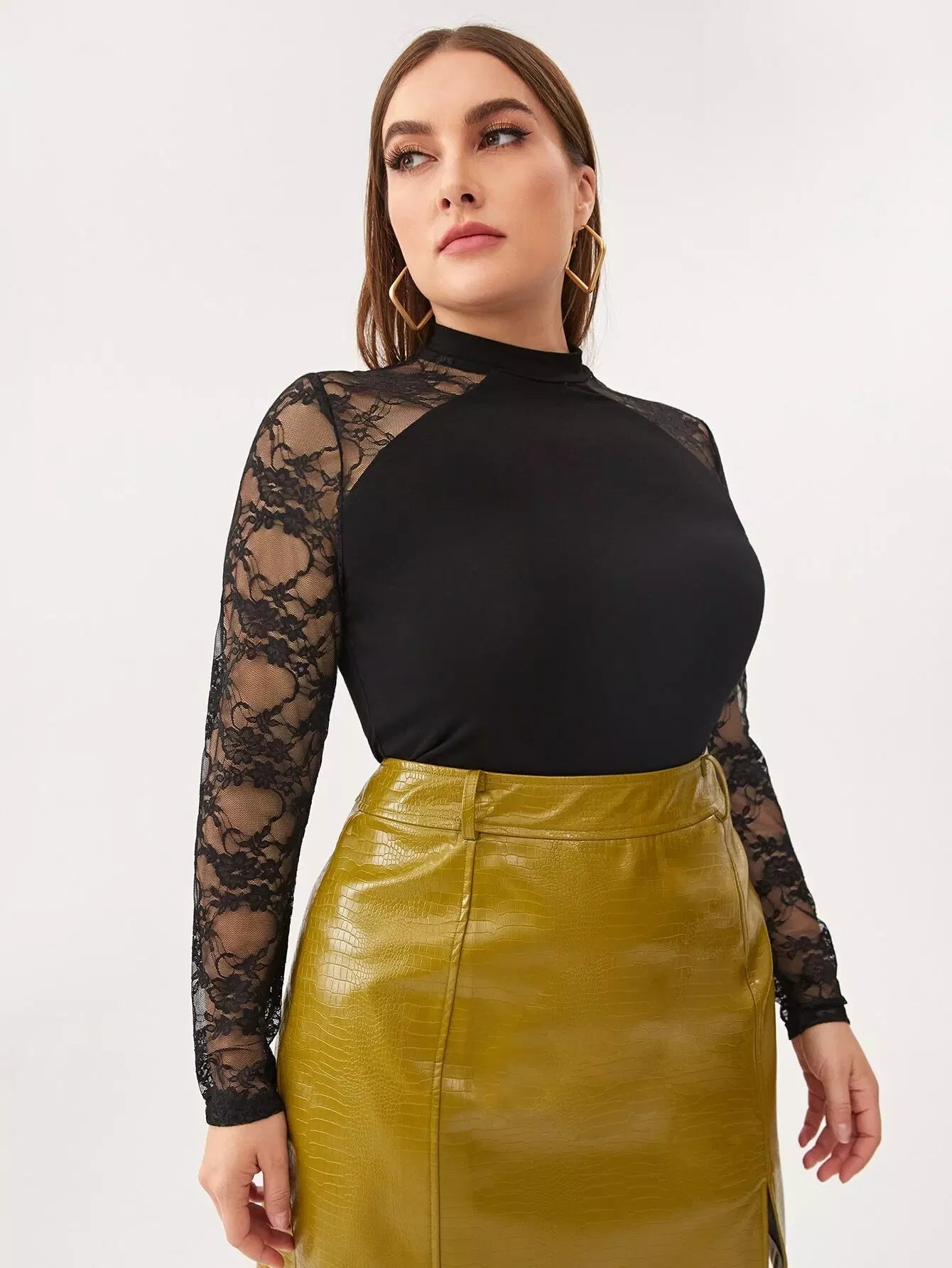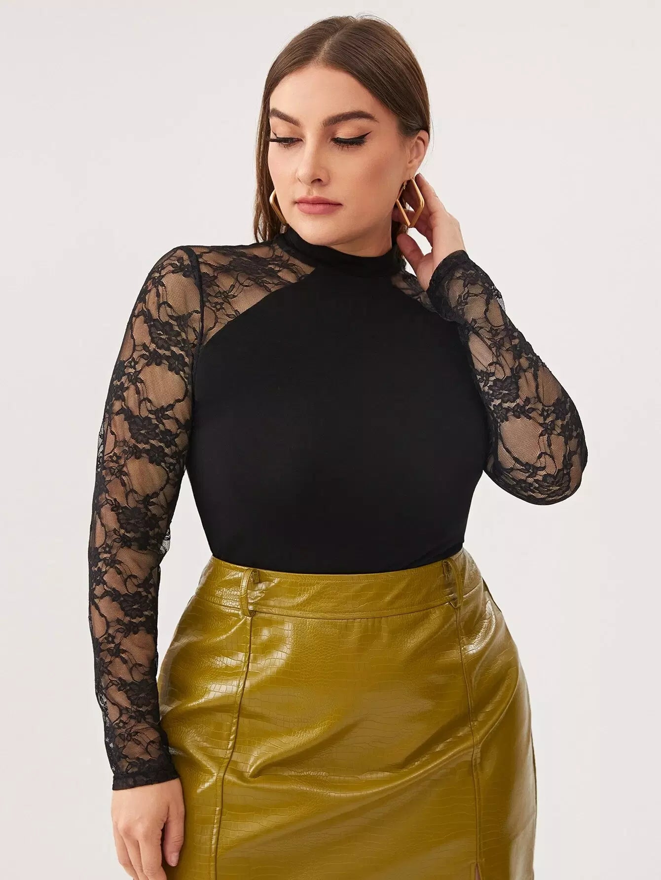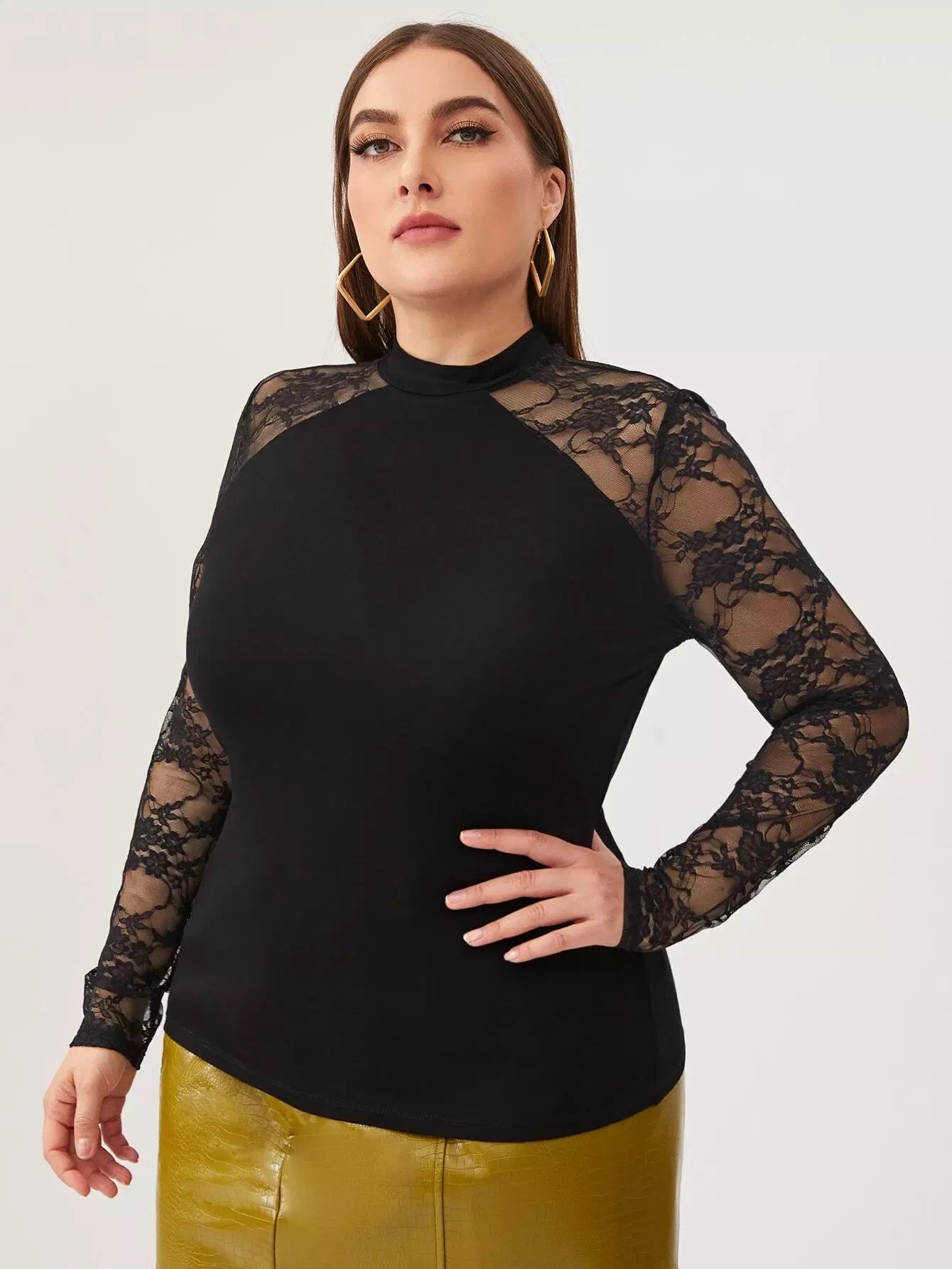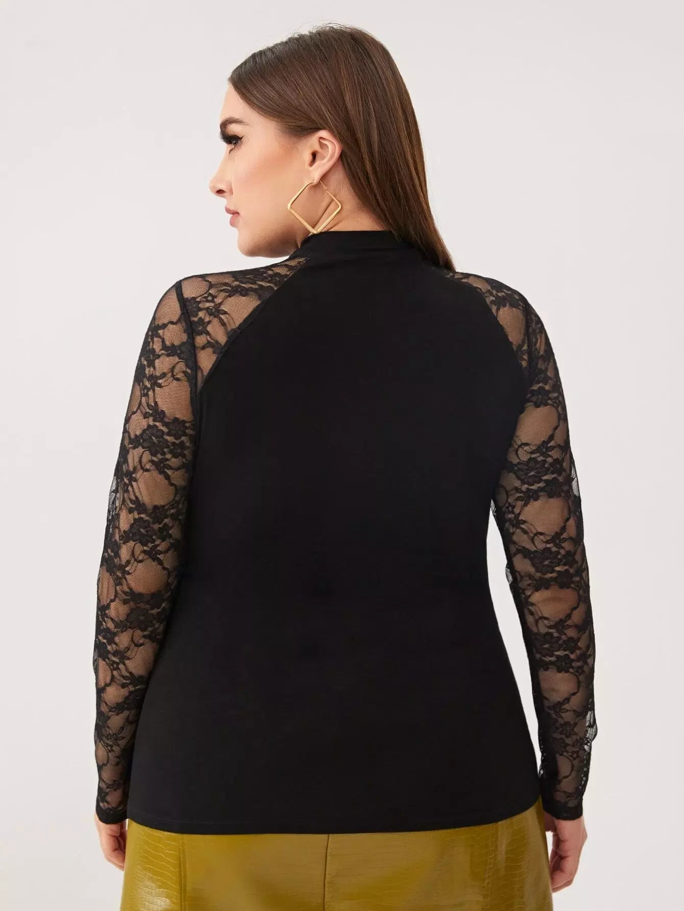 تي شيرت بأكمام دانتيل برقبة زائد برقبة زائدة