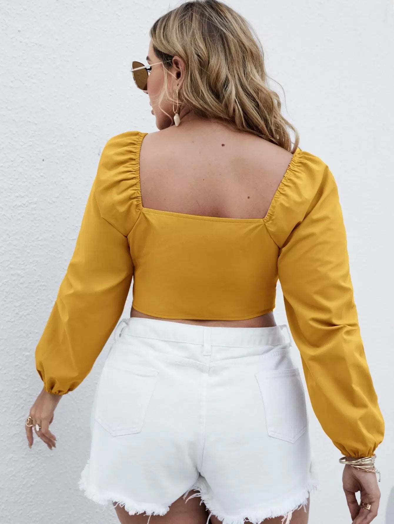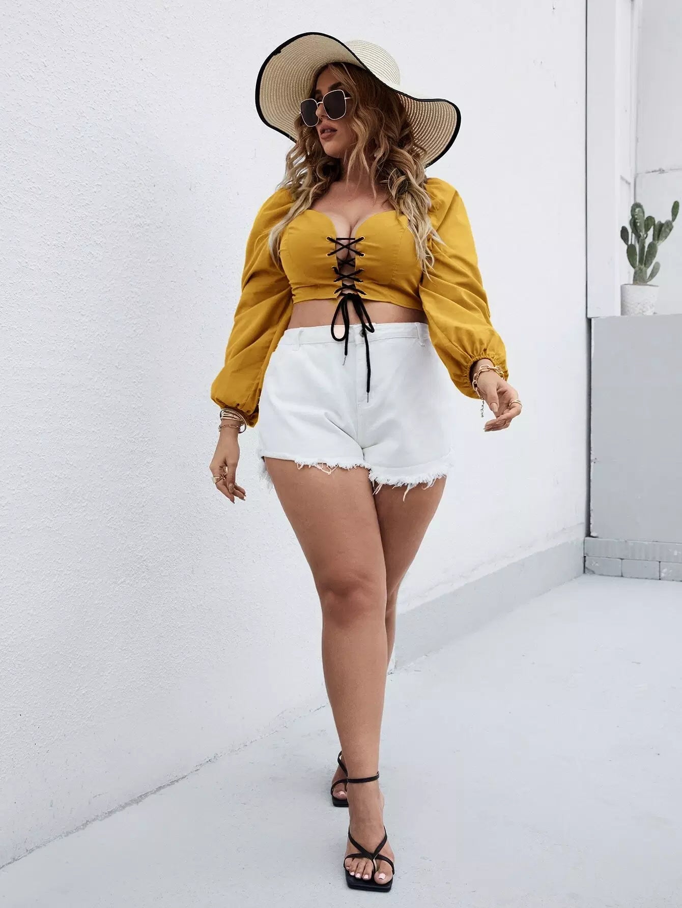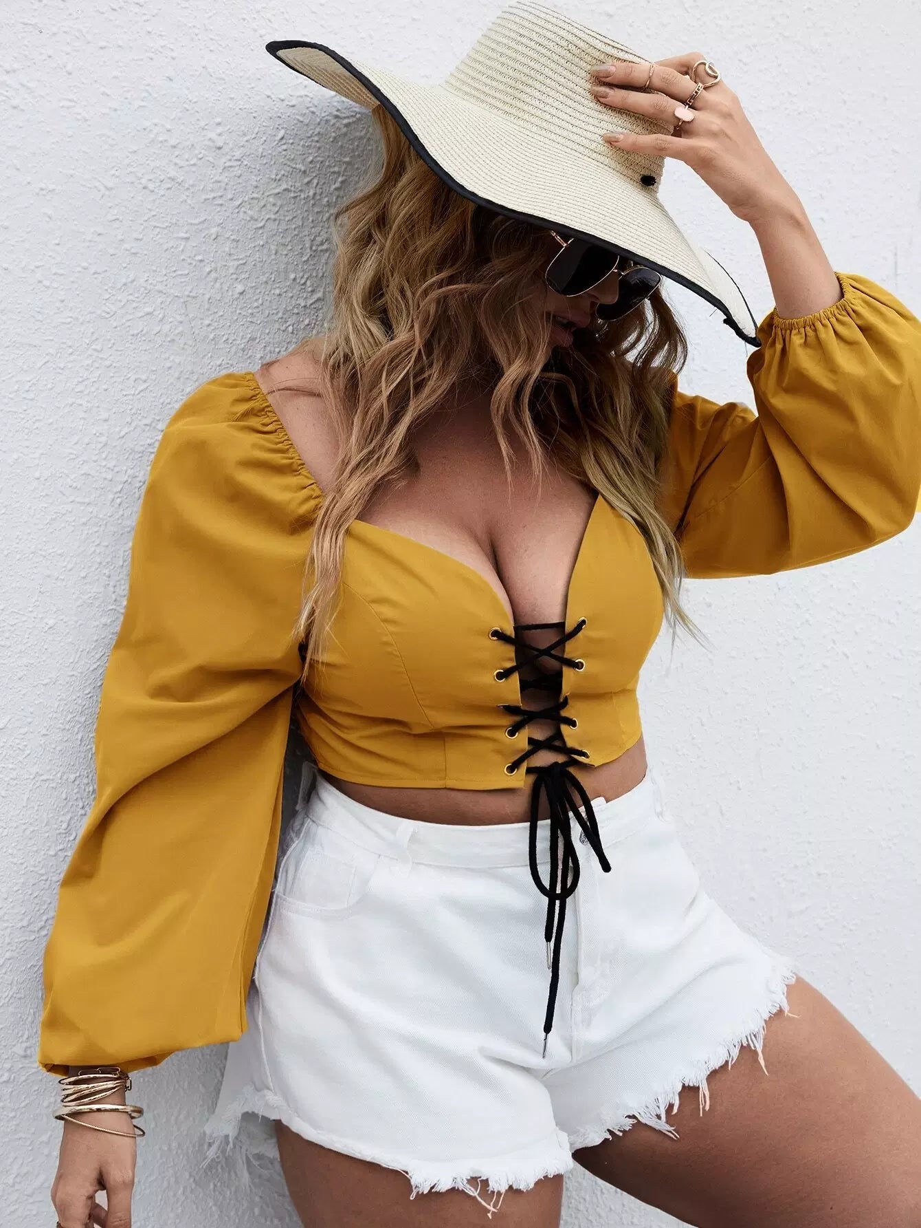 بلوزة قصيرة قصيرة بدون أكمام سادة بأربطة فوقها رباط