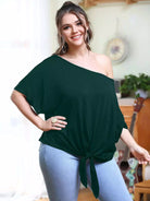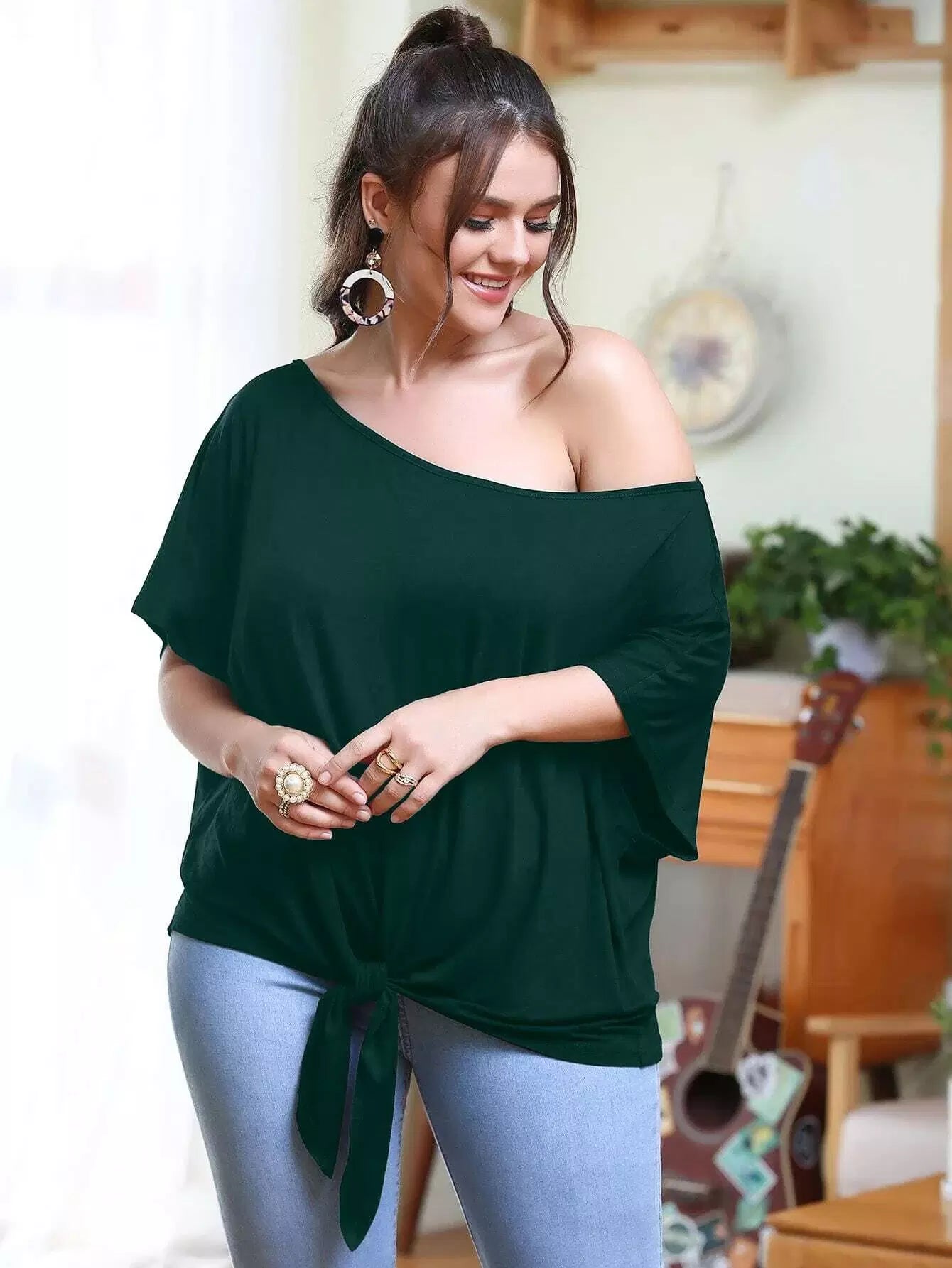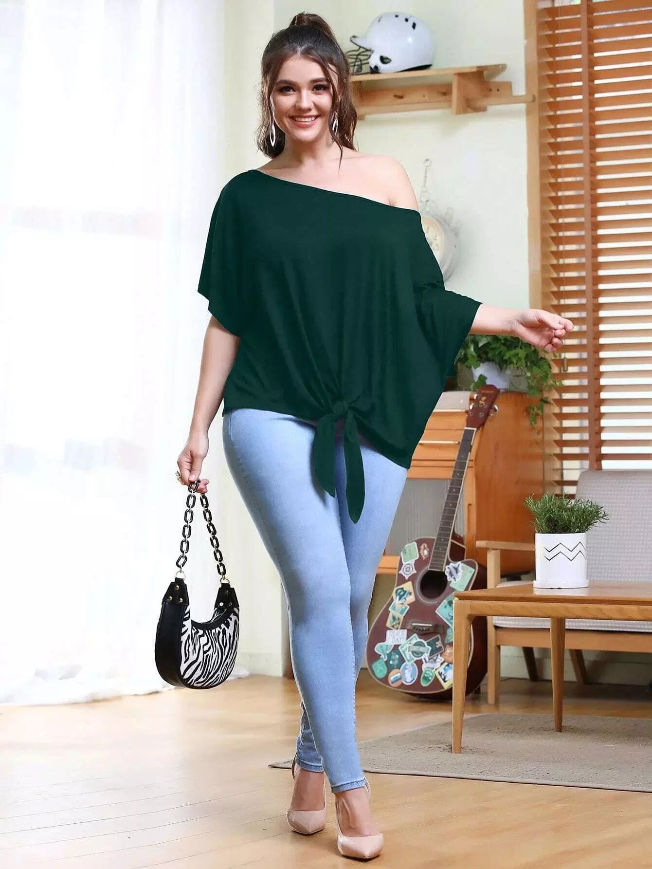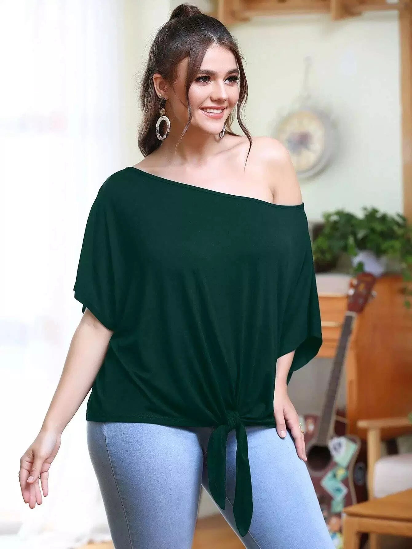 تي شيرت بعقدة كتف مائلة سادة بلس