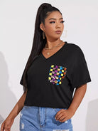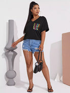 تي شيرت مرقع بالترتر على شكل V بياقة على شكل V