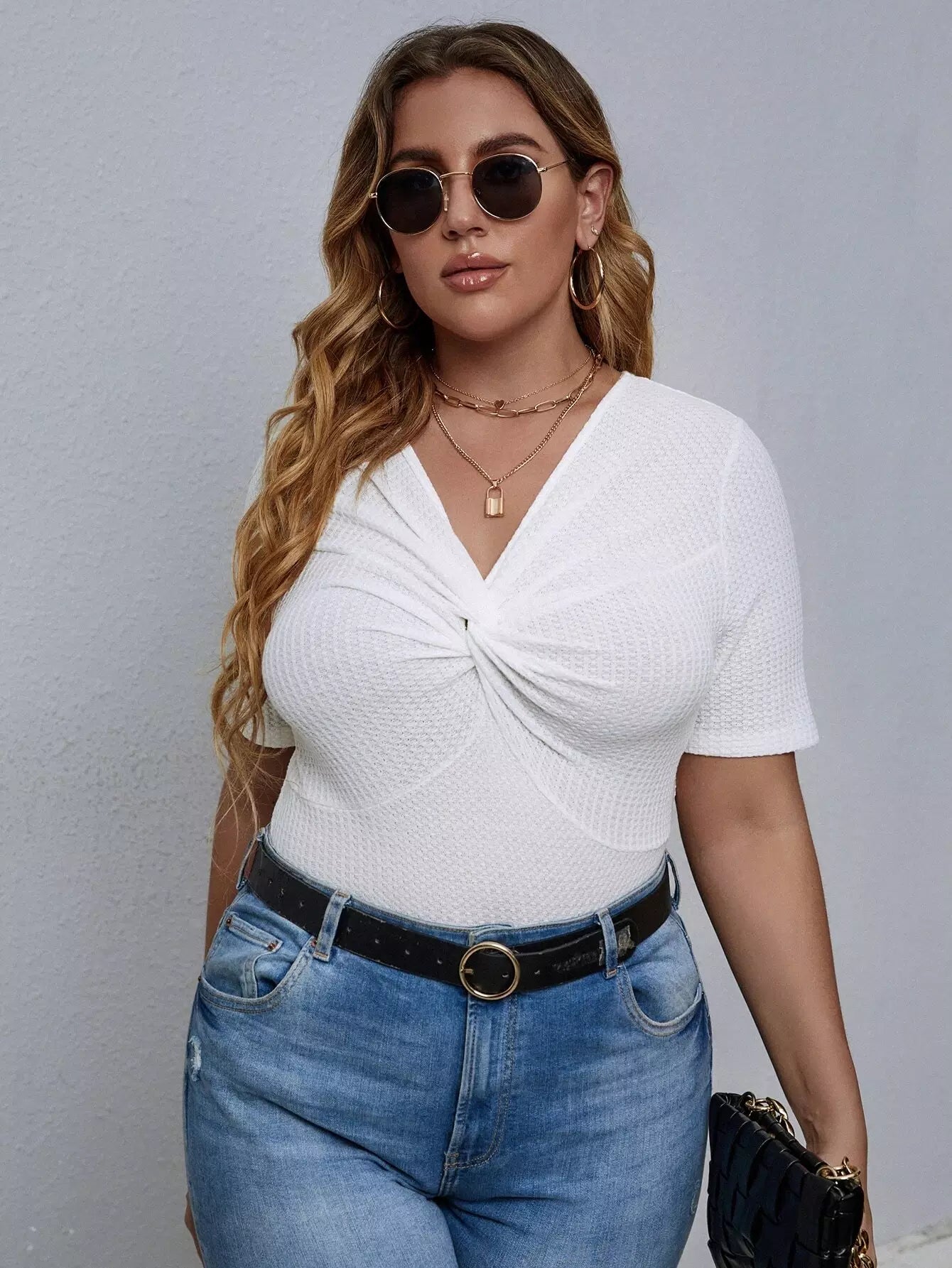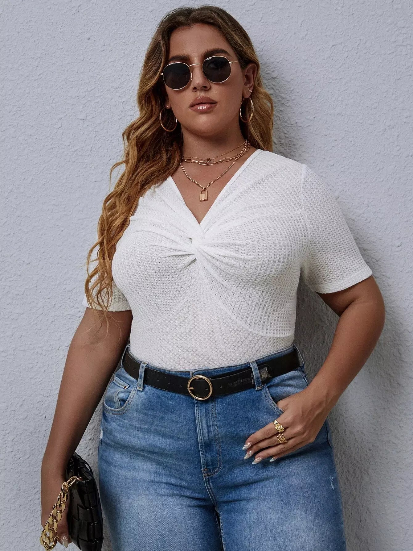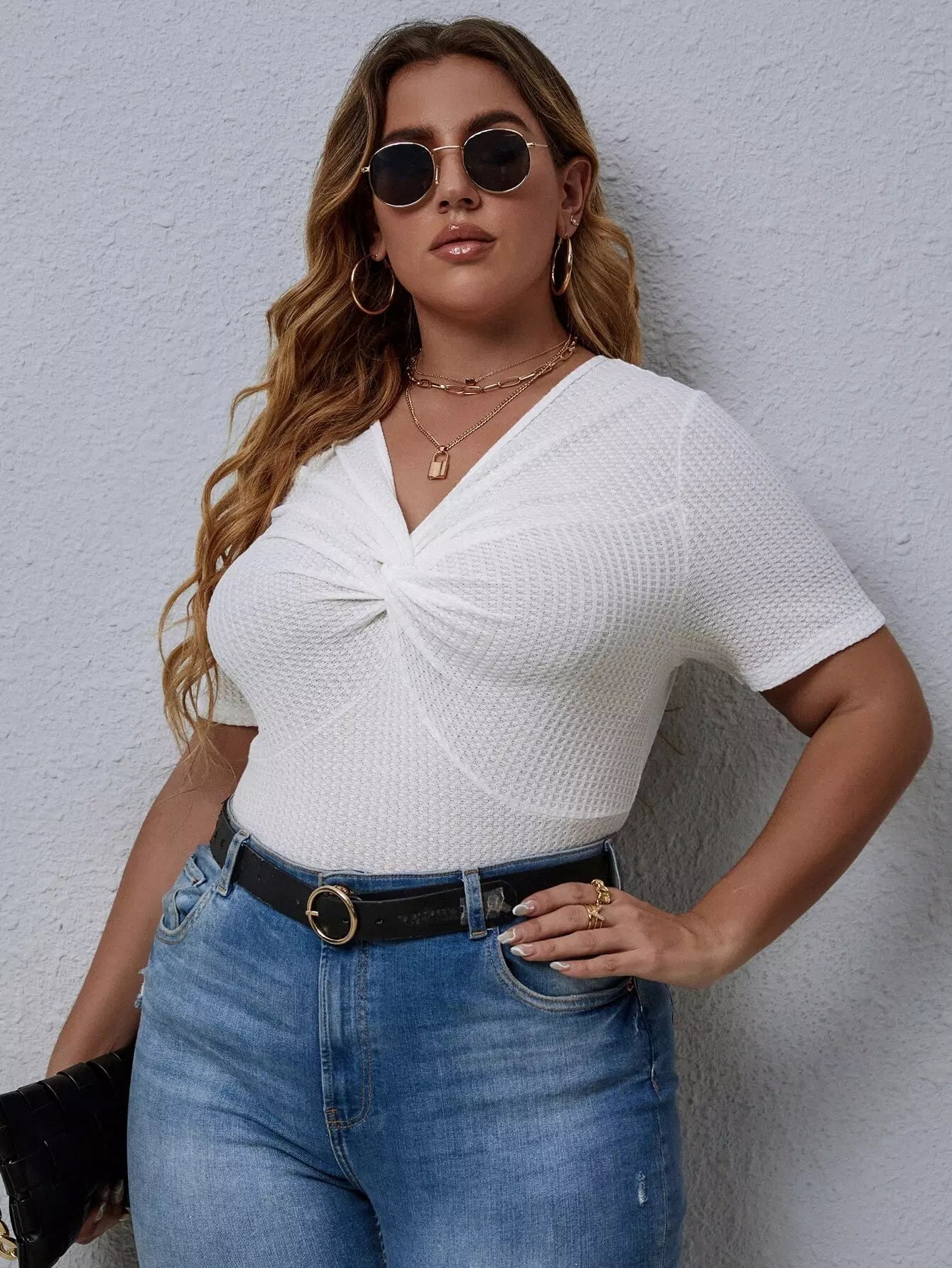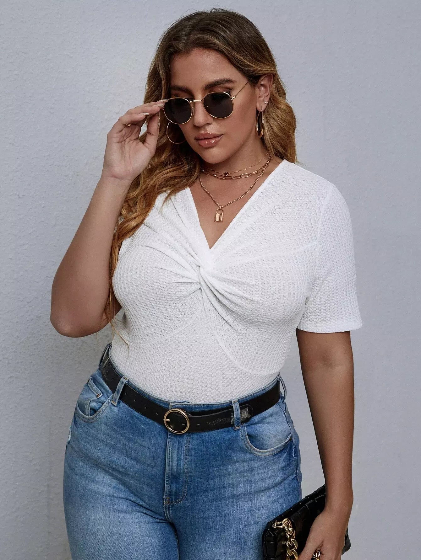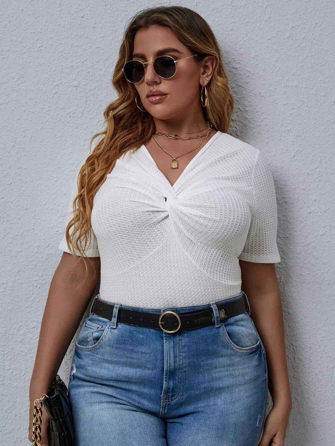 تي شيرت بلس محبوك من الأمام بفتحة أمامية ملتوية