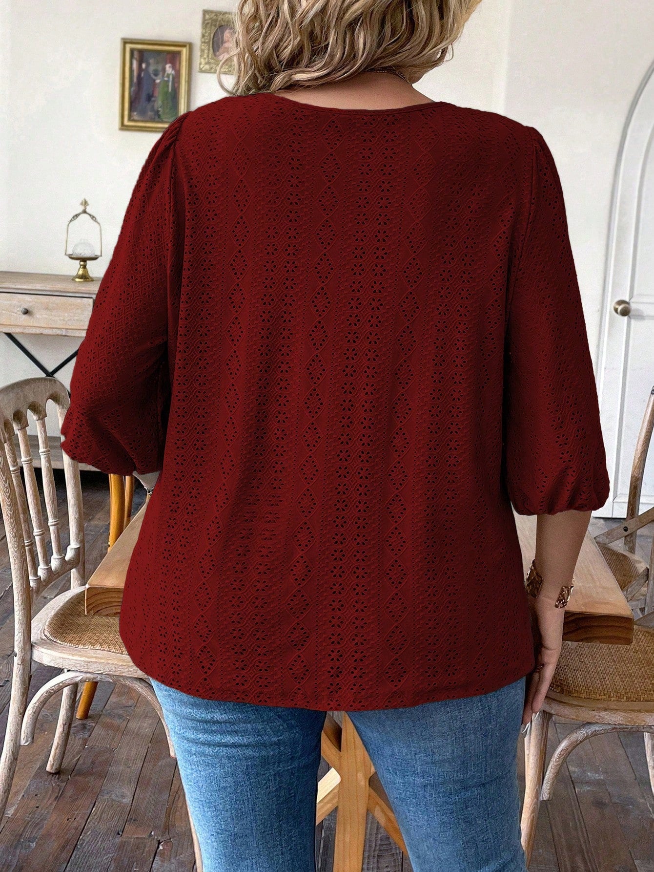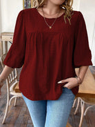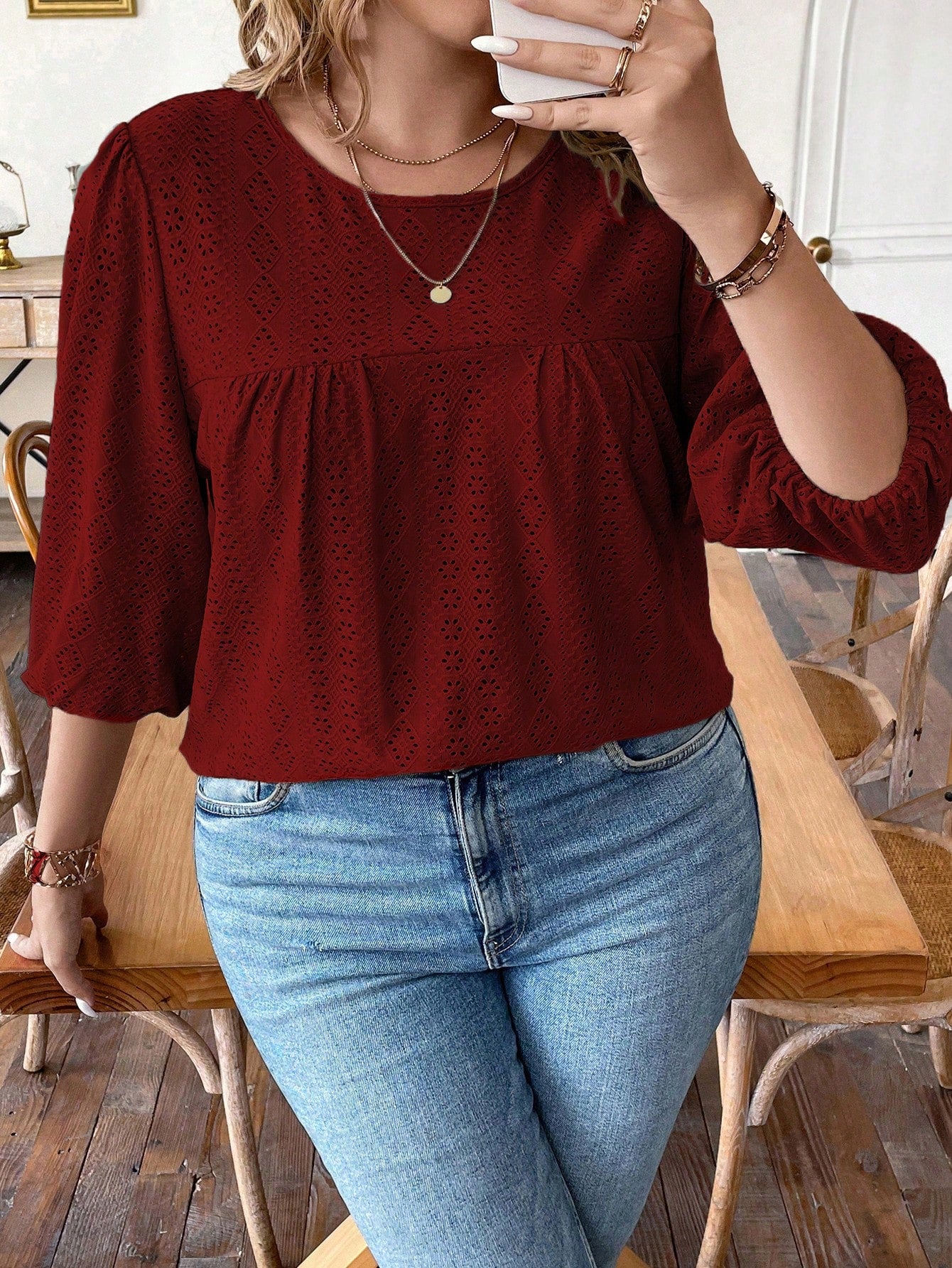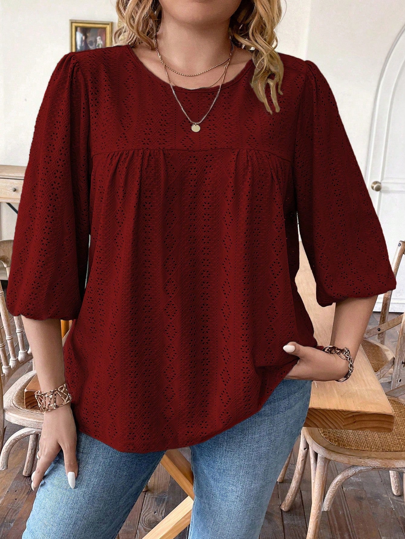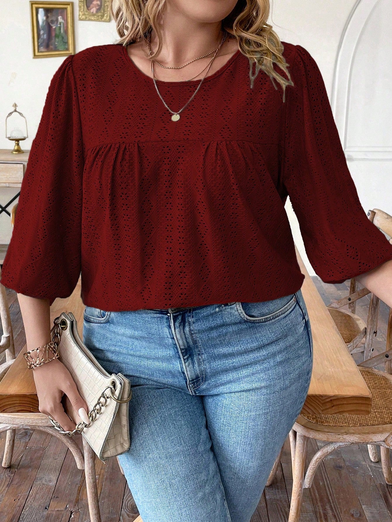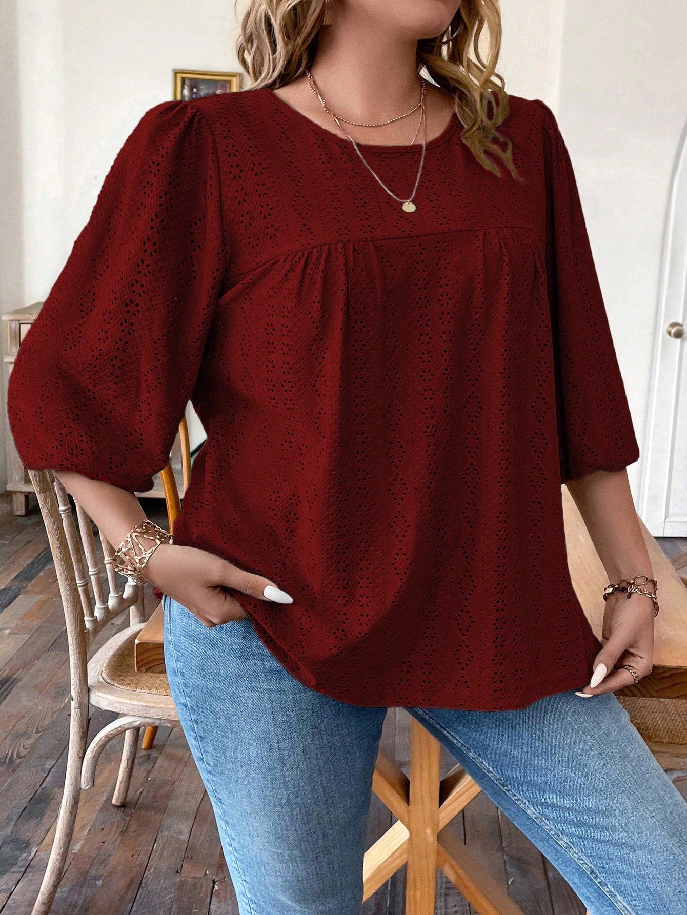 Women's Casual Knit Jacquard Round Neck Ruched Lantern Sleeve Loose T-Shirt, Summer