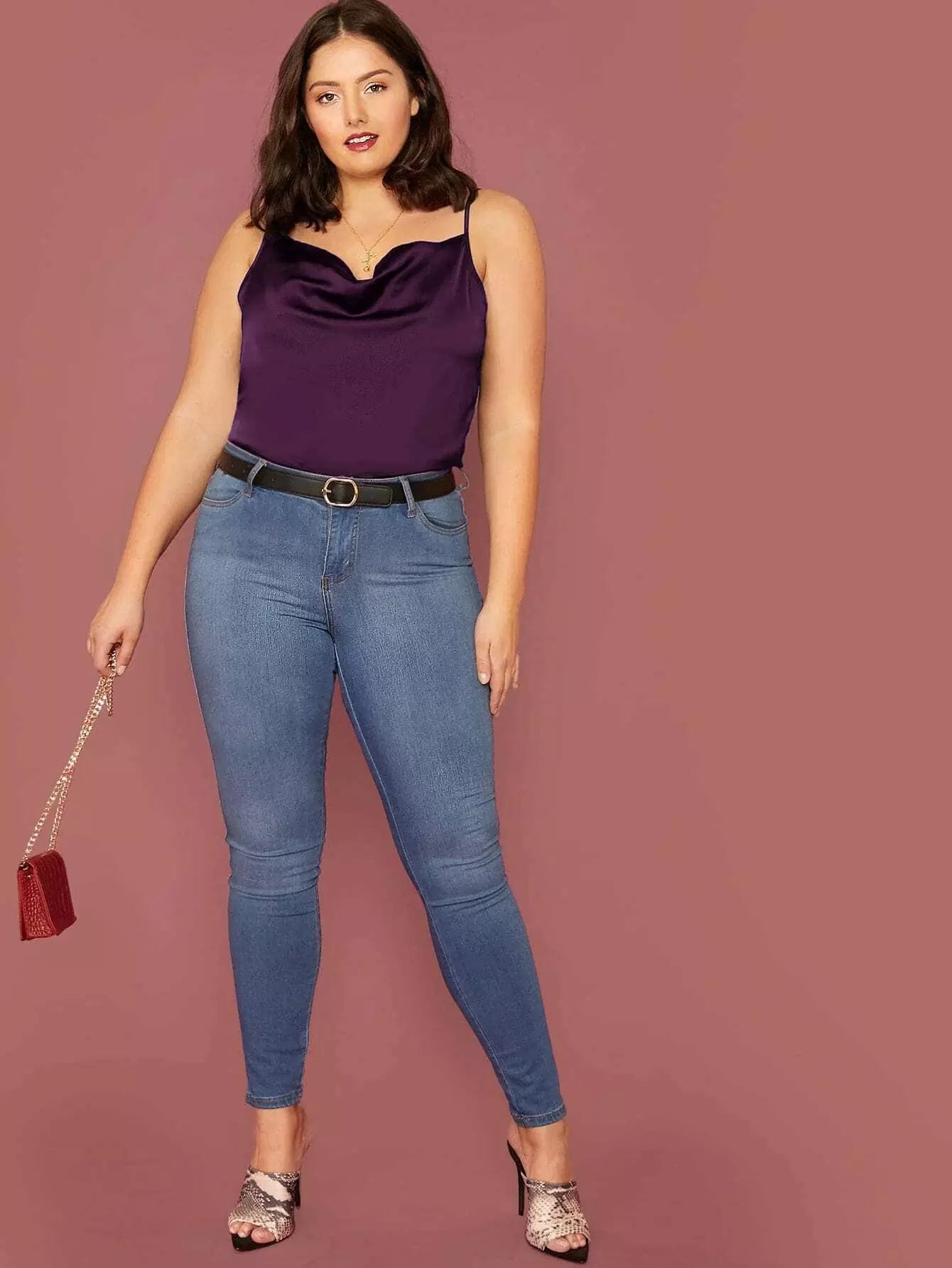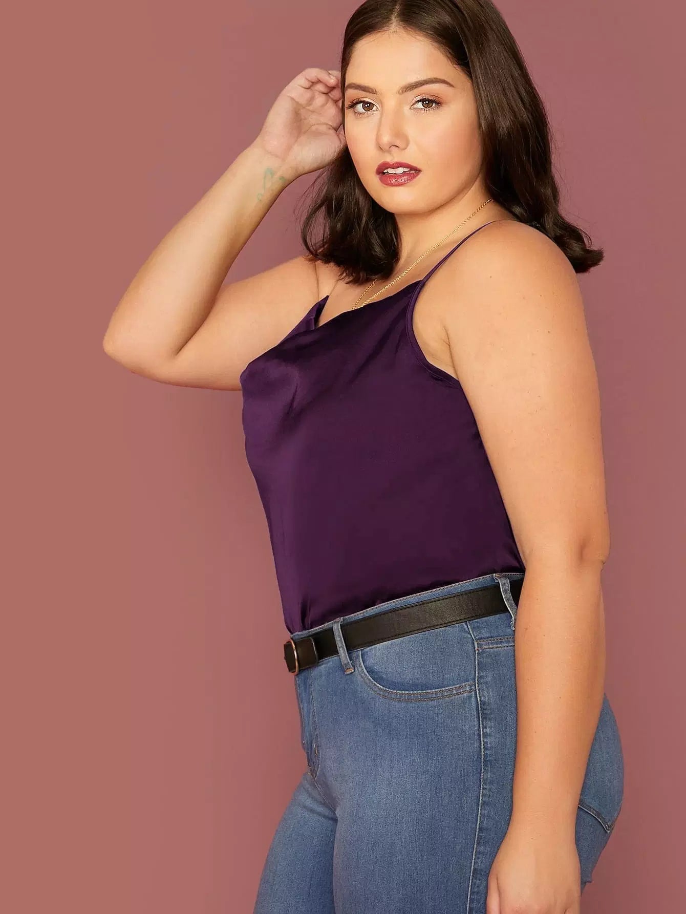 بلوزة ساتان كامي برقبة منسدلة من الساتان بلس