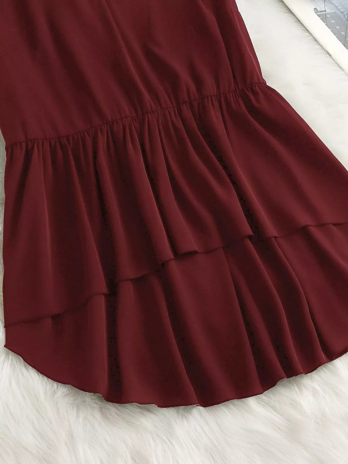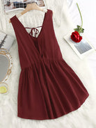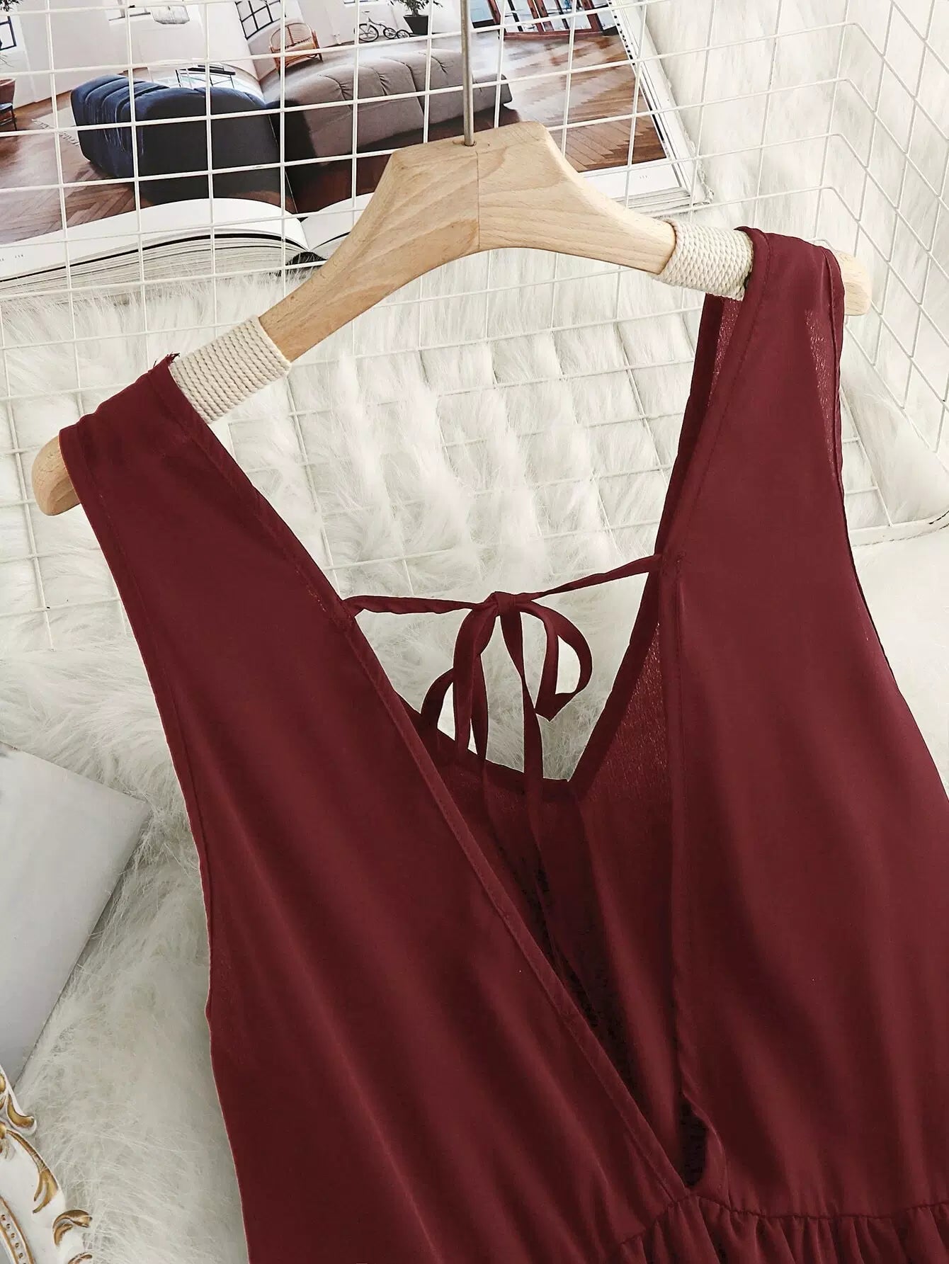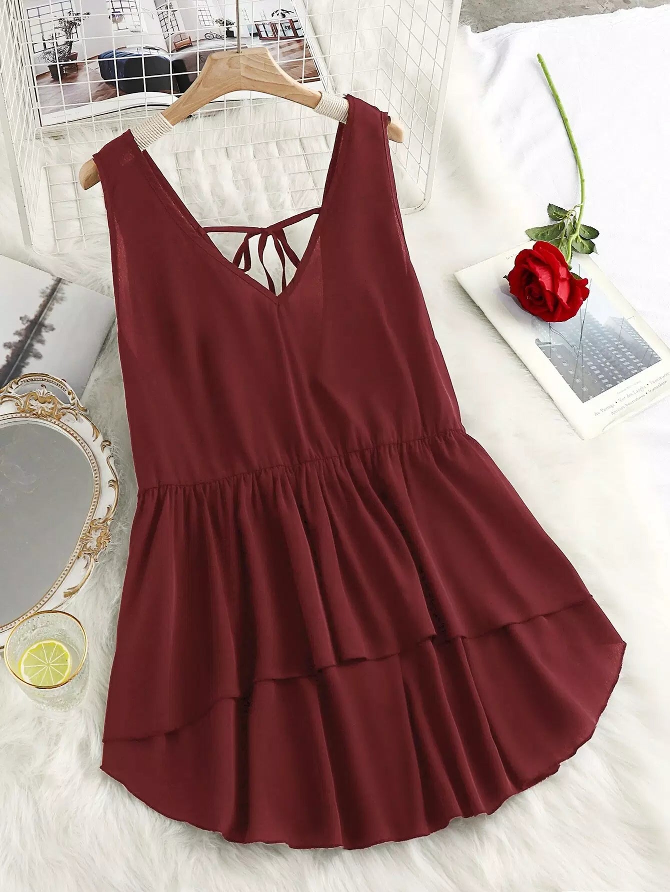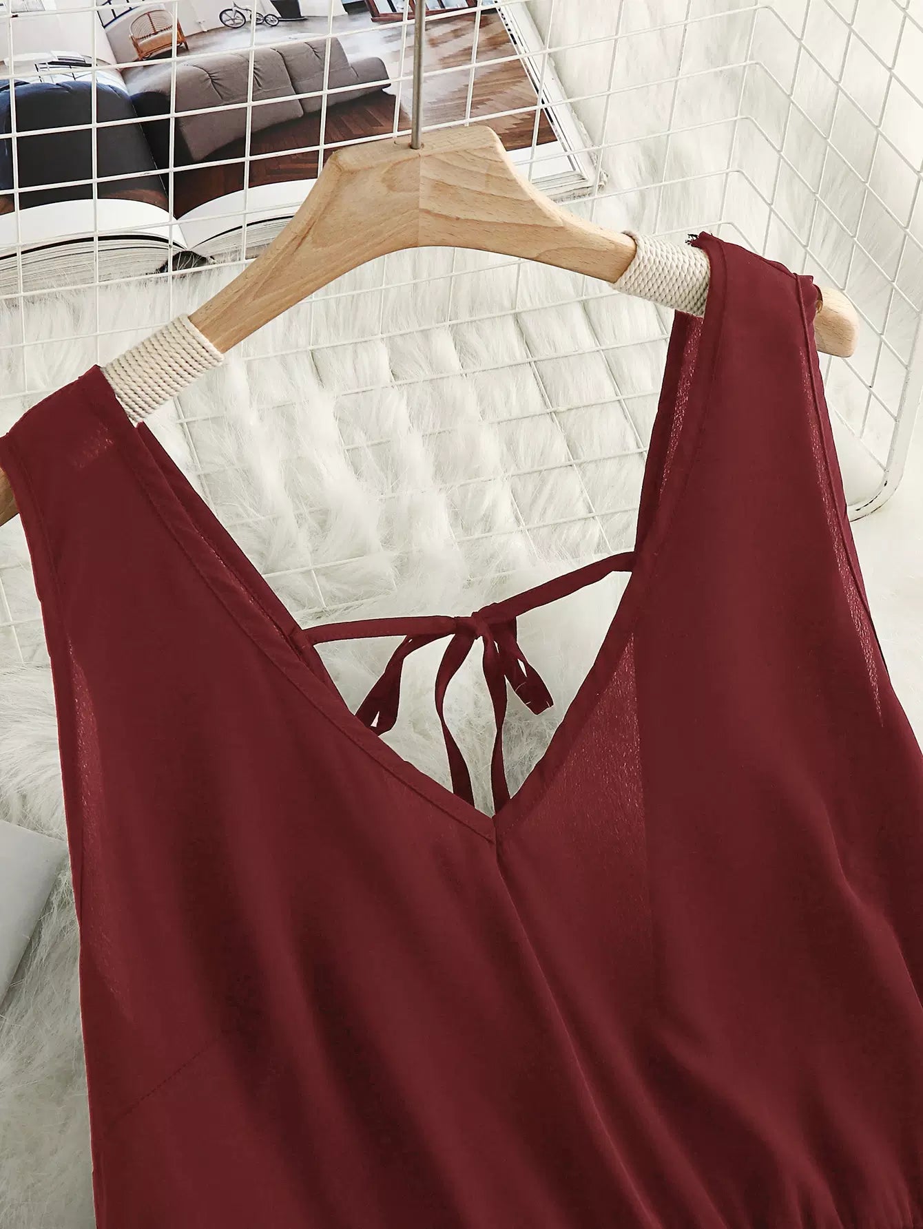 بلوزة بدون أكمام بياقة على شكل V بياقة على شكل V وربطة عنق على شكل حرف V وربطة ظهر كشكش