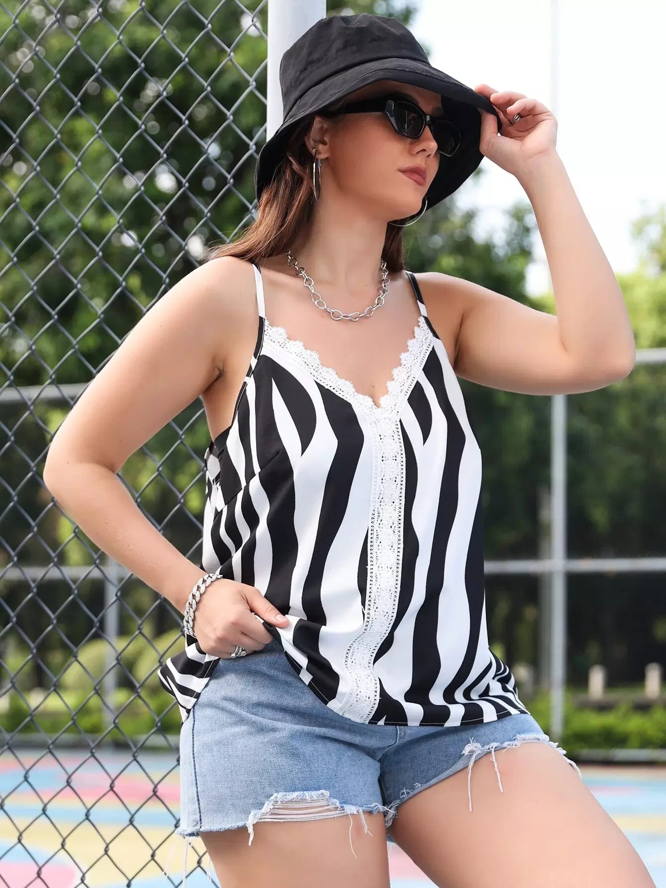 بلوزة قصيرة مخططة بدانتيل زائد زيبرا مزينة بالدانتيل