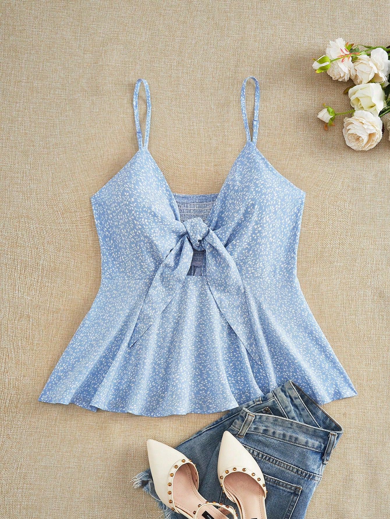 VCAY Plus Size Women's Boho Holiday Style Plants Print Front Tie Ruffle Hem Cami Top With Adjustable