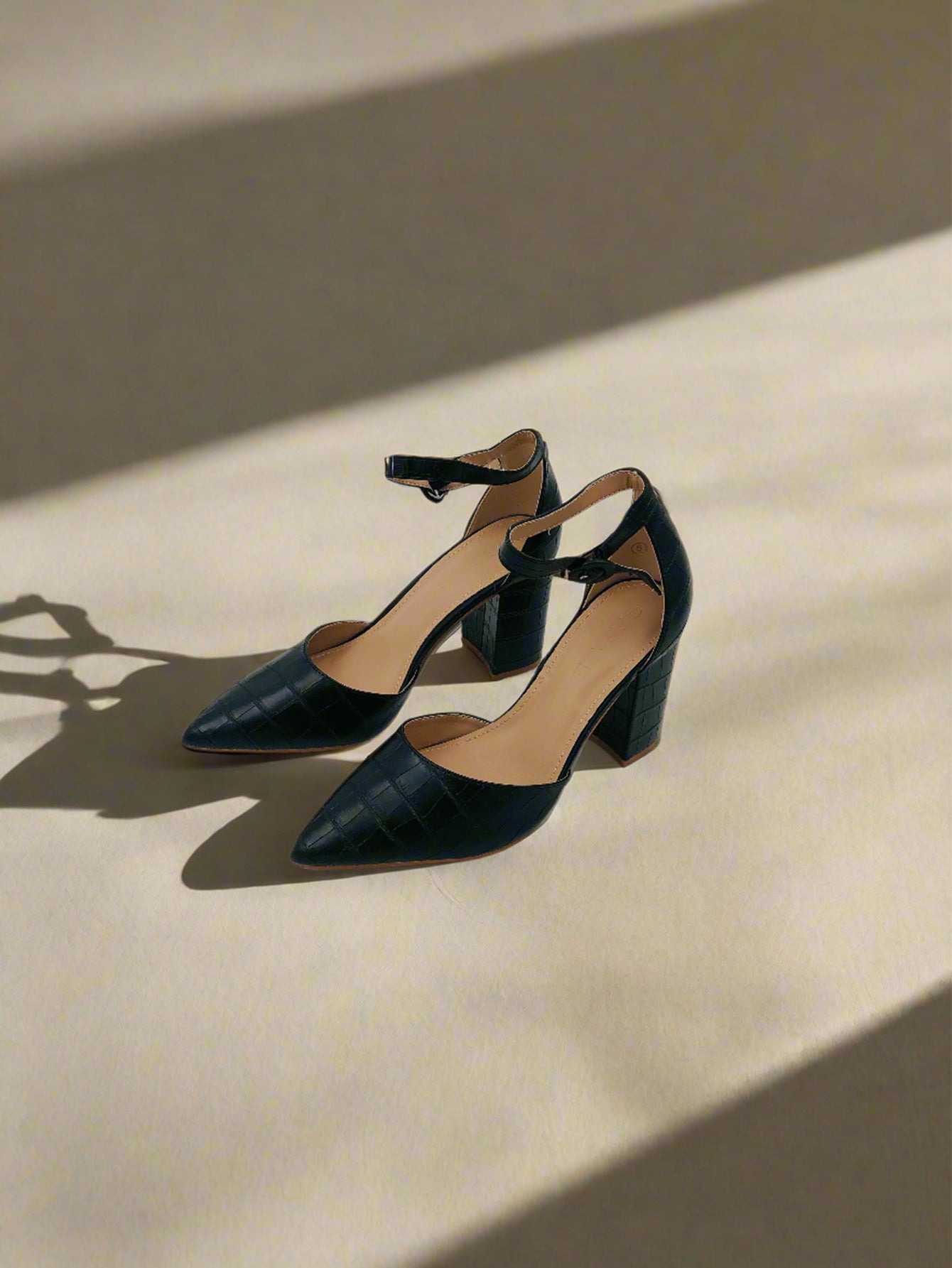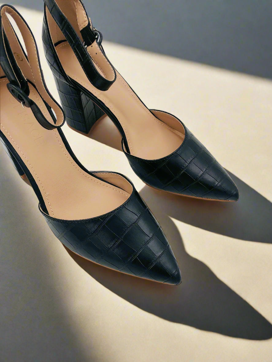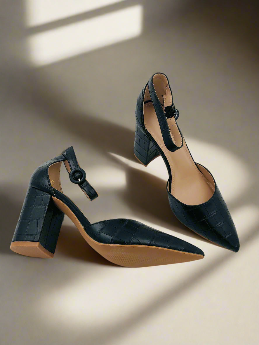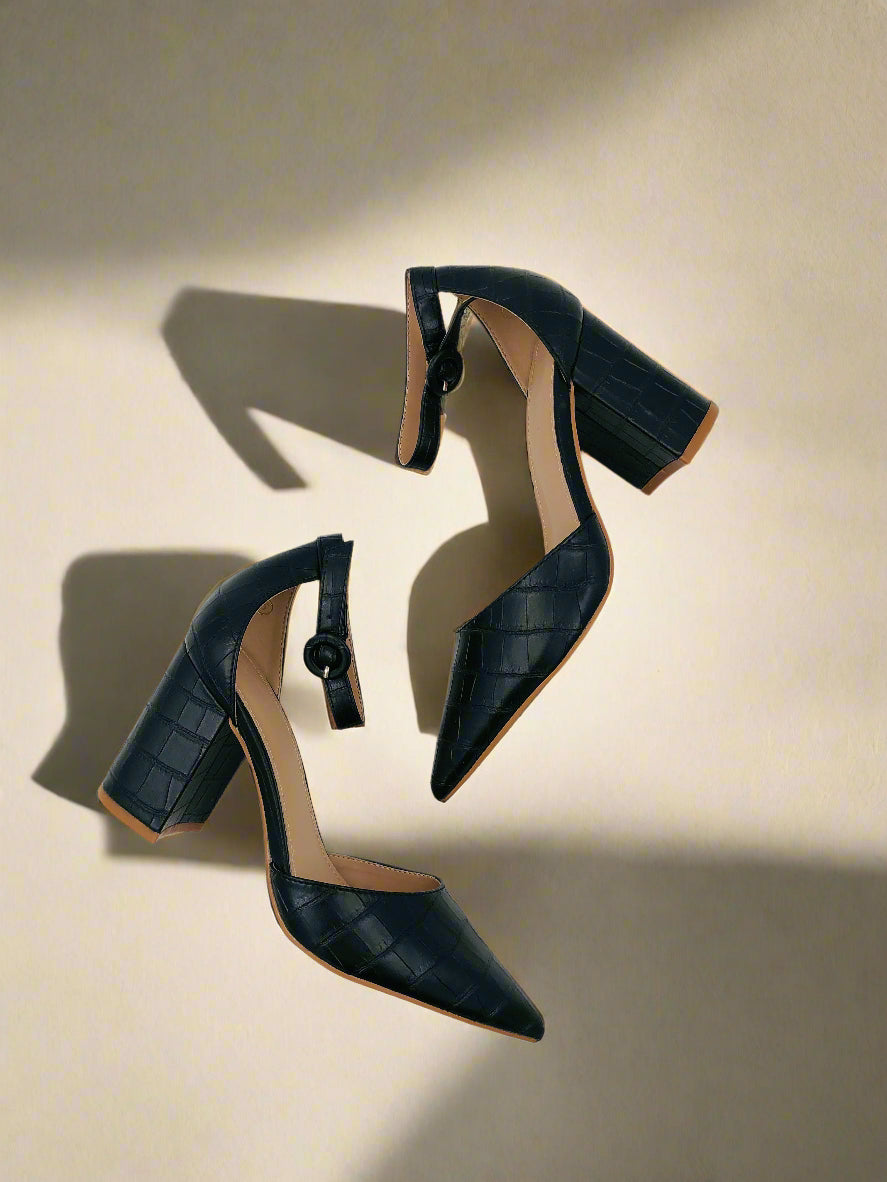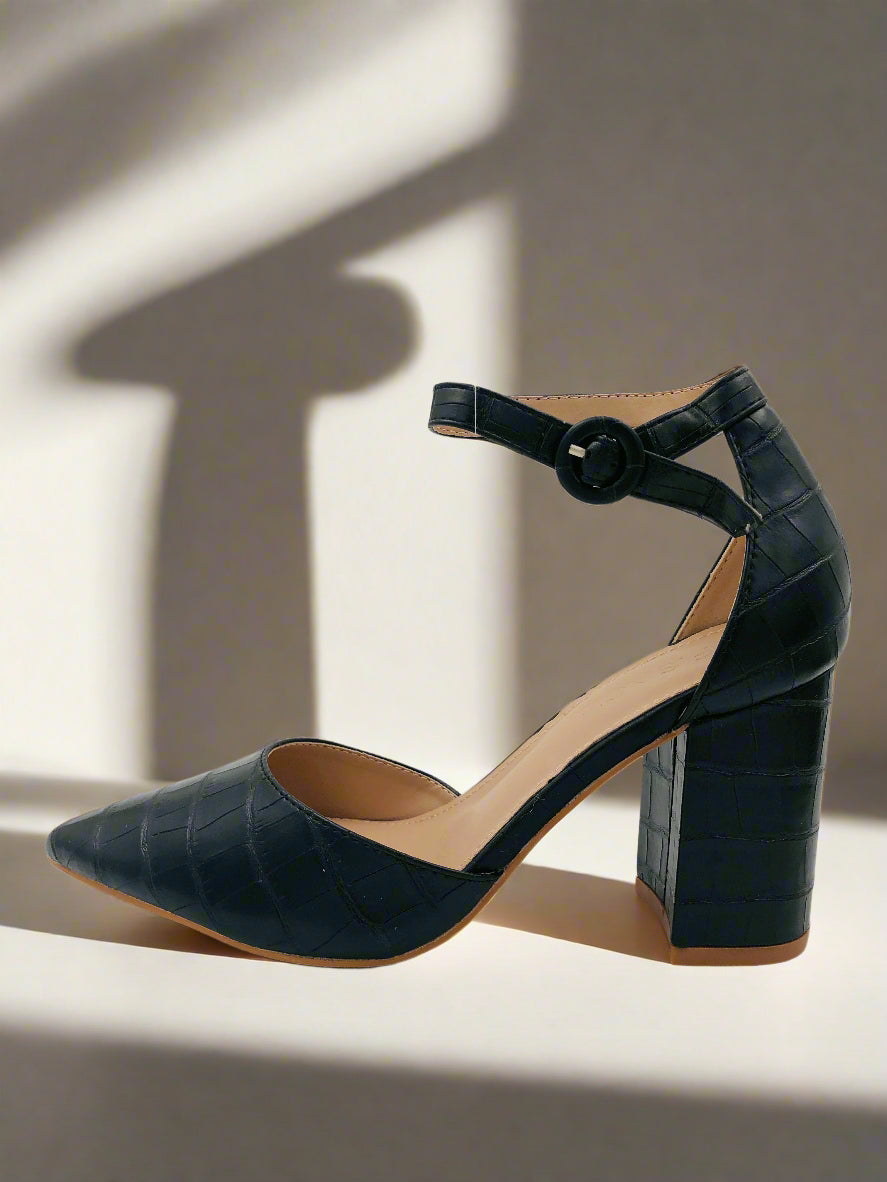 حذاء بومبس أنيق أسود للنساء بكعب سميك وعريض بارتفاع متوسط، مقدمة مدببة، حزام كاحل مع إغلاق بكباس، وتصميم منقوش بنمط جلد التمساح. مثالي للاستخدام اليومي والحفلات في فصلي الربيع والصيف.