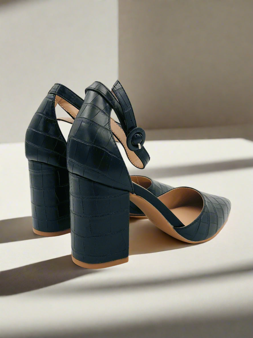 حذاء بومبس أسود مدبب بكعب سميك ونمط جلد التمساح