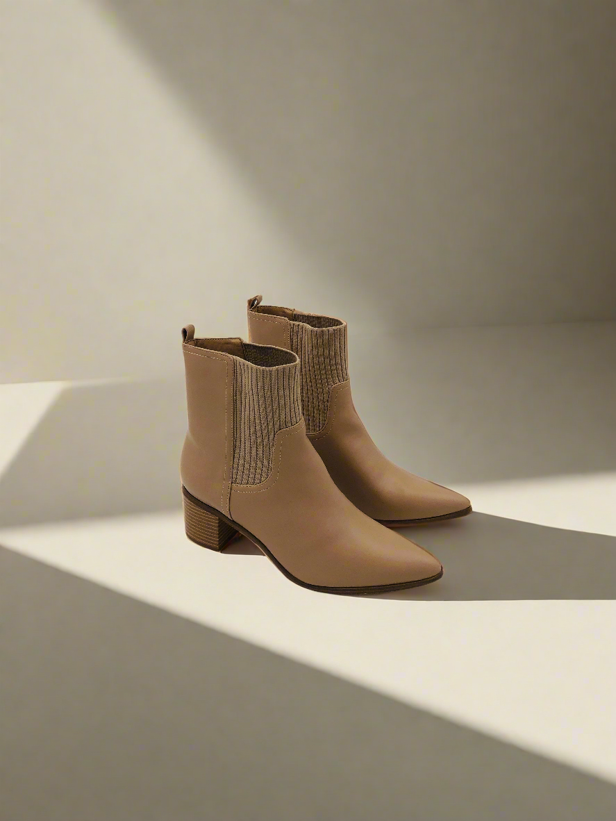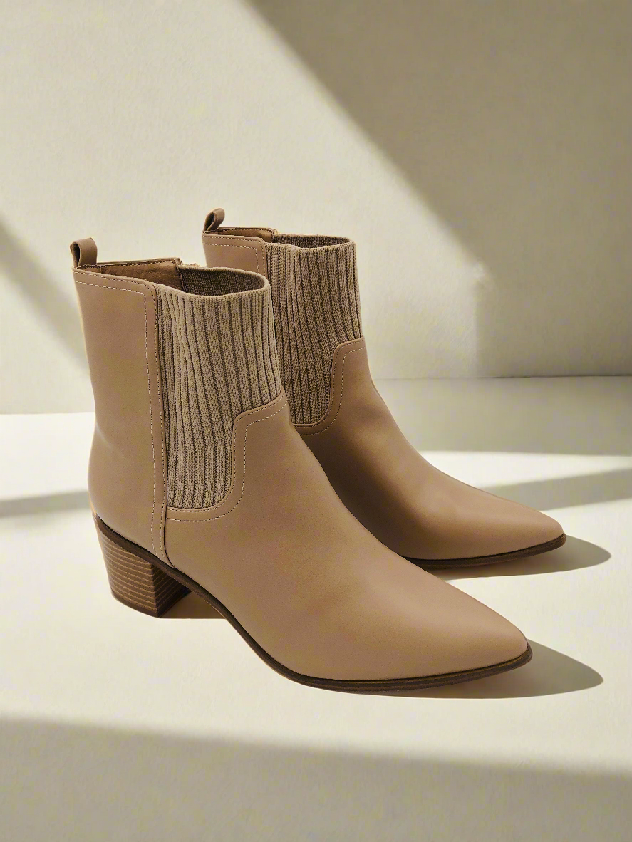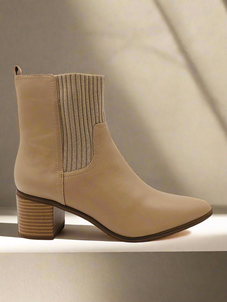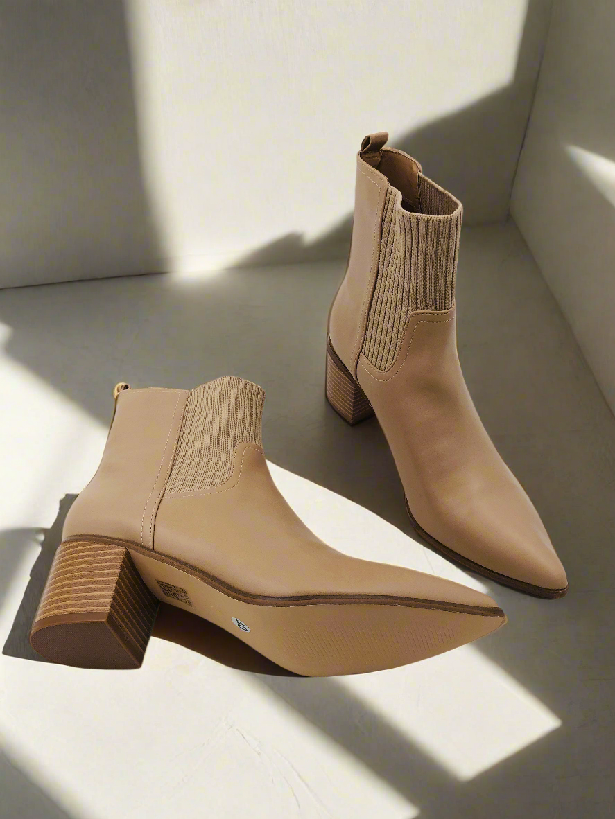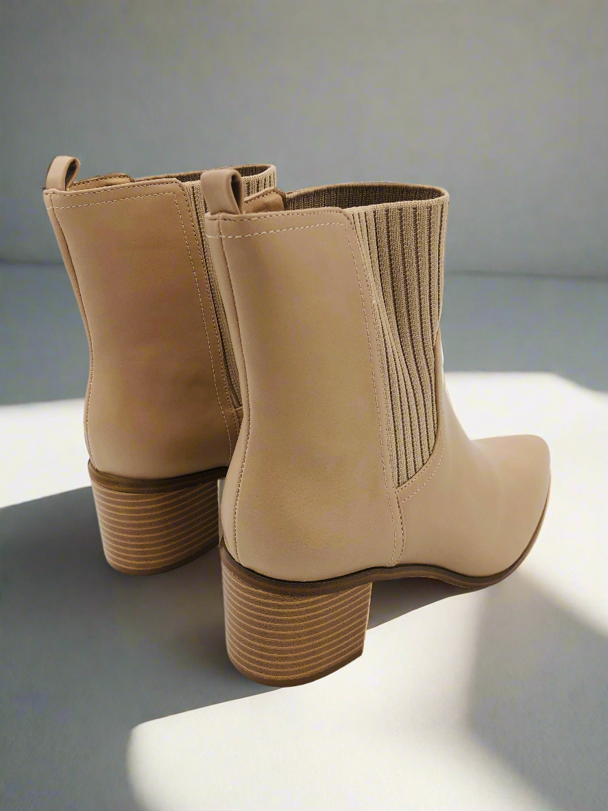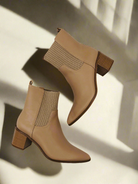 حذاء كاحل باللون النيود مريح للنساء بتصميم تشيلسي، يتميز بمقدمة لوزية، كعب بني سميك متوسط الارتفاع، وجوانب مرنة.