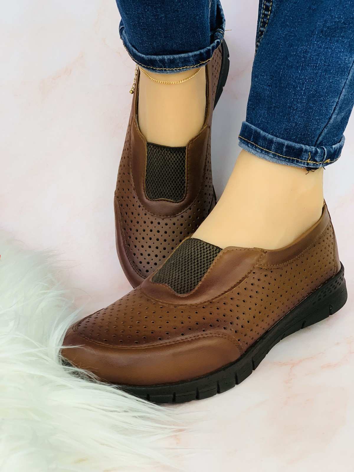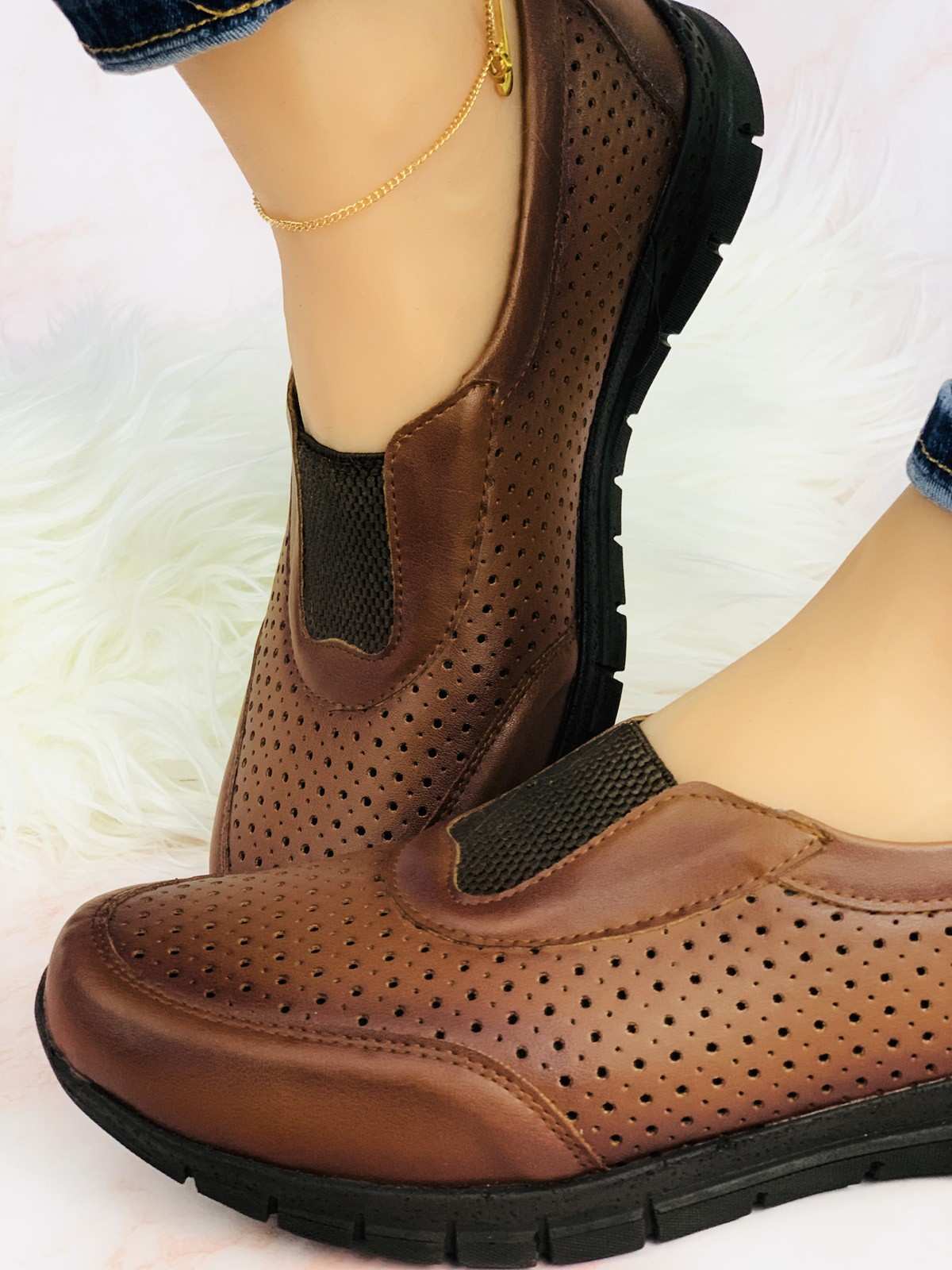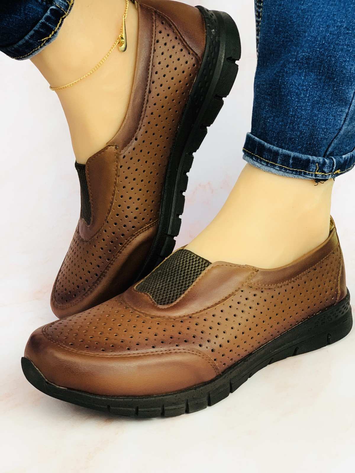 حذاء نسائي بني مريح بفتحات مزخرفة وأقدام قابلة للتنفس، كعب طبي منخفض