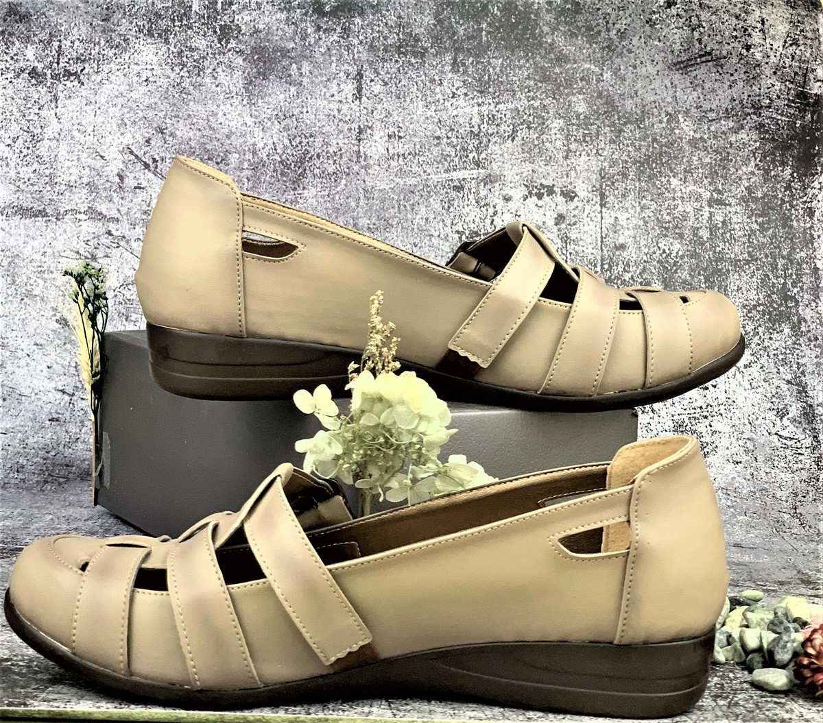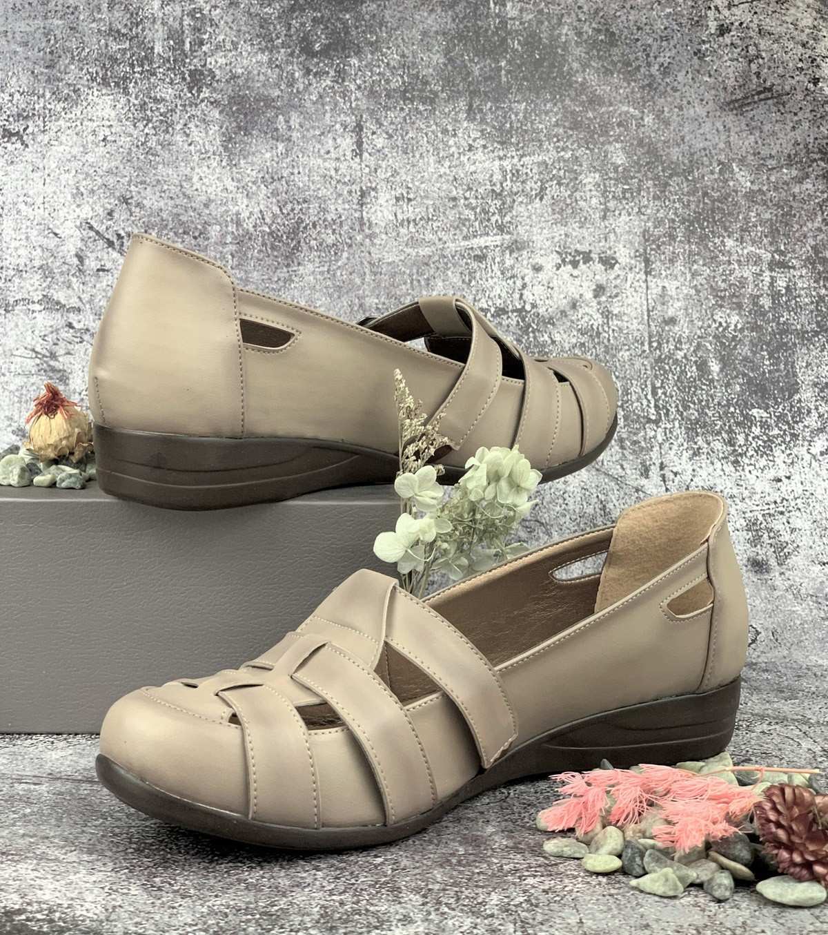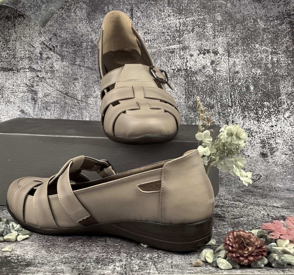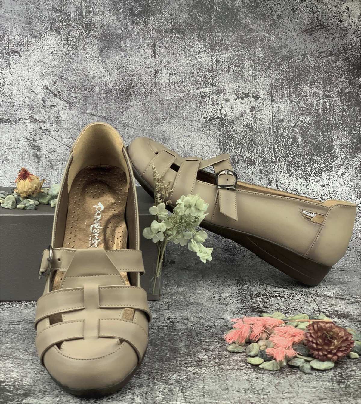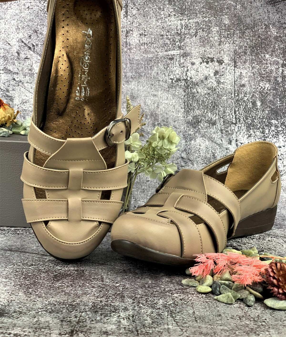 حذاء نسائي مفتوح مريح بني فاتح بحزام جلد، كعب طبي متوسط