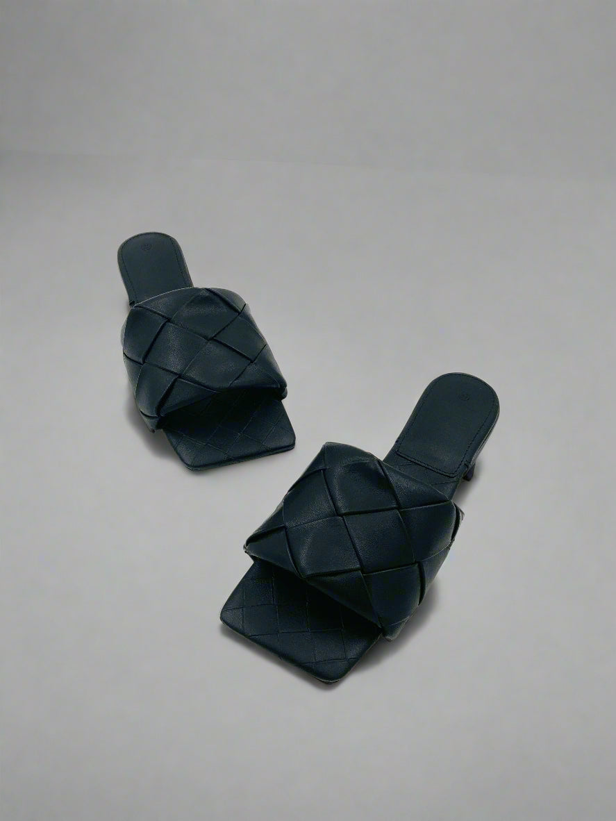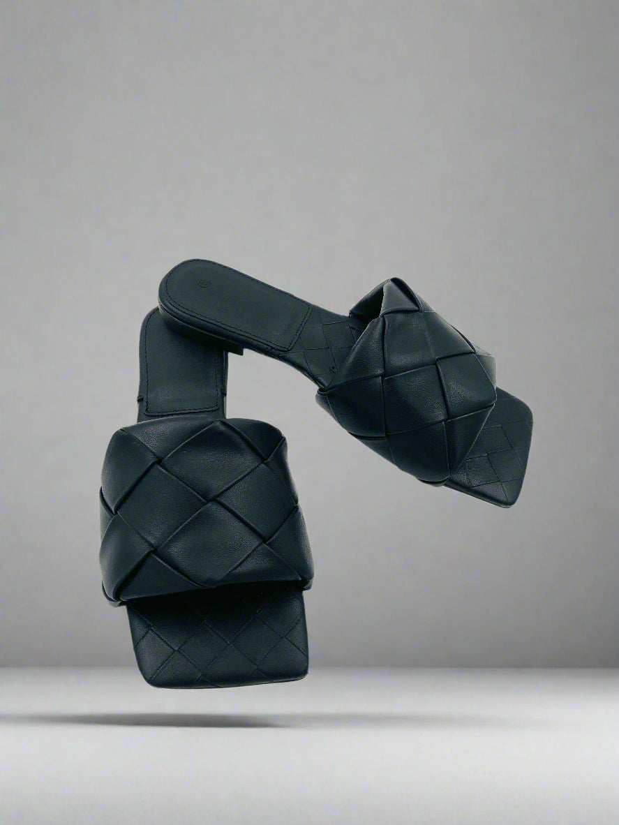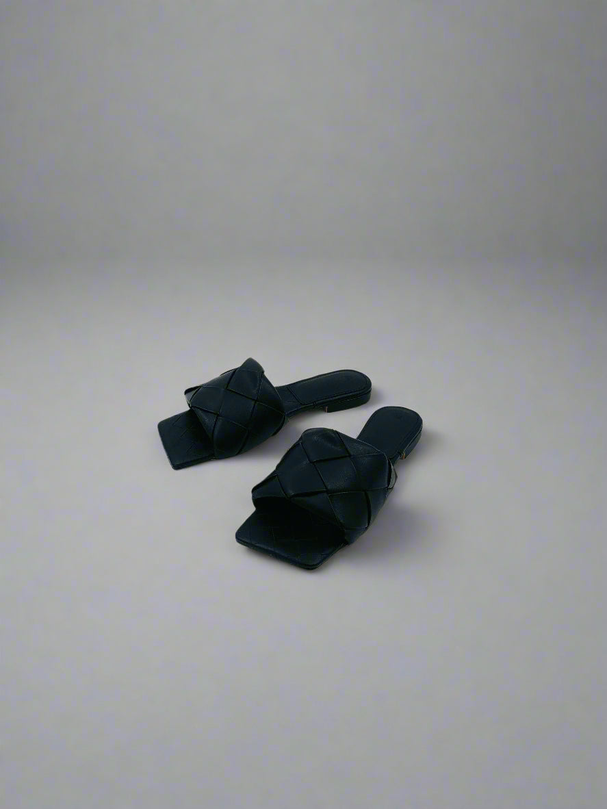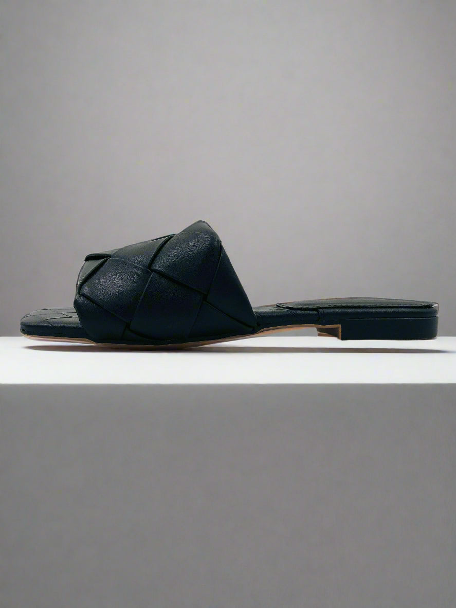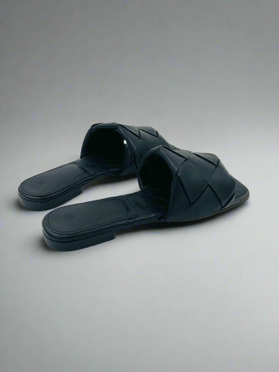 نعال مسطحة مفتوحة من الأمام باللون الأسود مخصصة للخارج مع شريط واحد واحد منسوج متشابك ومقدمة مربعة، ترفع أي إطلالة بسيطة وتمنحها لمسة أناقة فوراً.