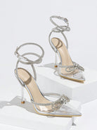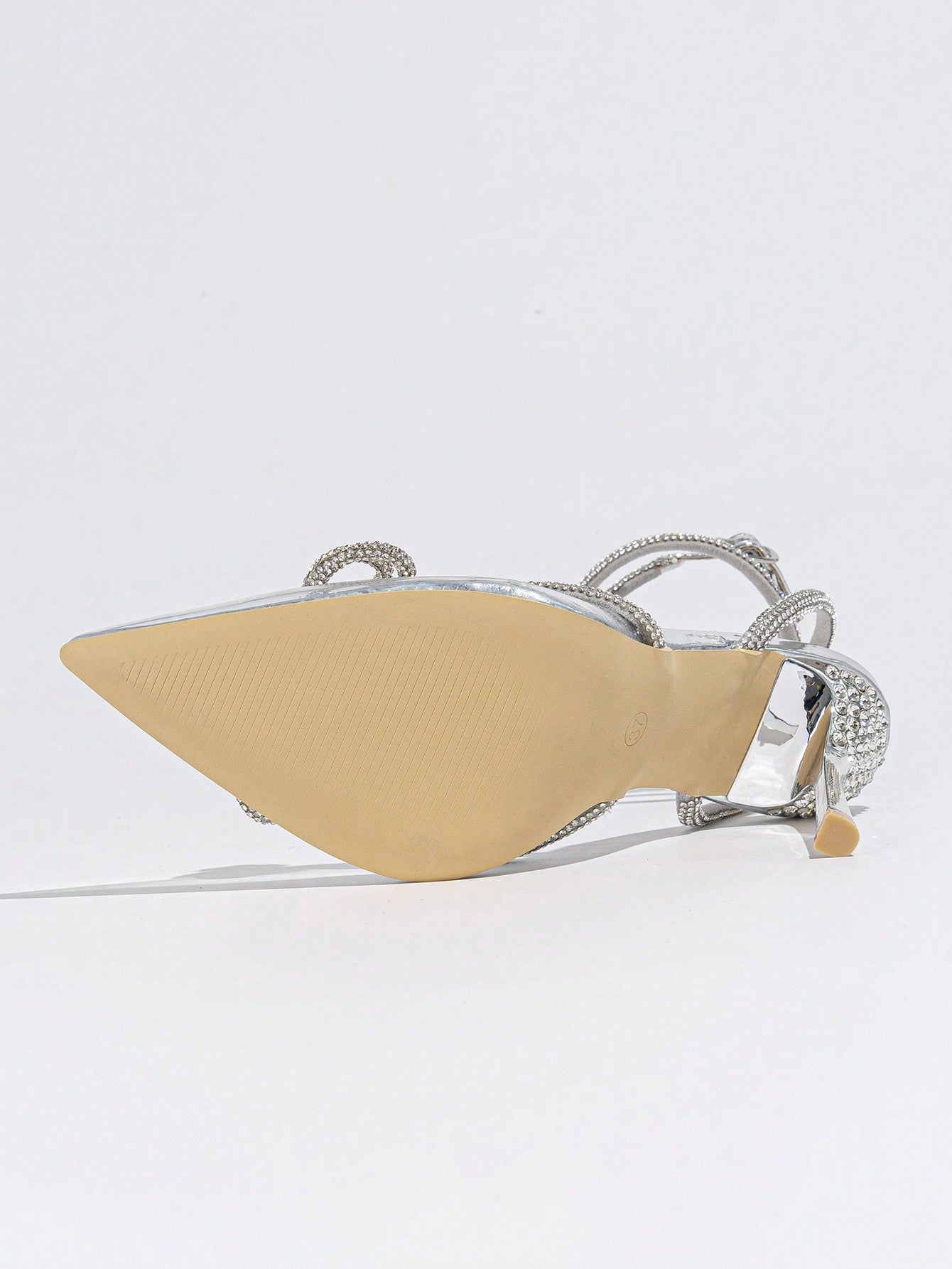 صندل نسائي شفاف فضي اللون مع رباط على شكل ربطة عنق وكعب عالي ومقدمة مدببة وكعب عالي مرصع بأحجار الراين لحفلات الزفاف