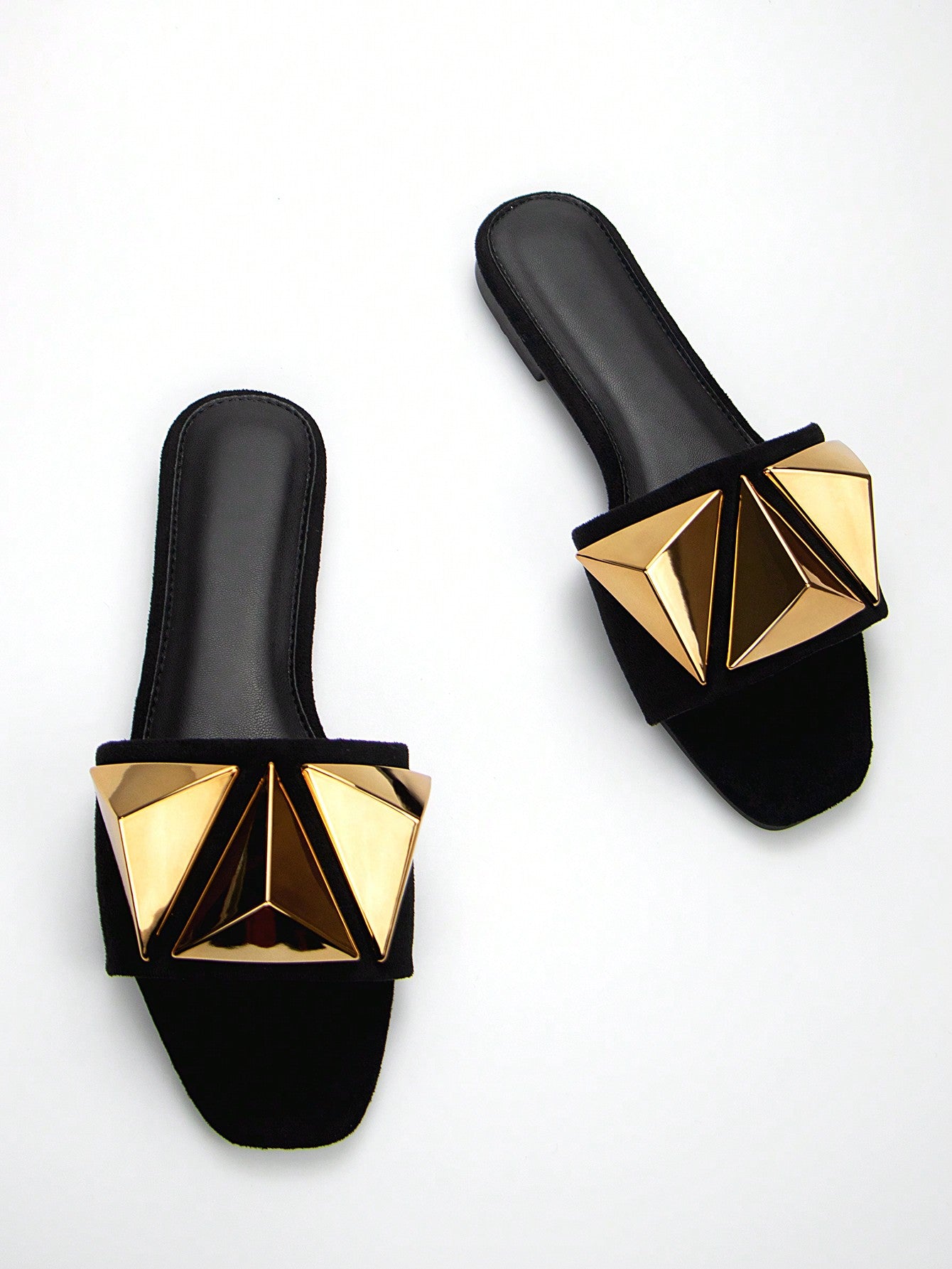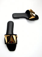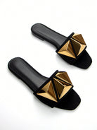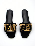 women Women's Elegant Gold Metal Buckle Decor Black Suede Square Toe Fashionable And Comfortable Flat Sandals