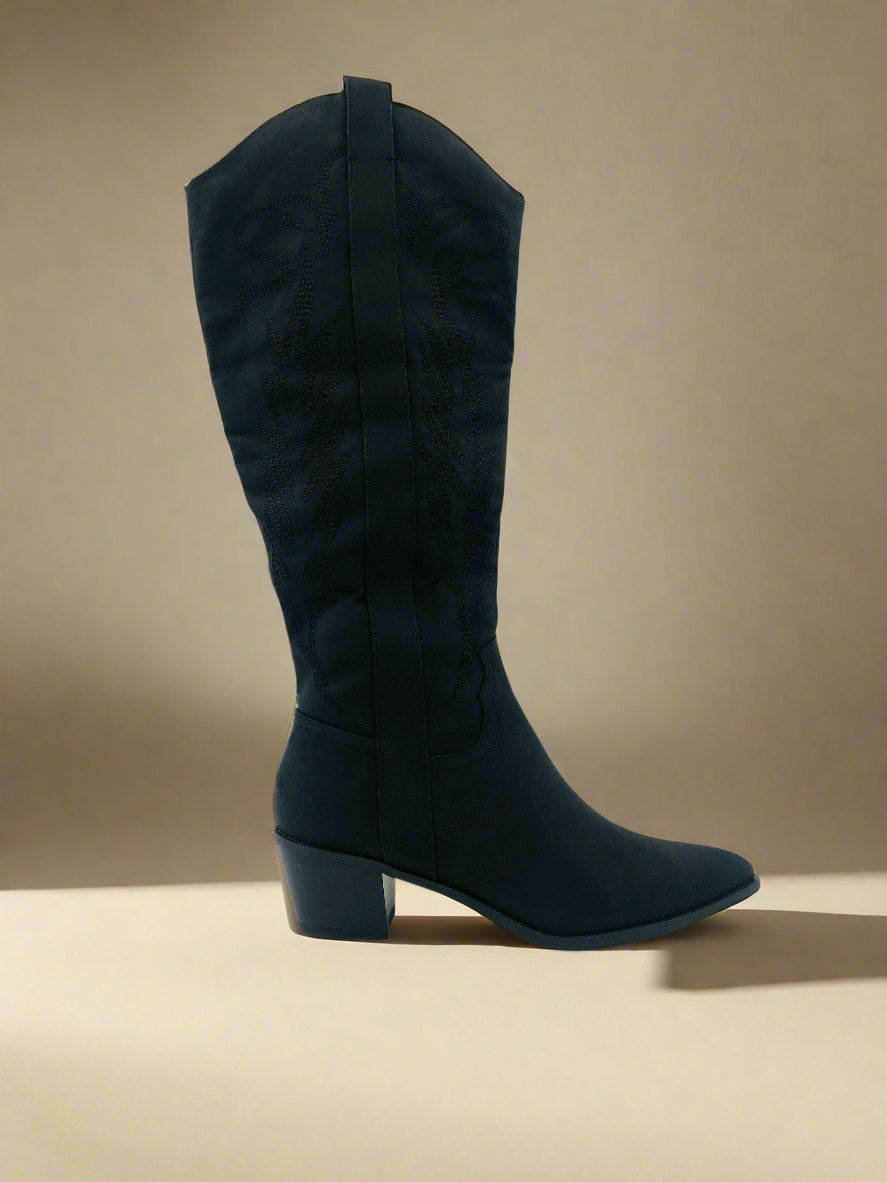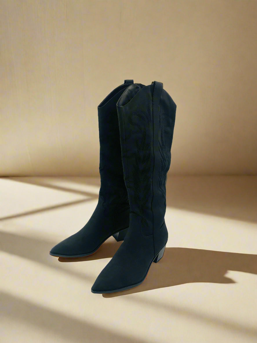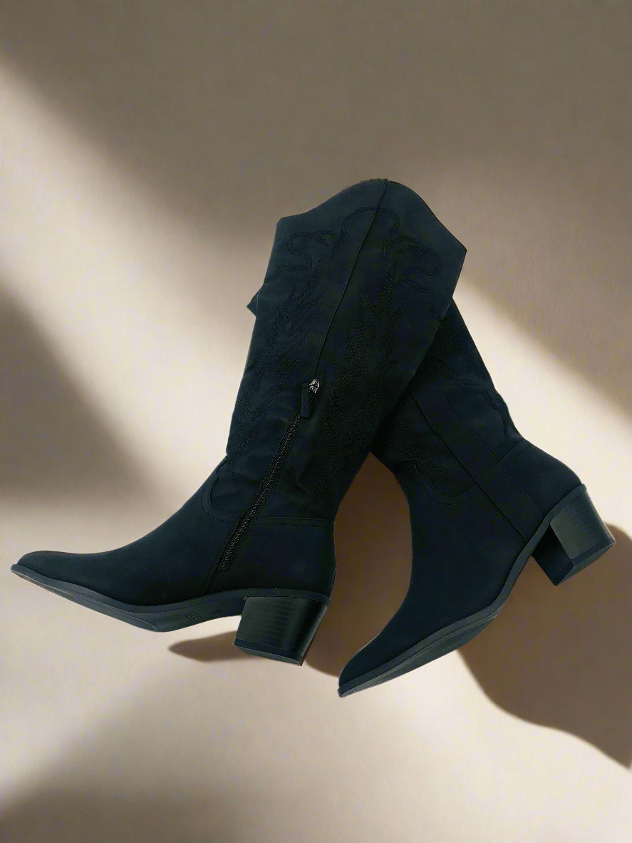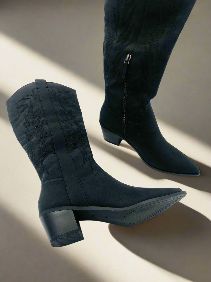 جزمة باللون الأسود متوسطة الطول بمقدمة لوزية و بكعب عريض وسحاب جانبي وزخارف أنيقة، مثالية للإطلالات الكاجوال.