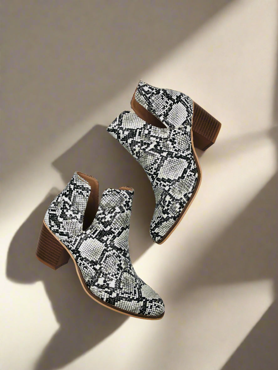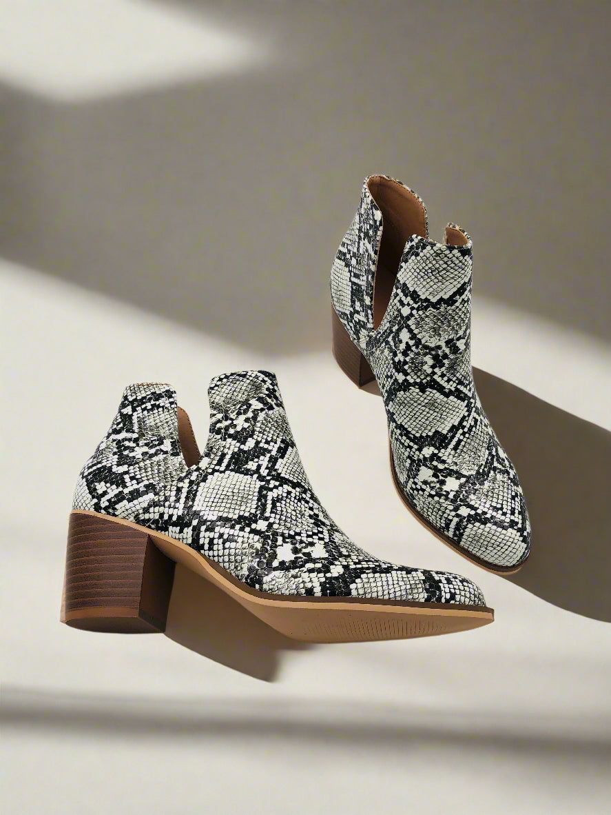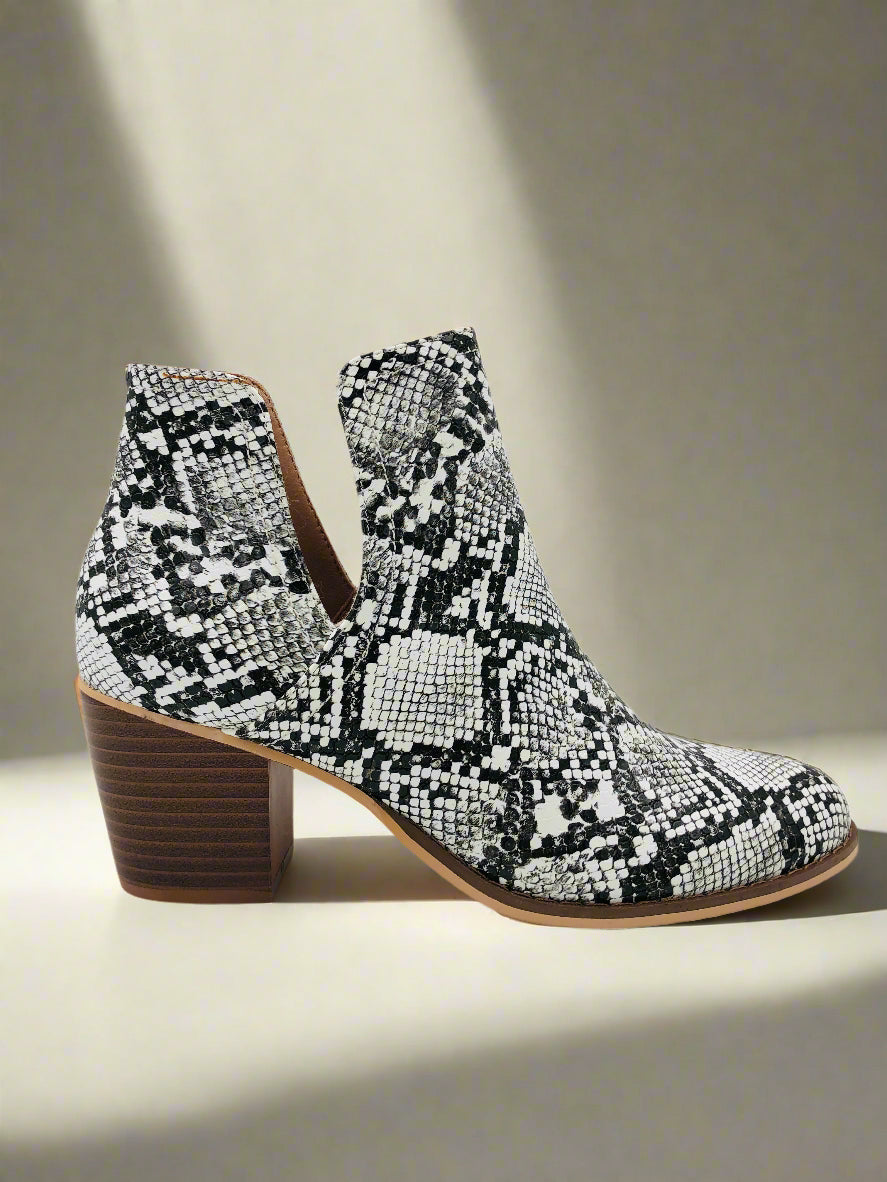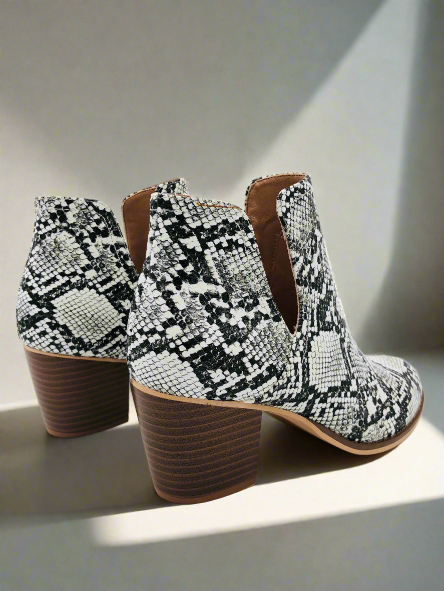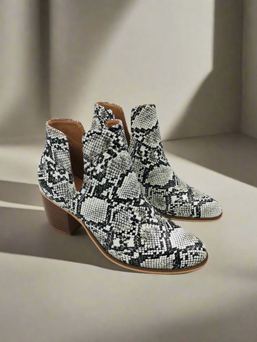 حذاء تشيلسي للكاحل باللونين الأسود والأبيض بتصميم أنيق وعملي، يتميز بفتحة جانبية وكعب بني متوسط الارتفاع ونقشة جلد الأفعى. الخيار المثالي للإطلالات اليومية، يوفر الراحة والأناقة، مما يجعله خياراً مثالياً للمرأة العصرية.