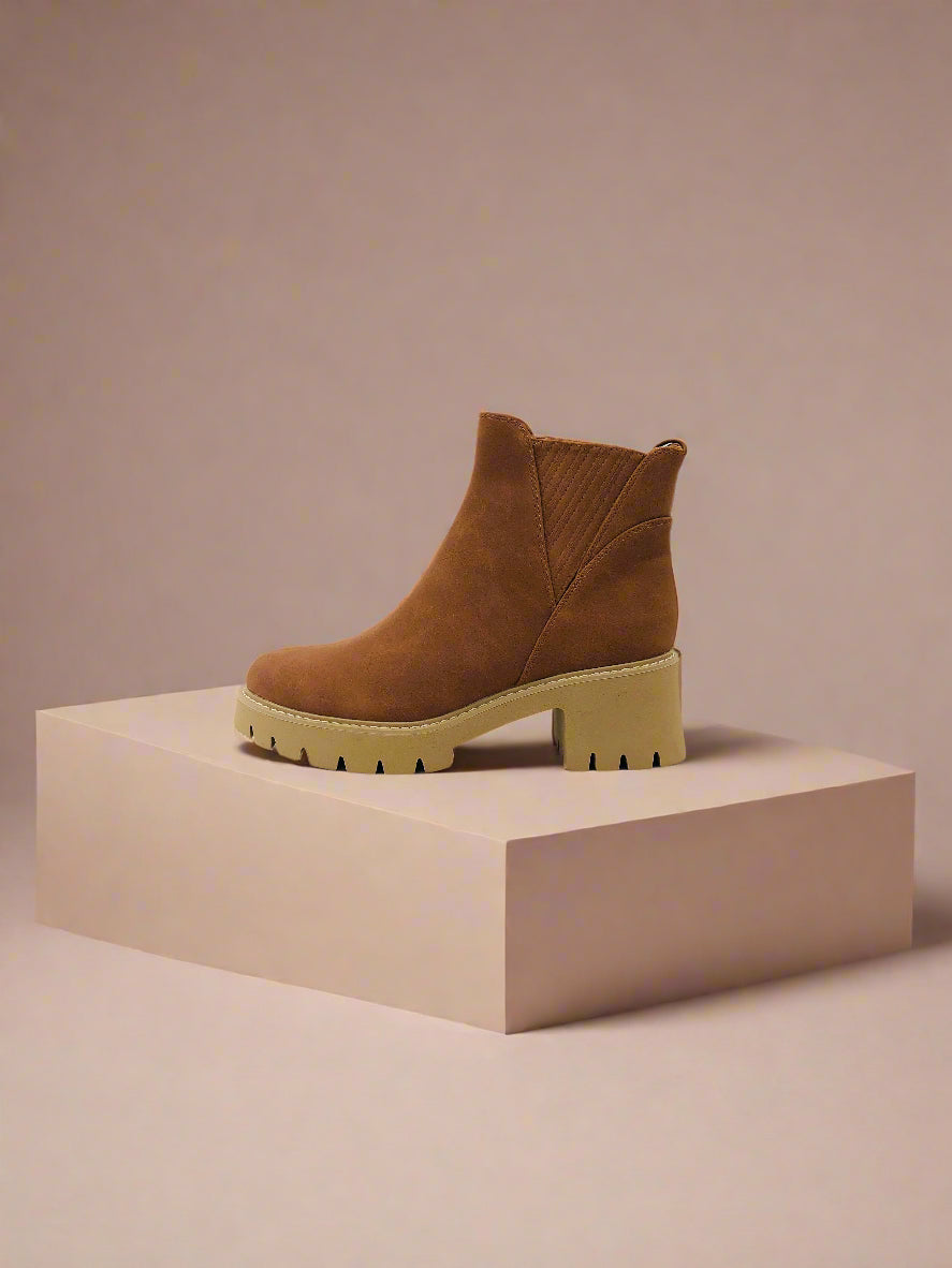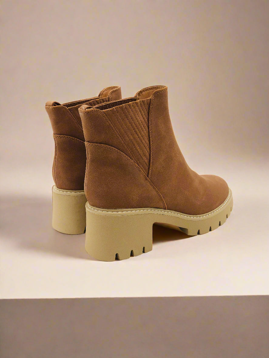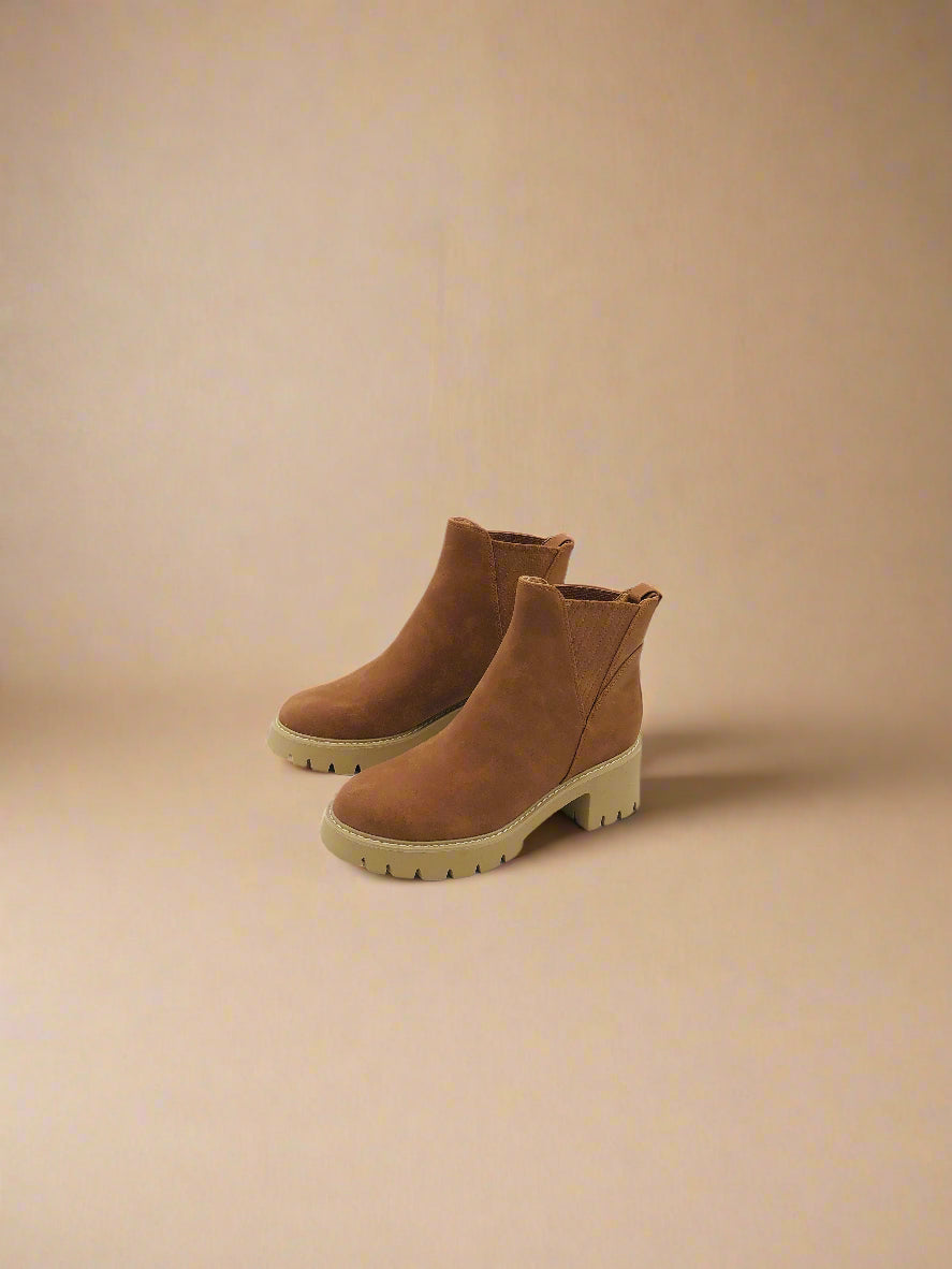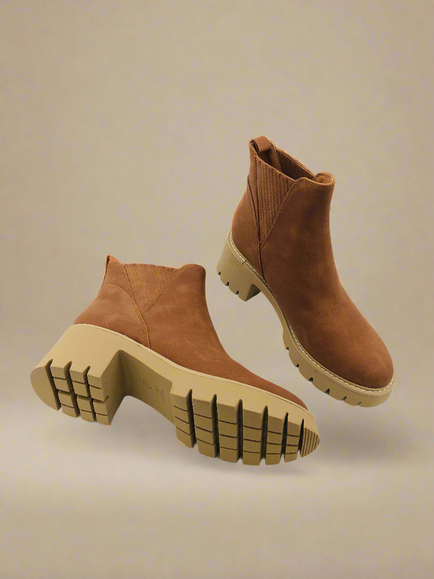 حذاء تشيلسي بني مع جوانب مرنة، مقدمة مدورة وكعب سميك وعريض، مما يجعله سهل الارتداء ومريحاً.
