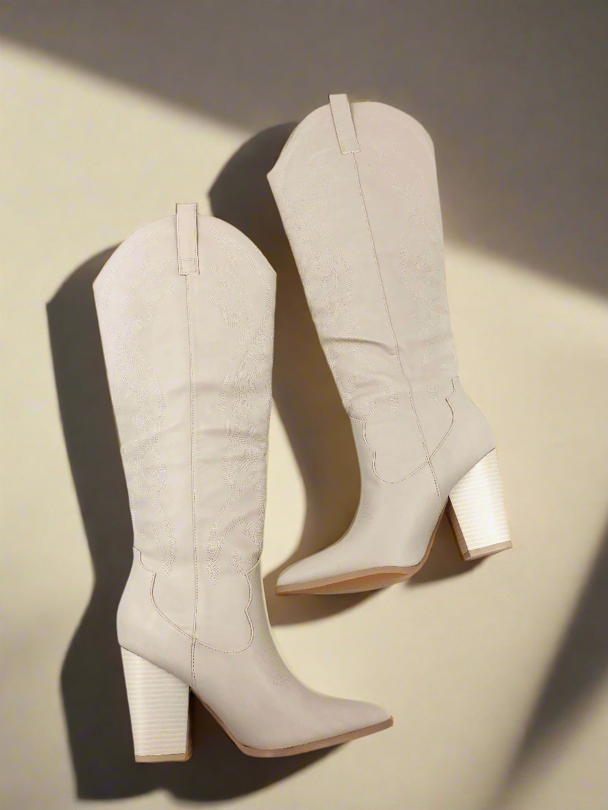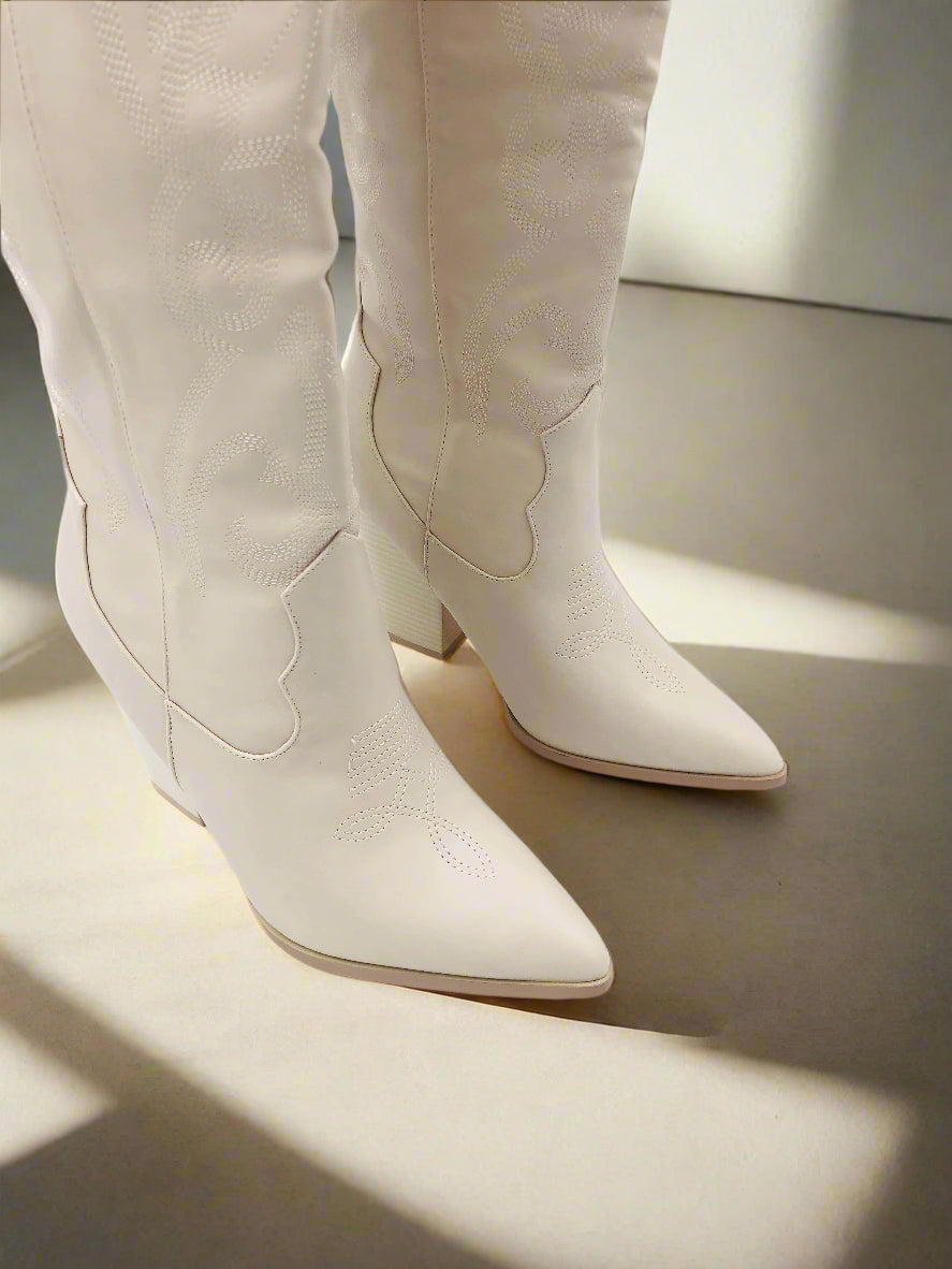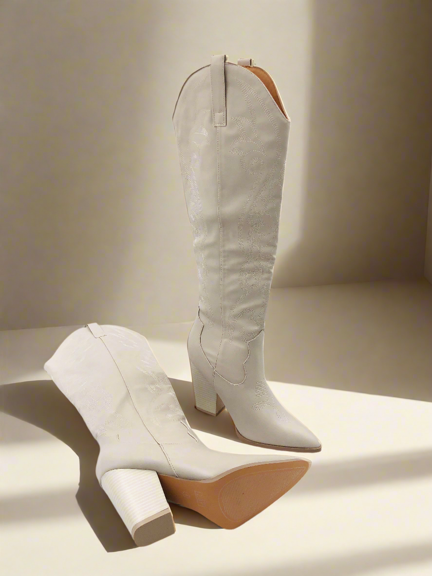جزمة باللون الأبيض مدببة بطول يصل إلى الركبة و بكعب عريض مربع وسحاب جانبي وزخارف أنيقة، مثالية للإطلالات الكاجوال. تتميز هذه الجزمة بتصميم أنيق وعصري.