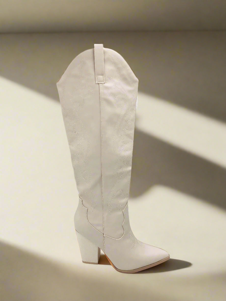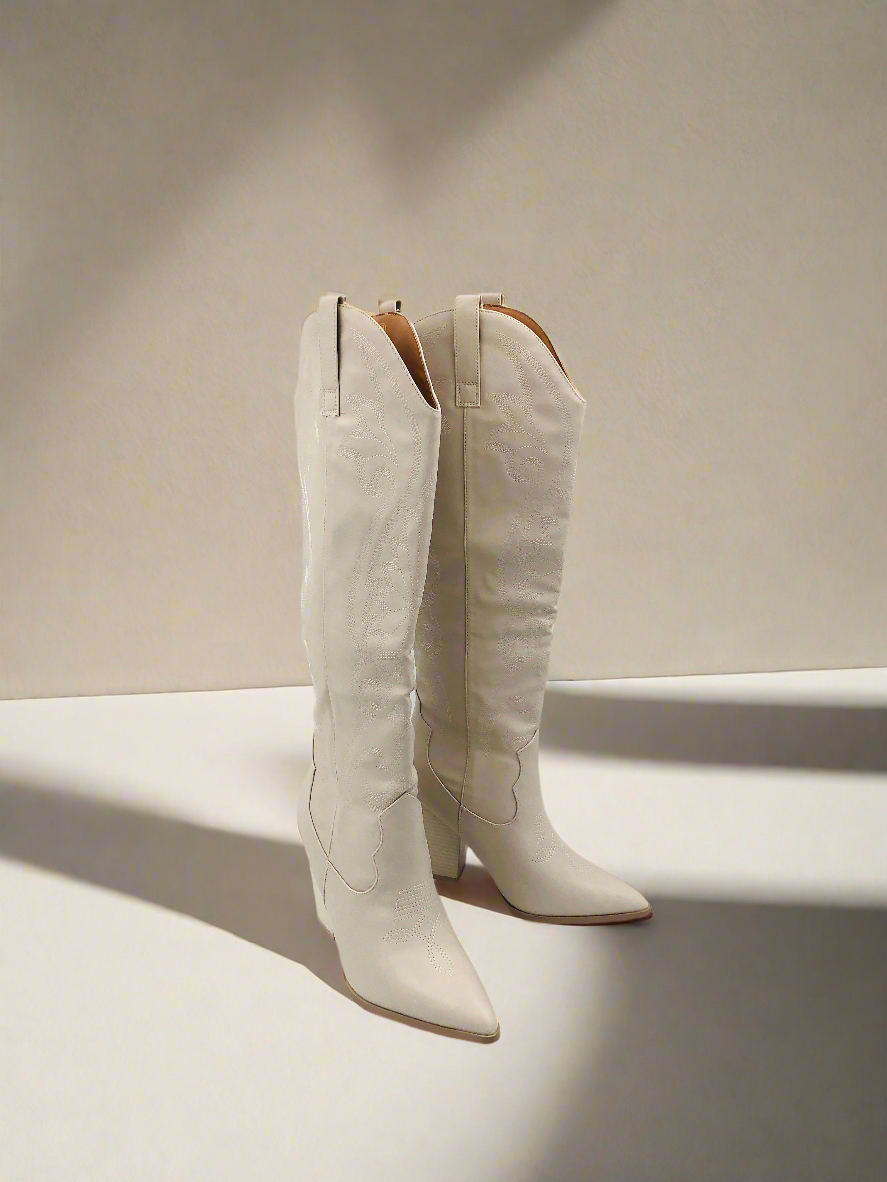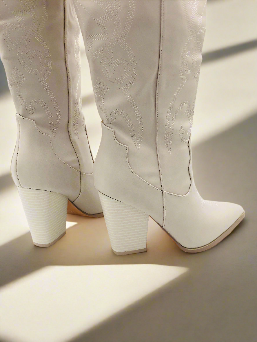 جزمة بيضاء مدببة بطول يصل إلى الركبة
